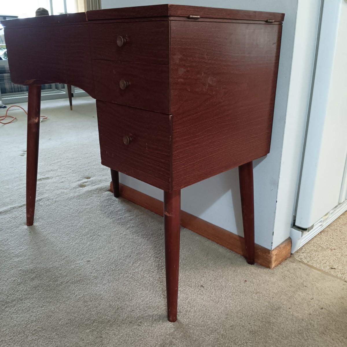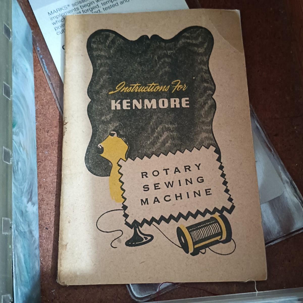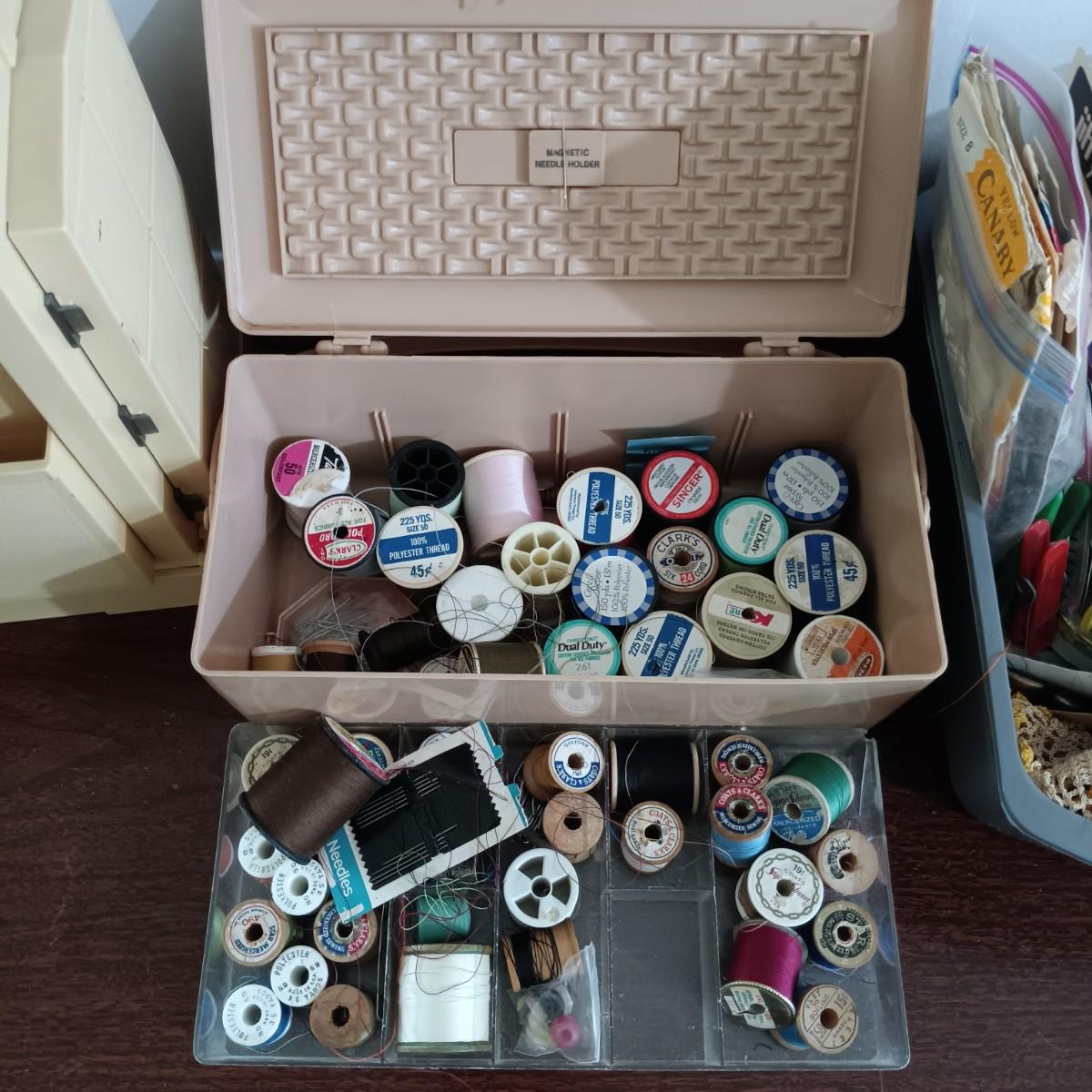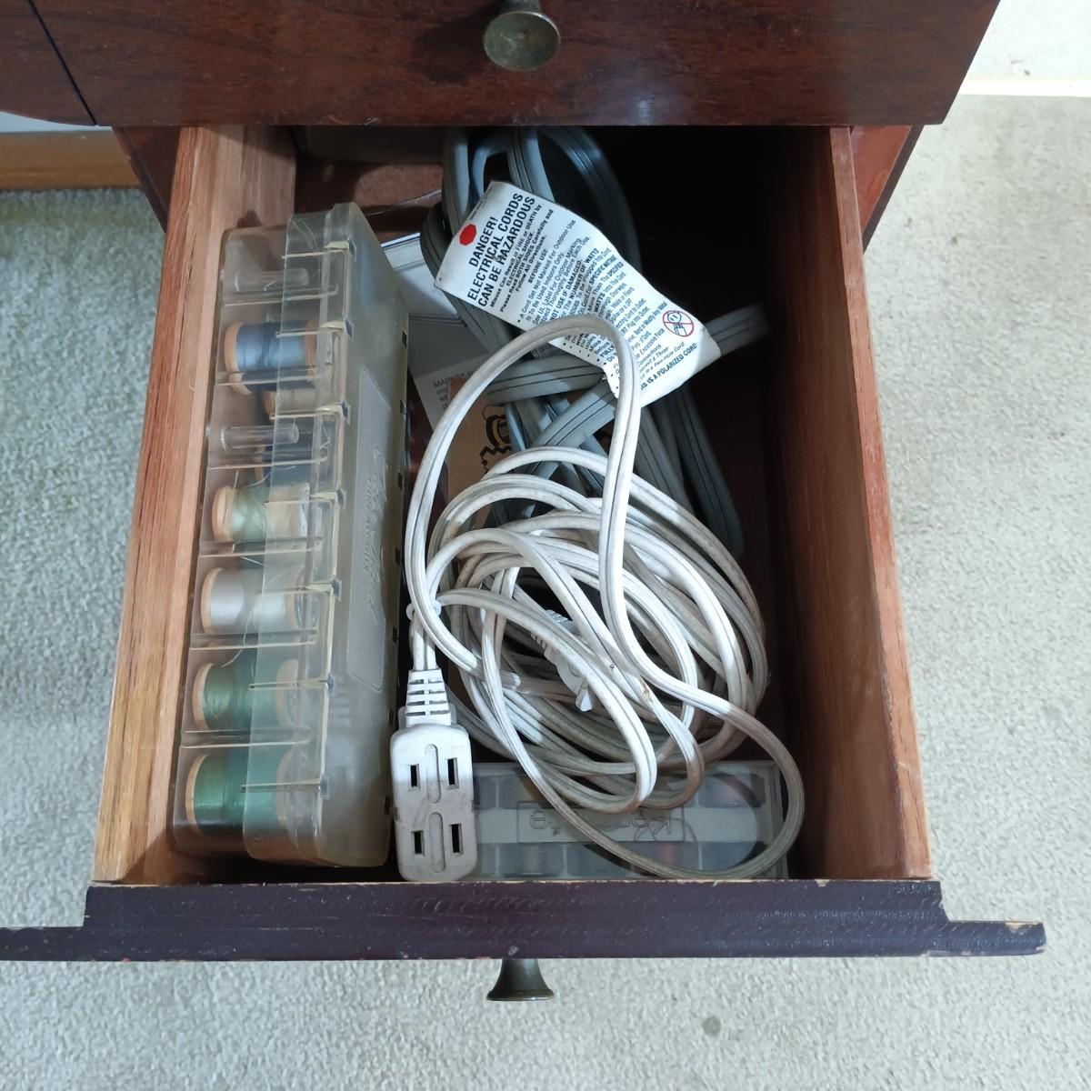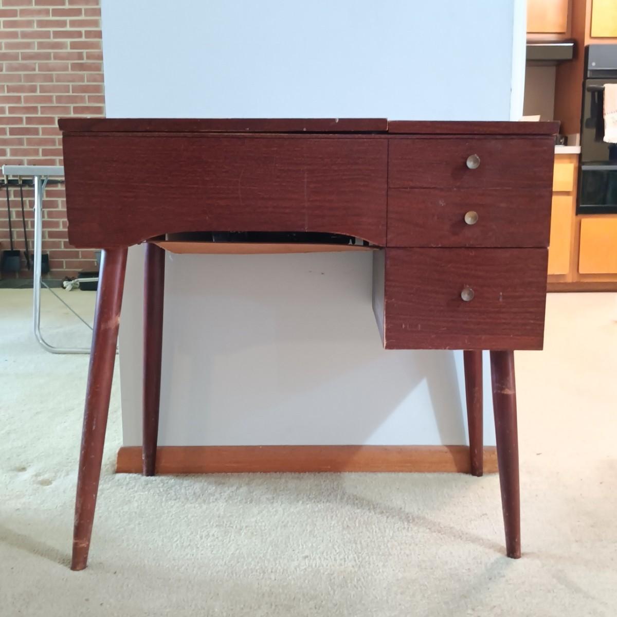 LOT 10: MCM Sewing Cabinet with Kenmore 1120 Sewing Machine, Plastic Thread Caddy, Sewing Notions & More