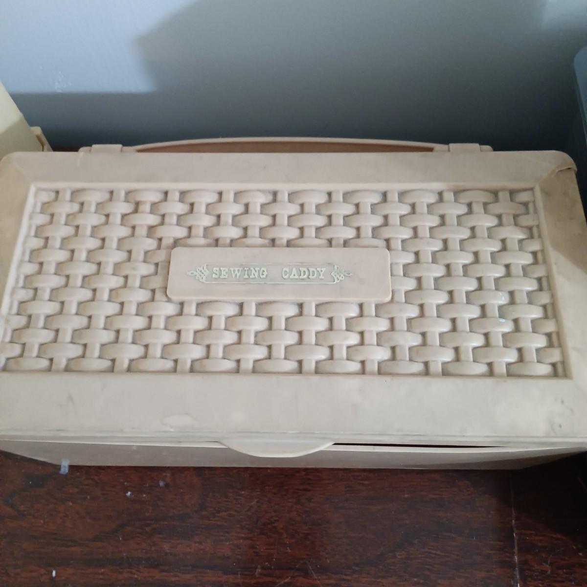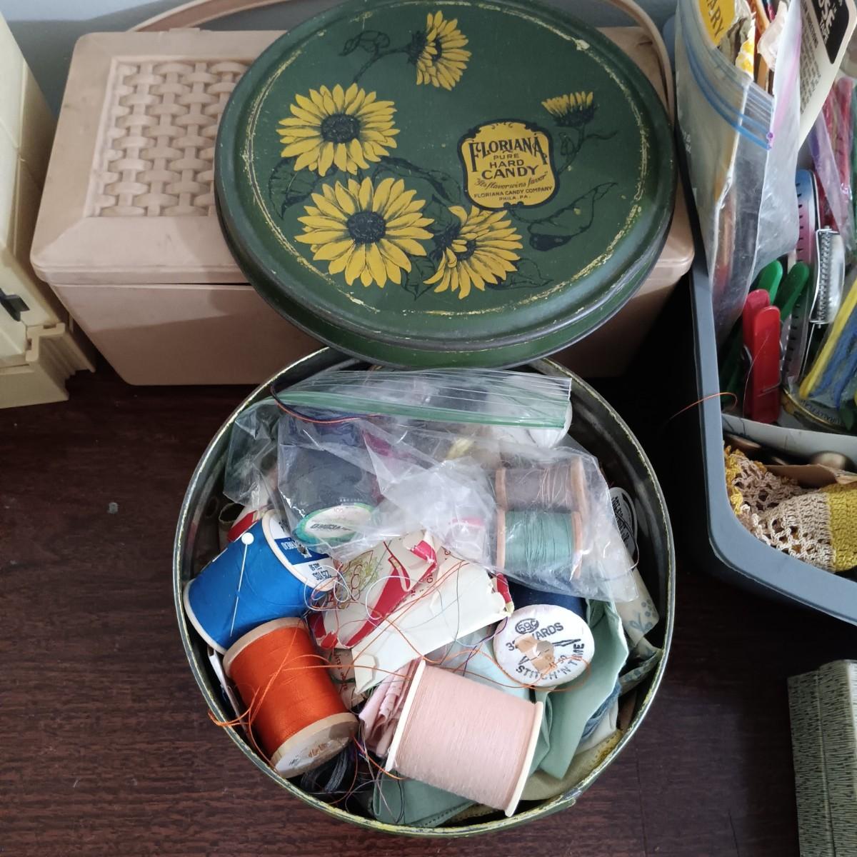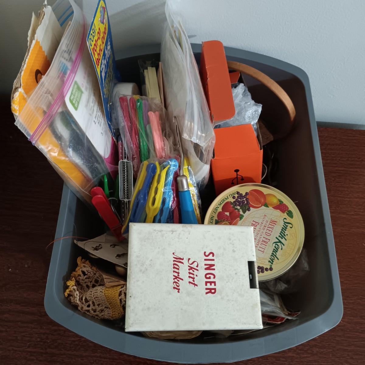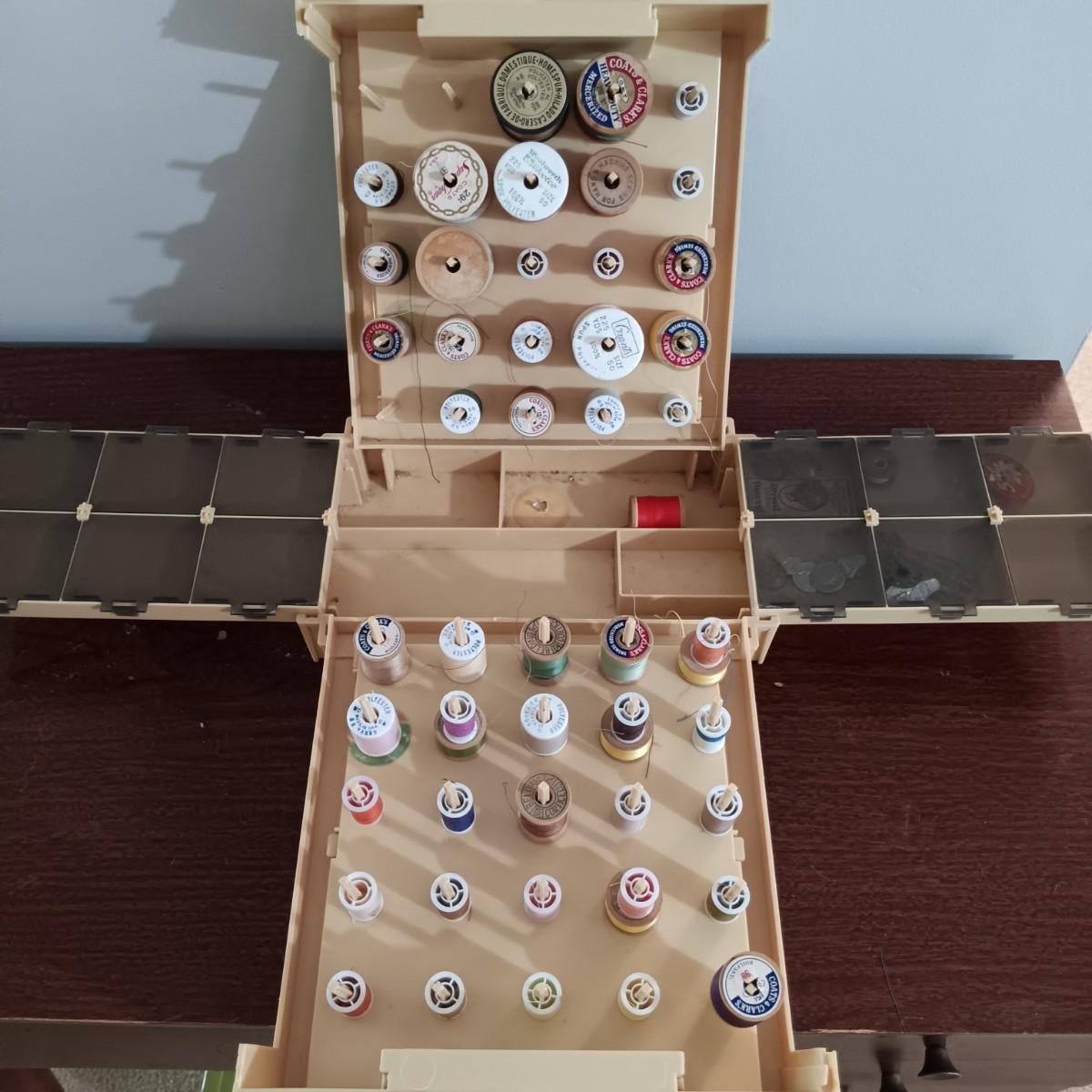 LOT 10: MCM Sewing Cabinet with Kenmore 1120 Sewing Machine, Plastic Thread Caddy, Sewing Notions & More