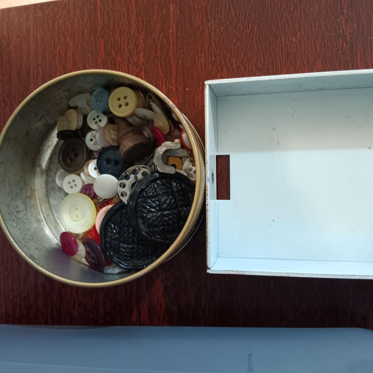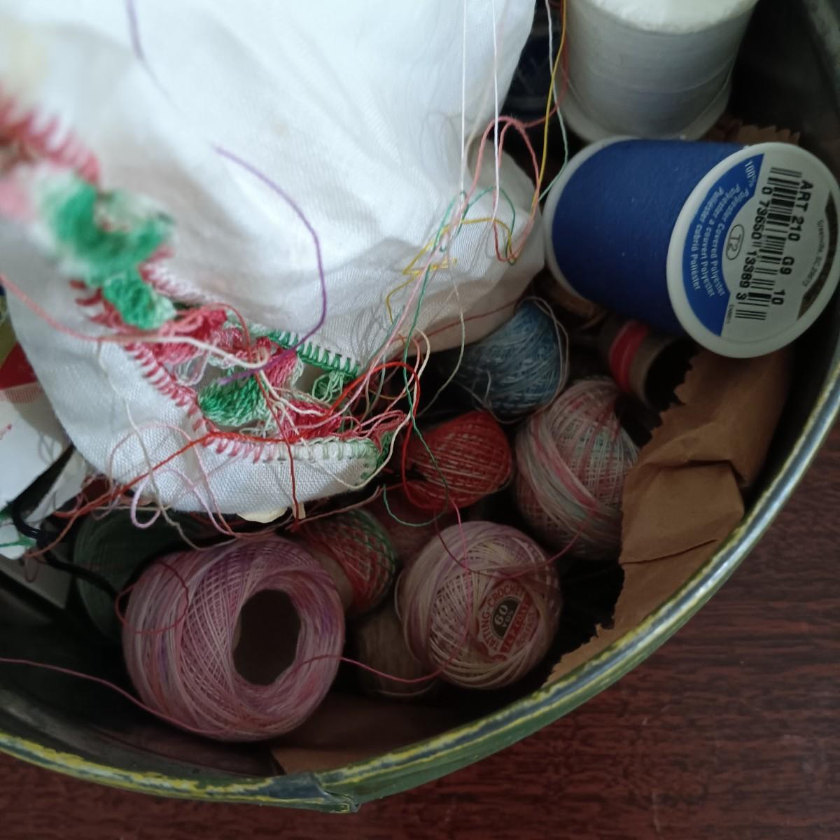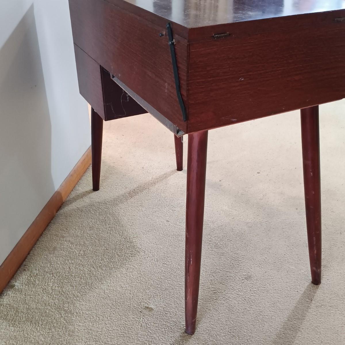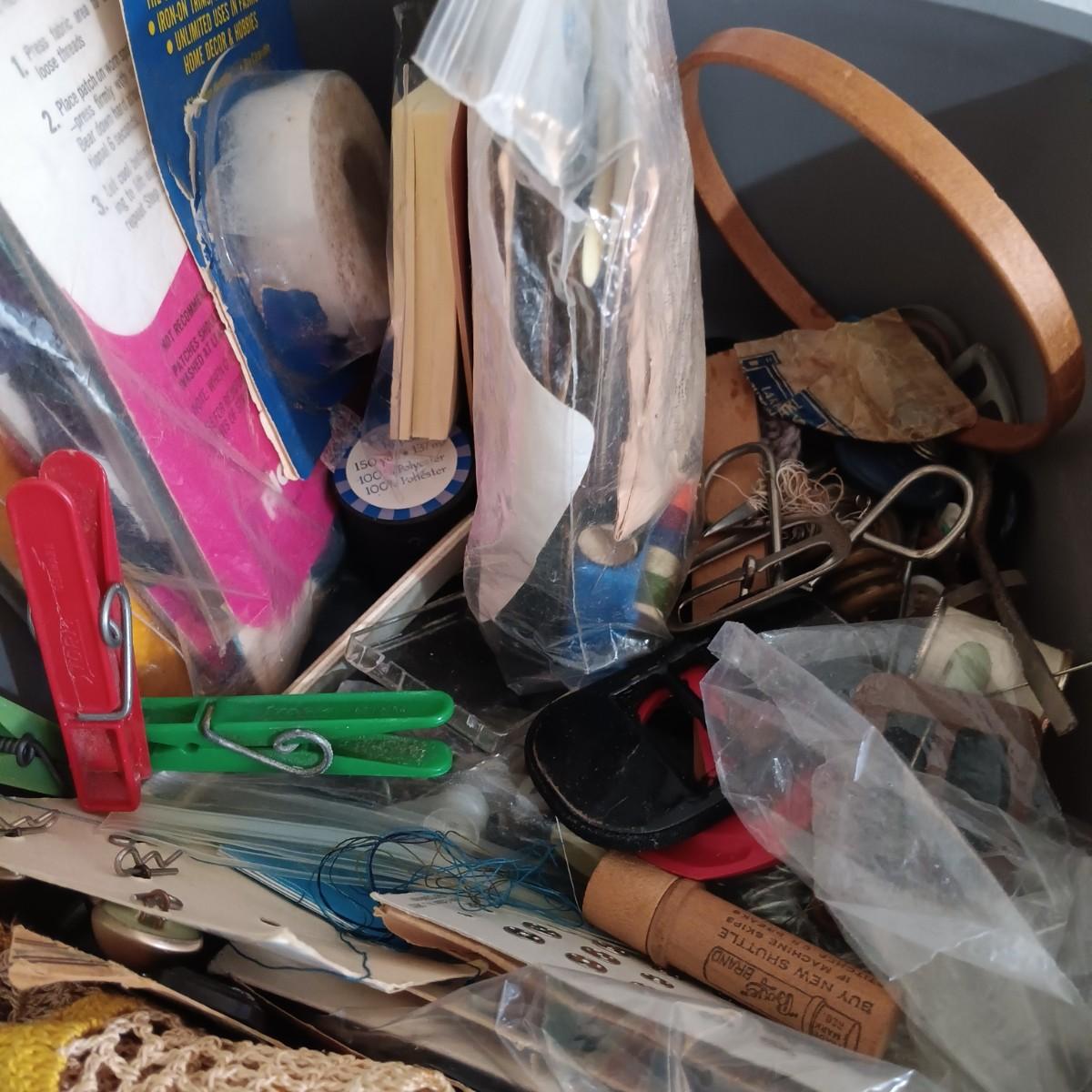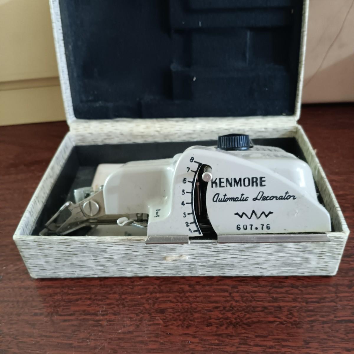 LOT 10: MCM Sewing Cabinet with Kenmore 1120 Sewing Machine, Plastic Thread Caddy, Sewing Notions & More