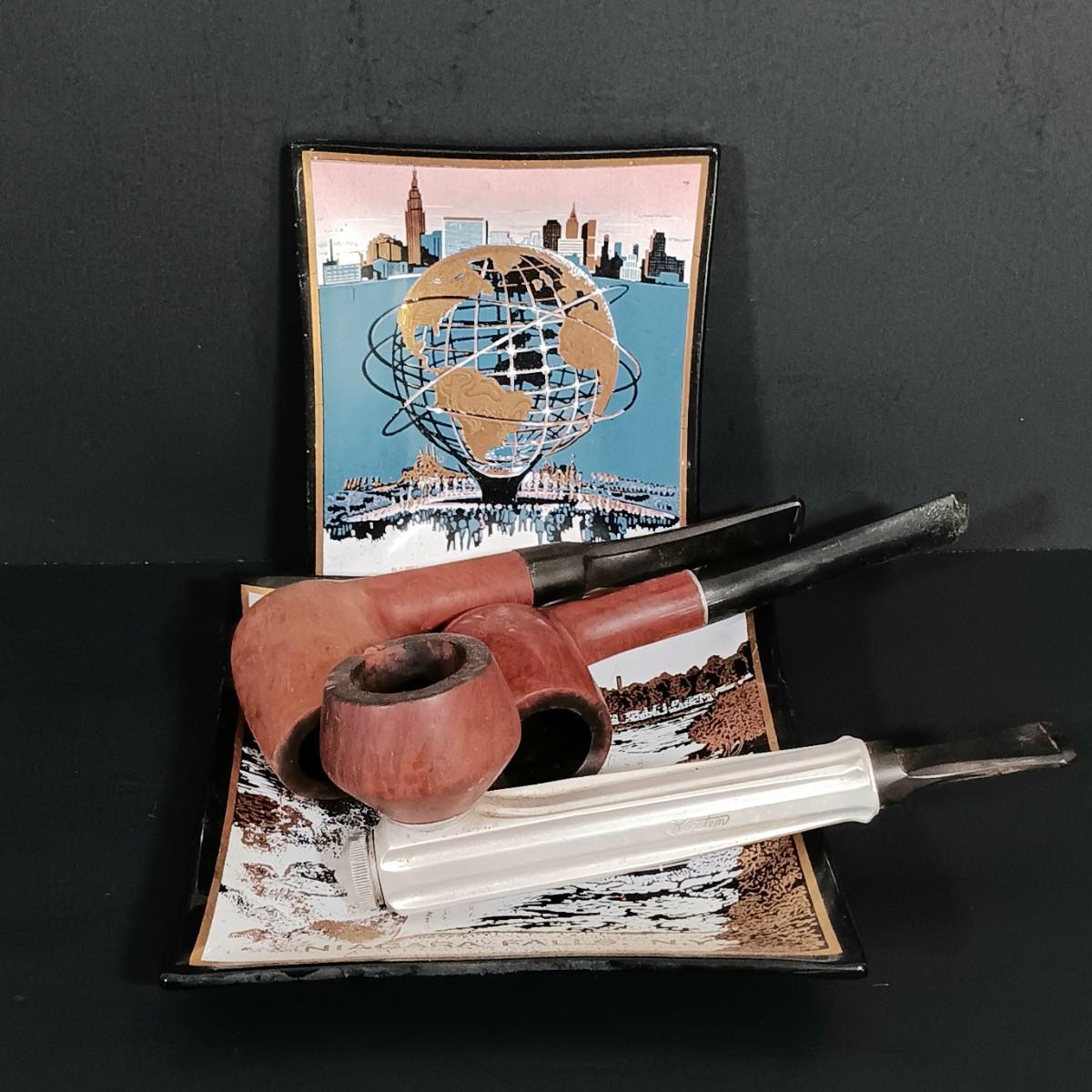 LOT 25: Kirsten Aluminum Estate Pipe, Key-Man Pipe, Leisure Pipe & (2) Houze Art Glass Trays