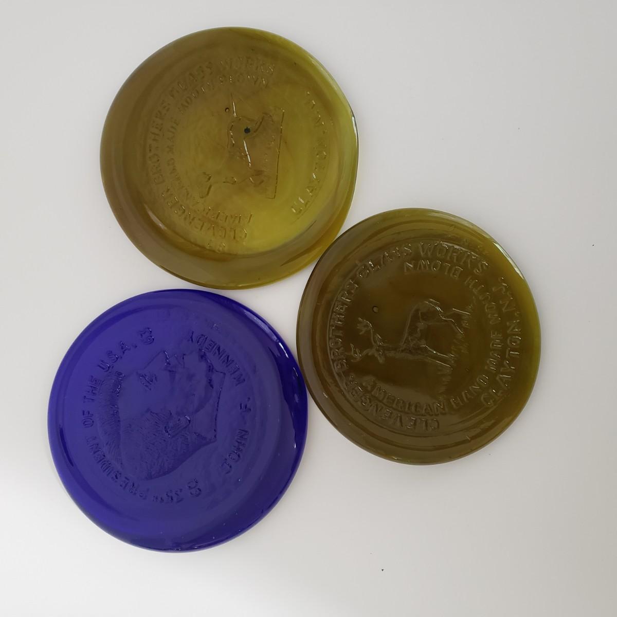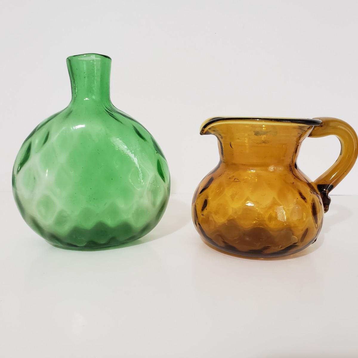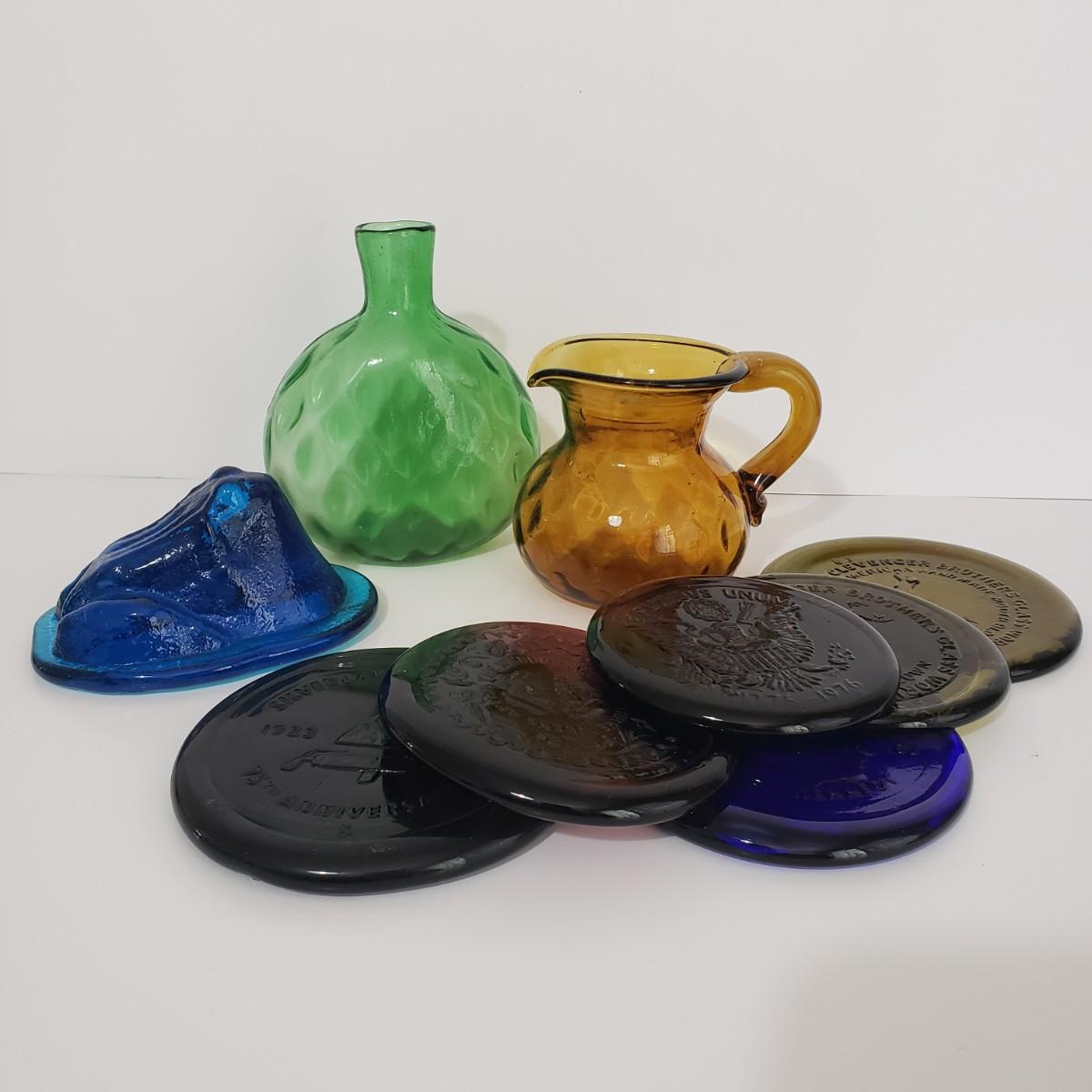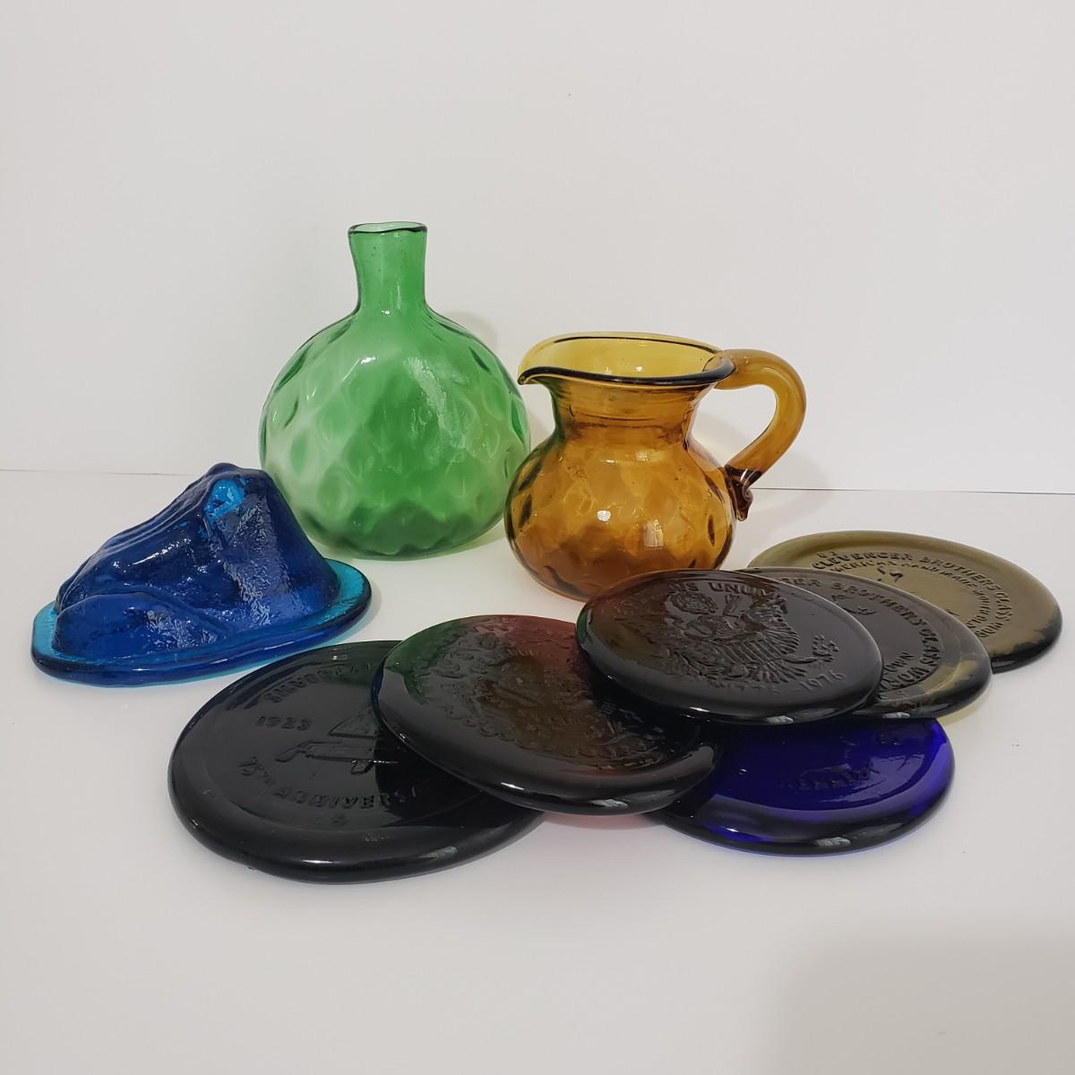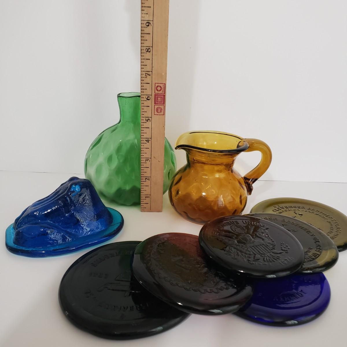 LOT 29: Clevenger Bros Glass Paperweight Disks, Frog, Hand Blown Pitcher and Vase