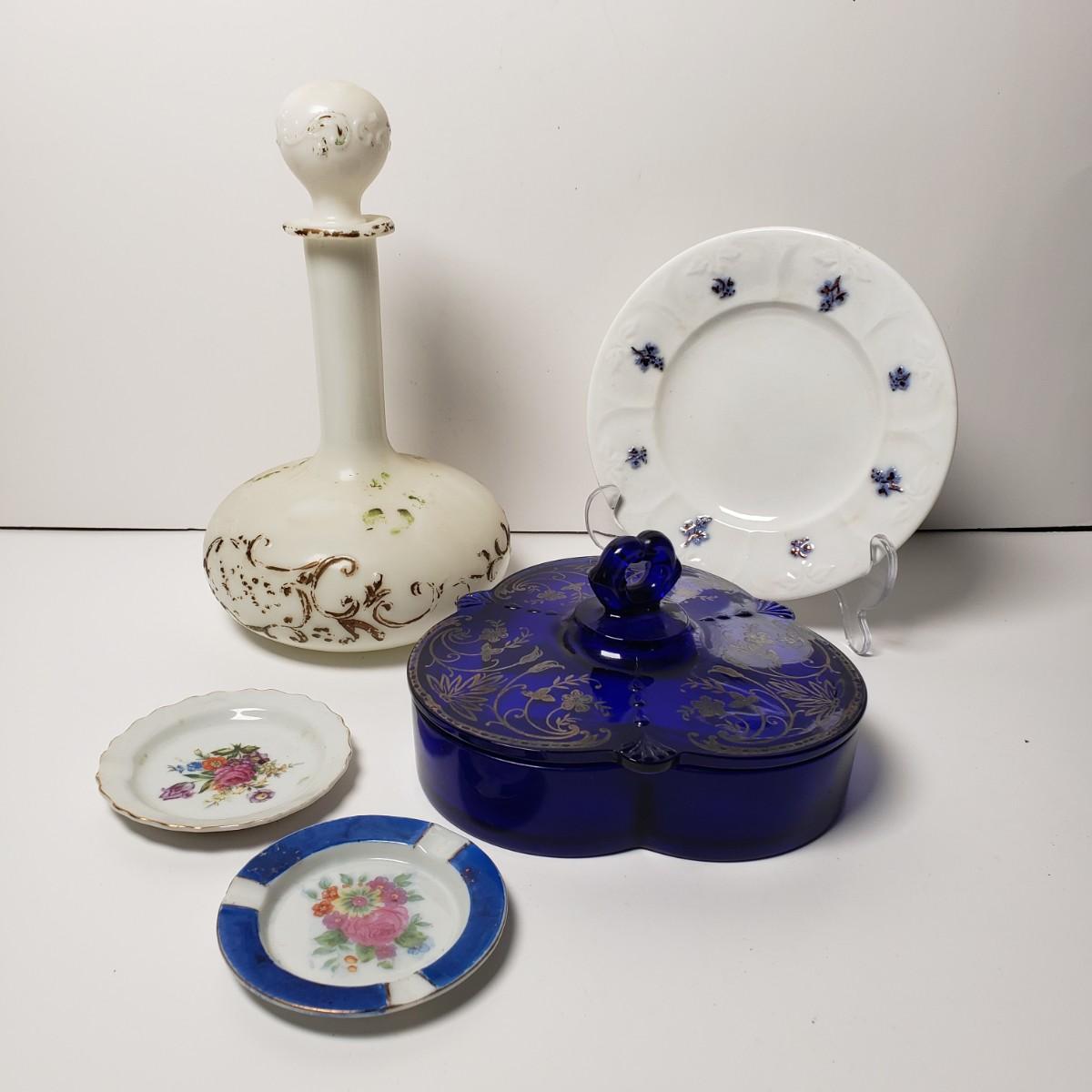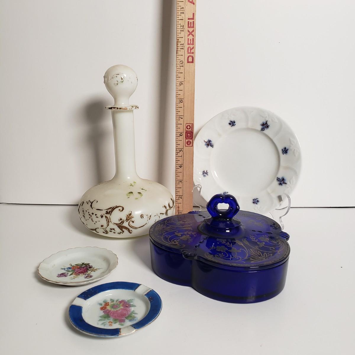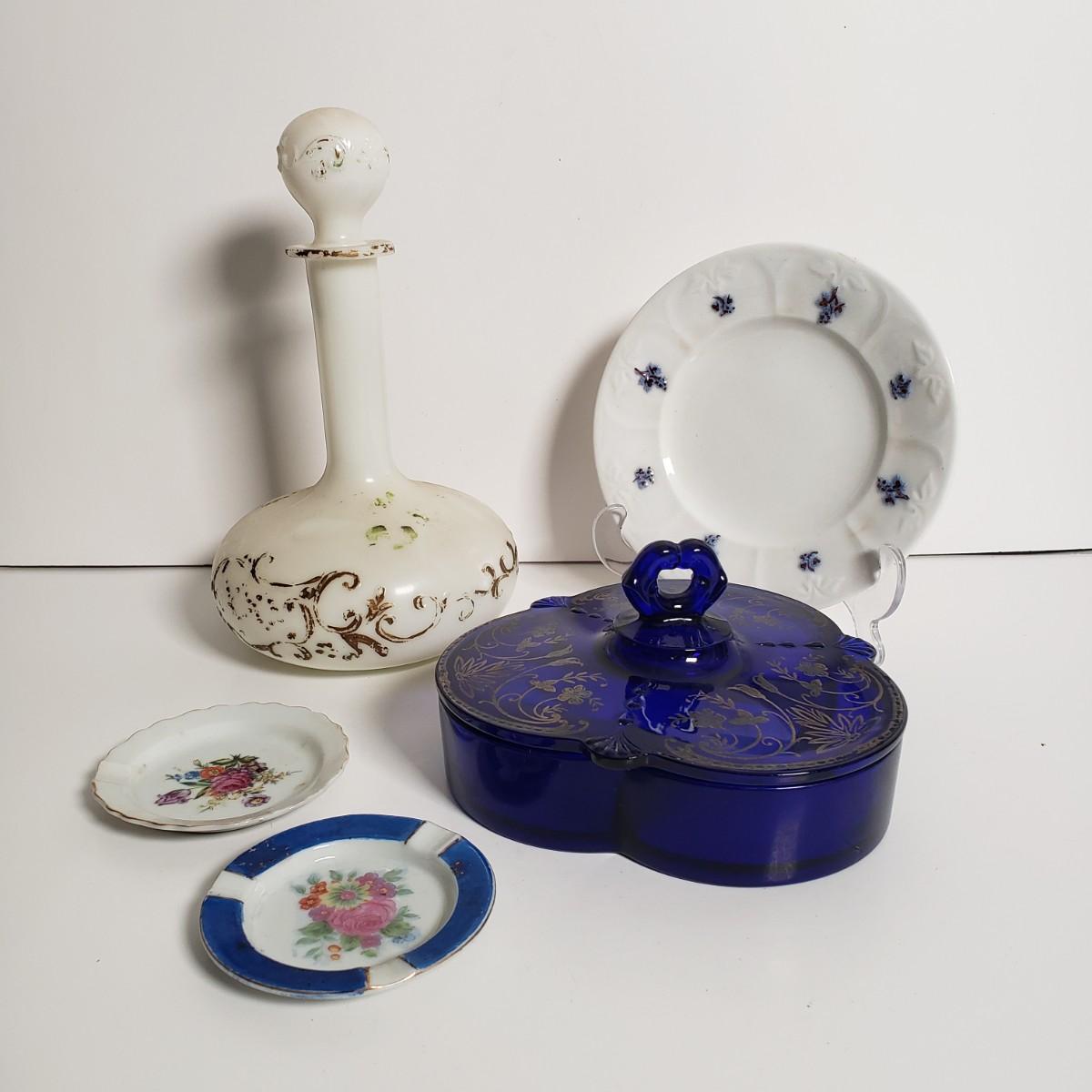 LOT 47: Antique Glass Collection; Milk Glass, Cobalt Glass, Ashtray/Trinket Dishes