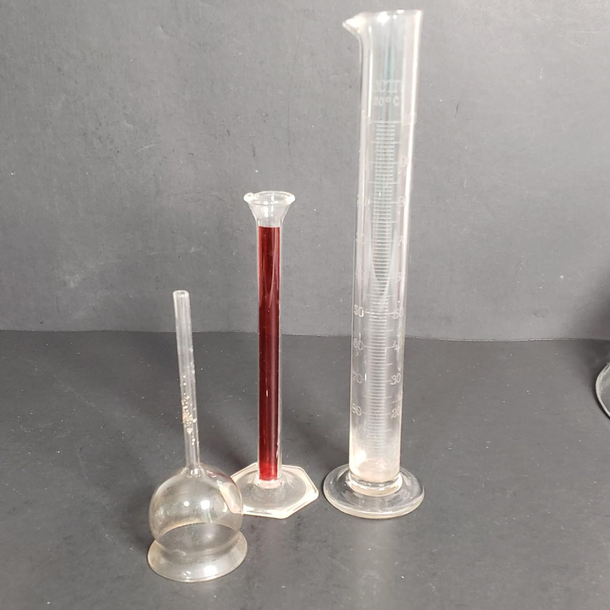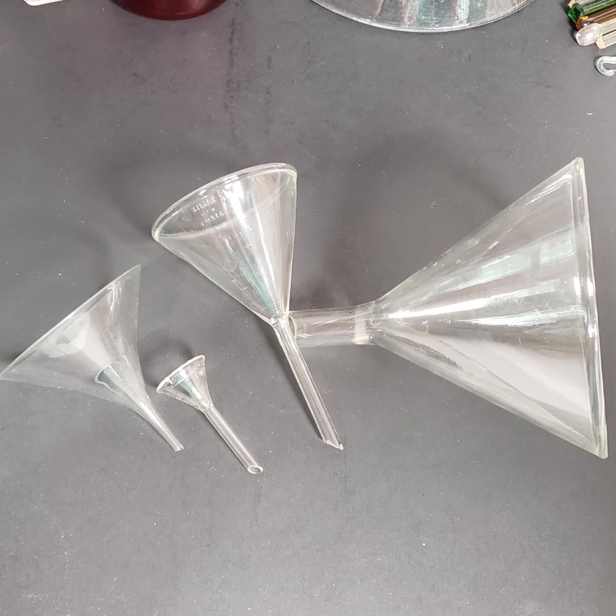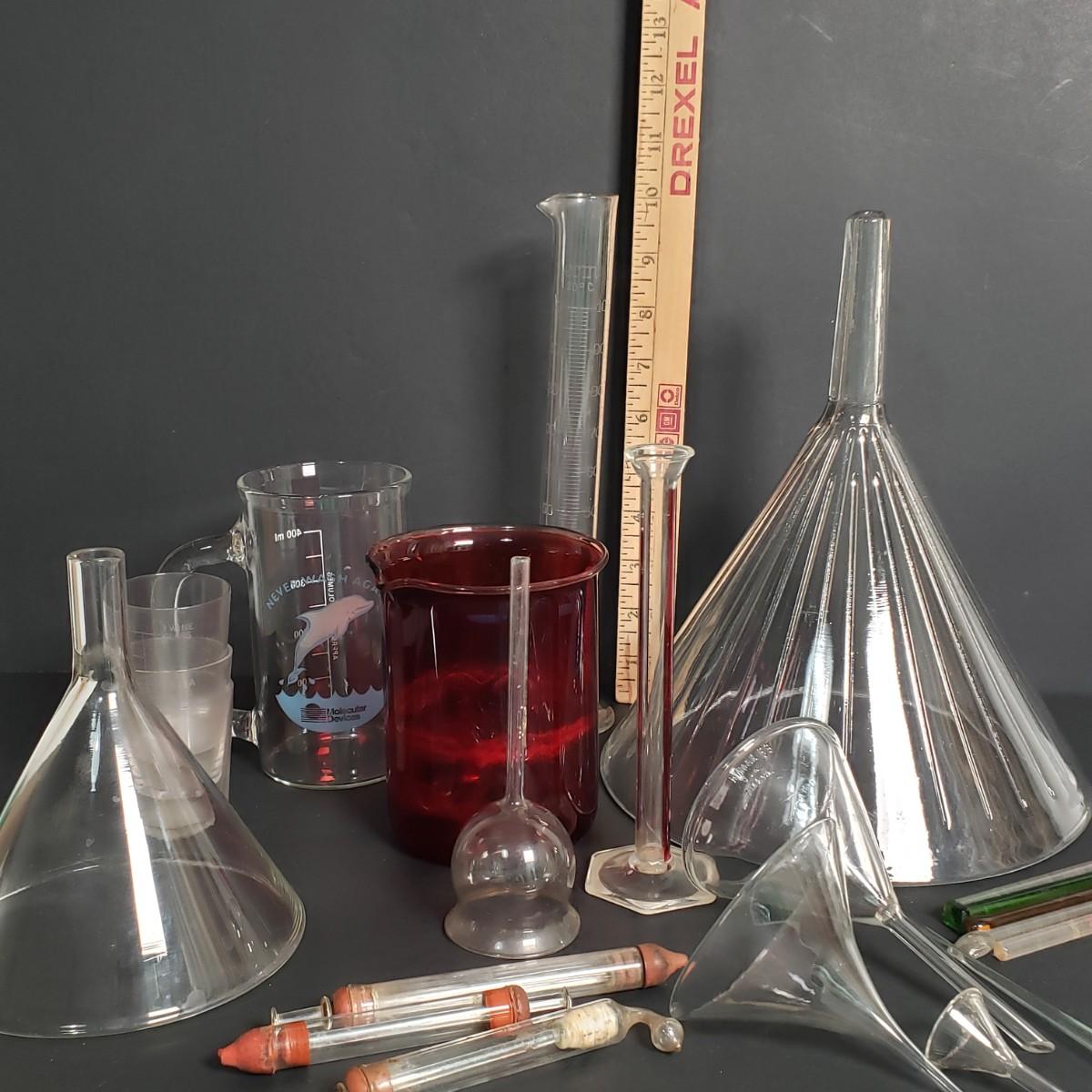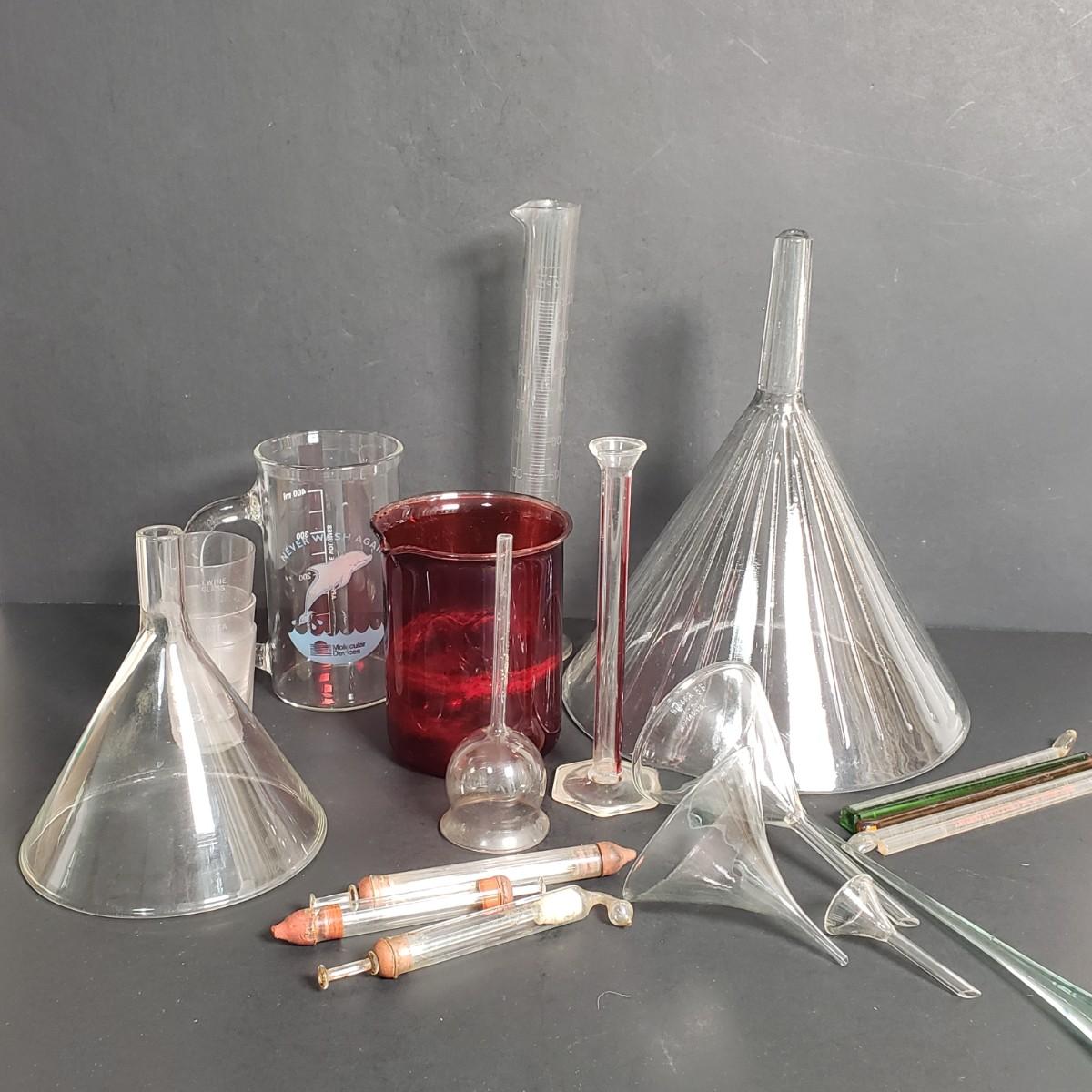 LOT 52: Collection of Vintage Laboratory Glassware and Equipment; Funnels, Beakers, and More
