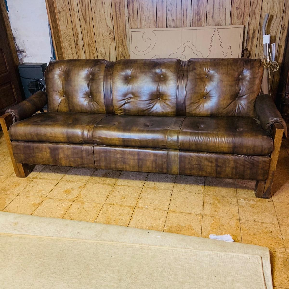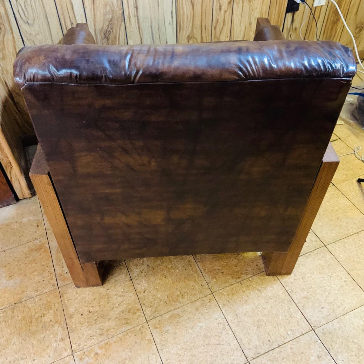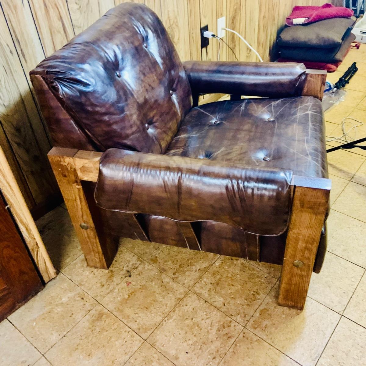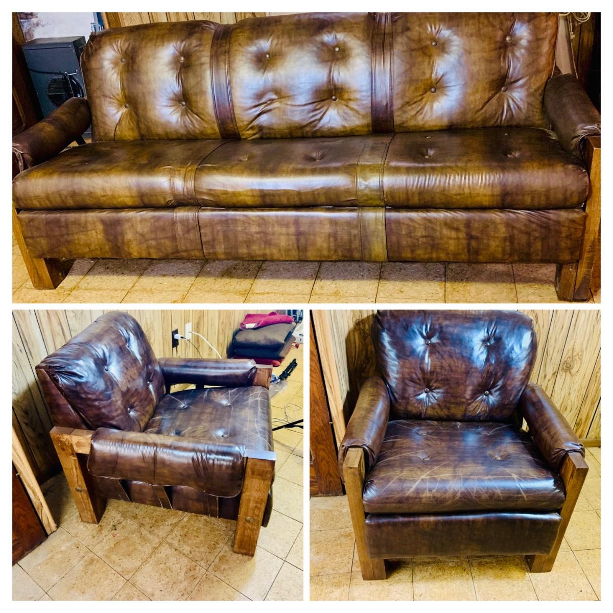 LOT 82: Mid Century Brown Faux Leather Sofa and Arm Chair with Wood Arms/Legs