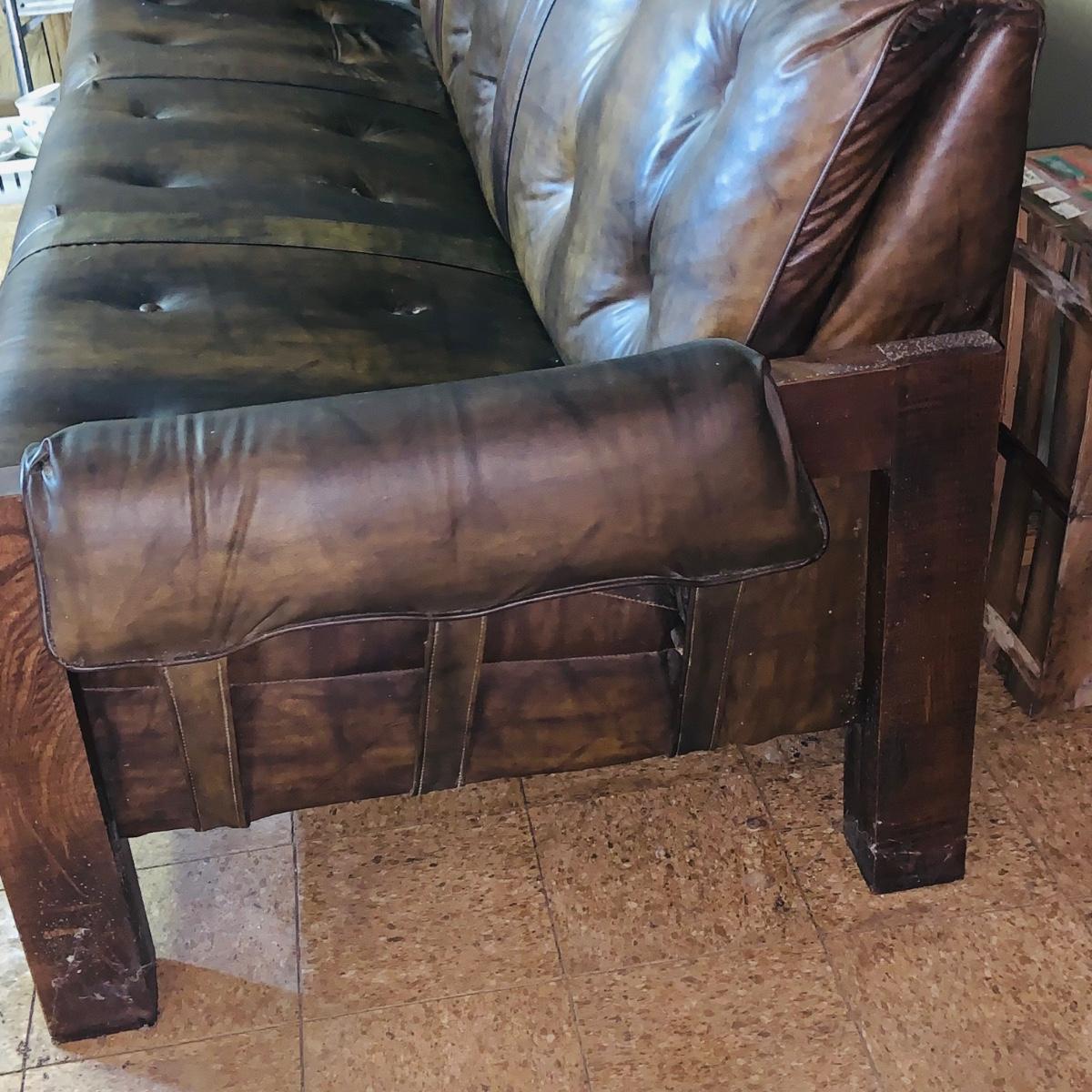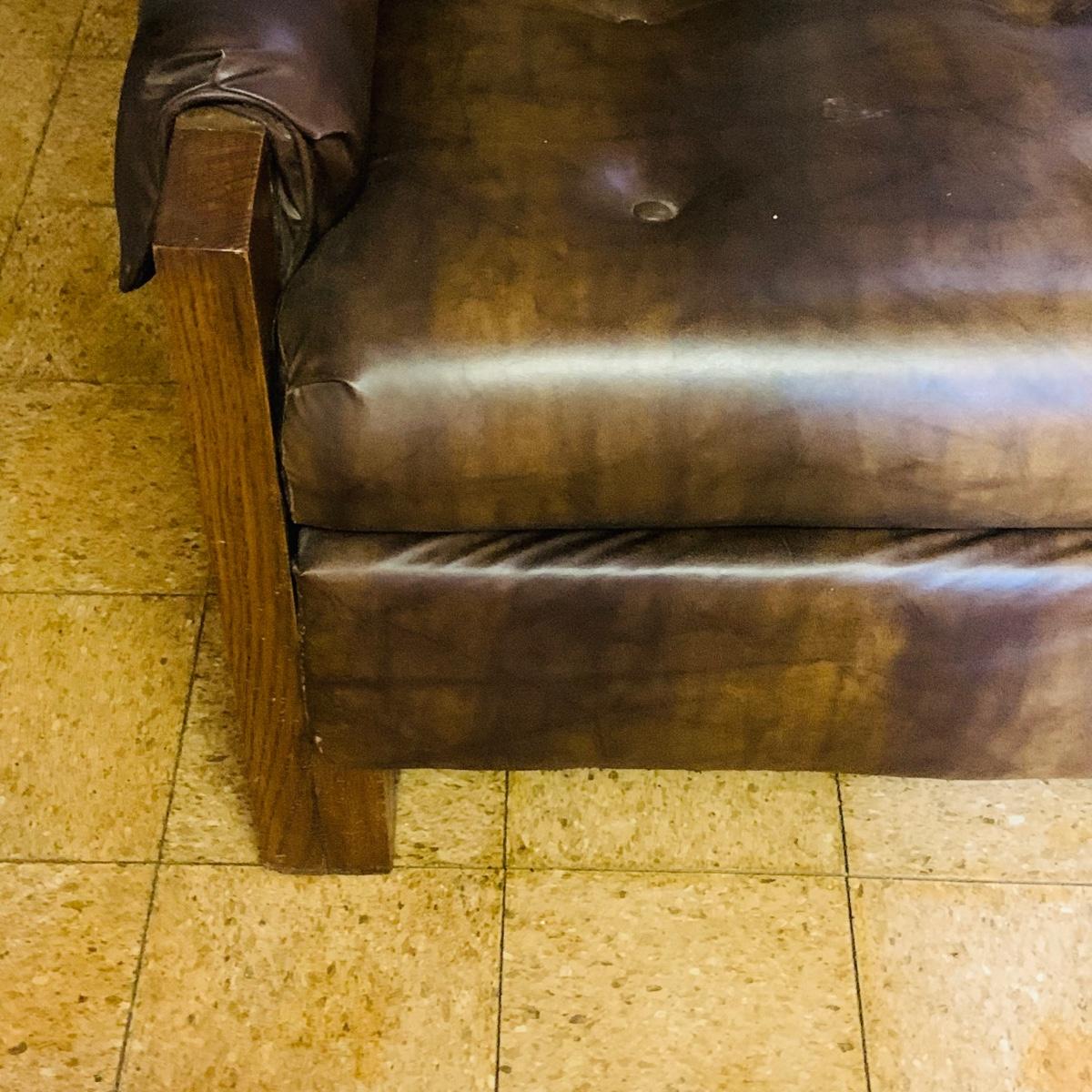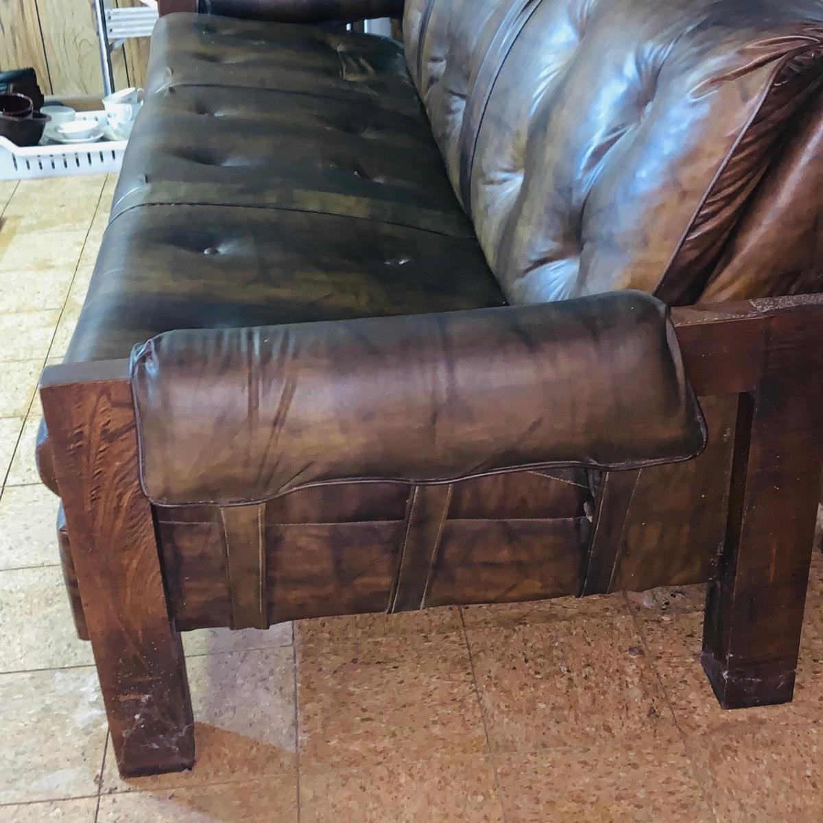LOT 82: Mid Century Brown Faux Leather Sofa and Arm Chair with Wood Arms/Legs