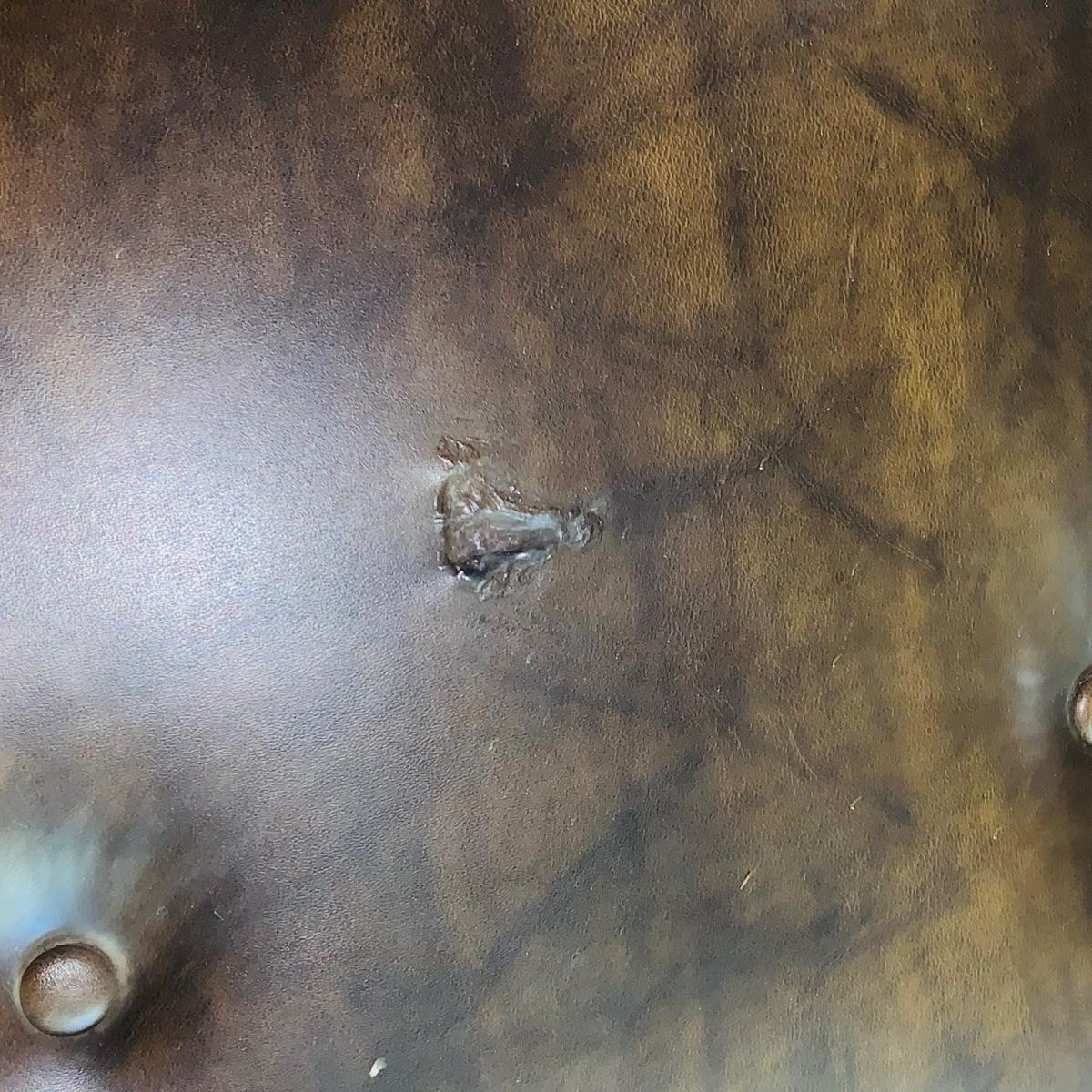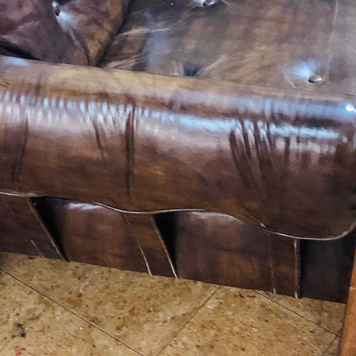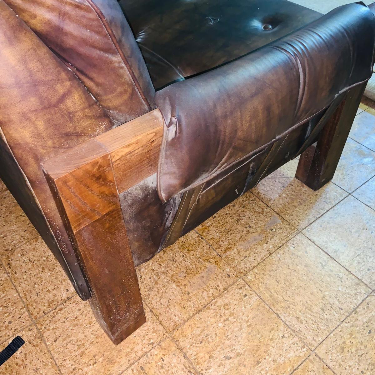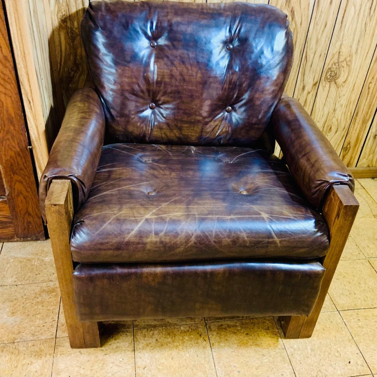 LOT 82: Mid Century Brown Faux Leather Sofa and Arm Chair with Wood Arms/Legs