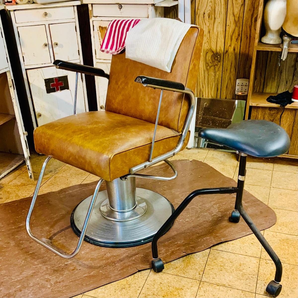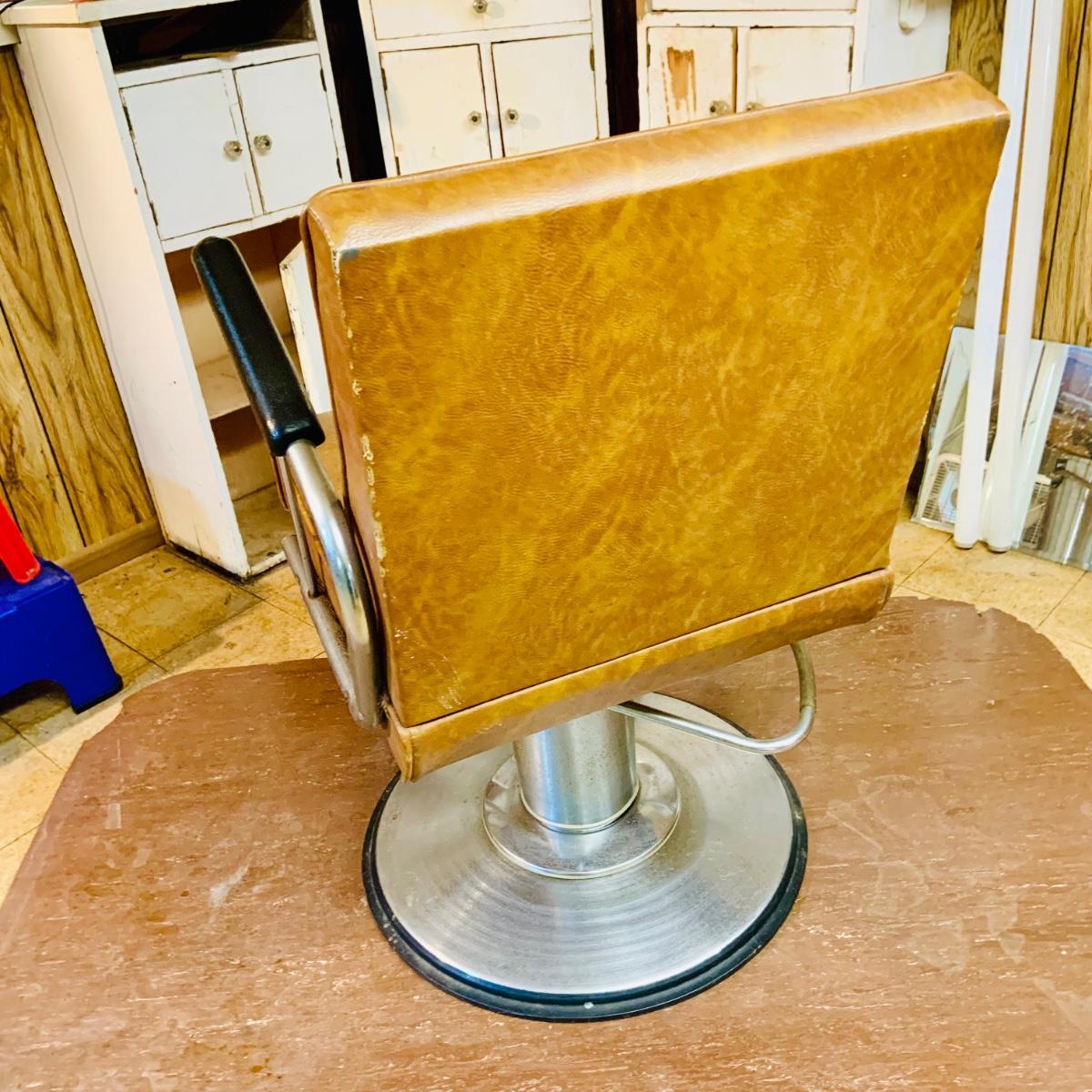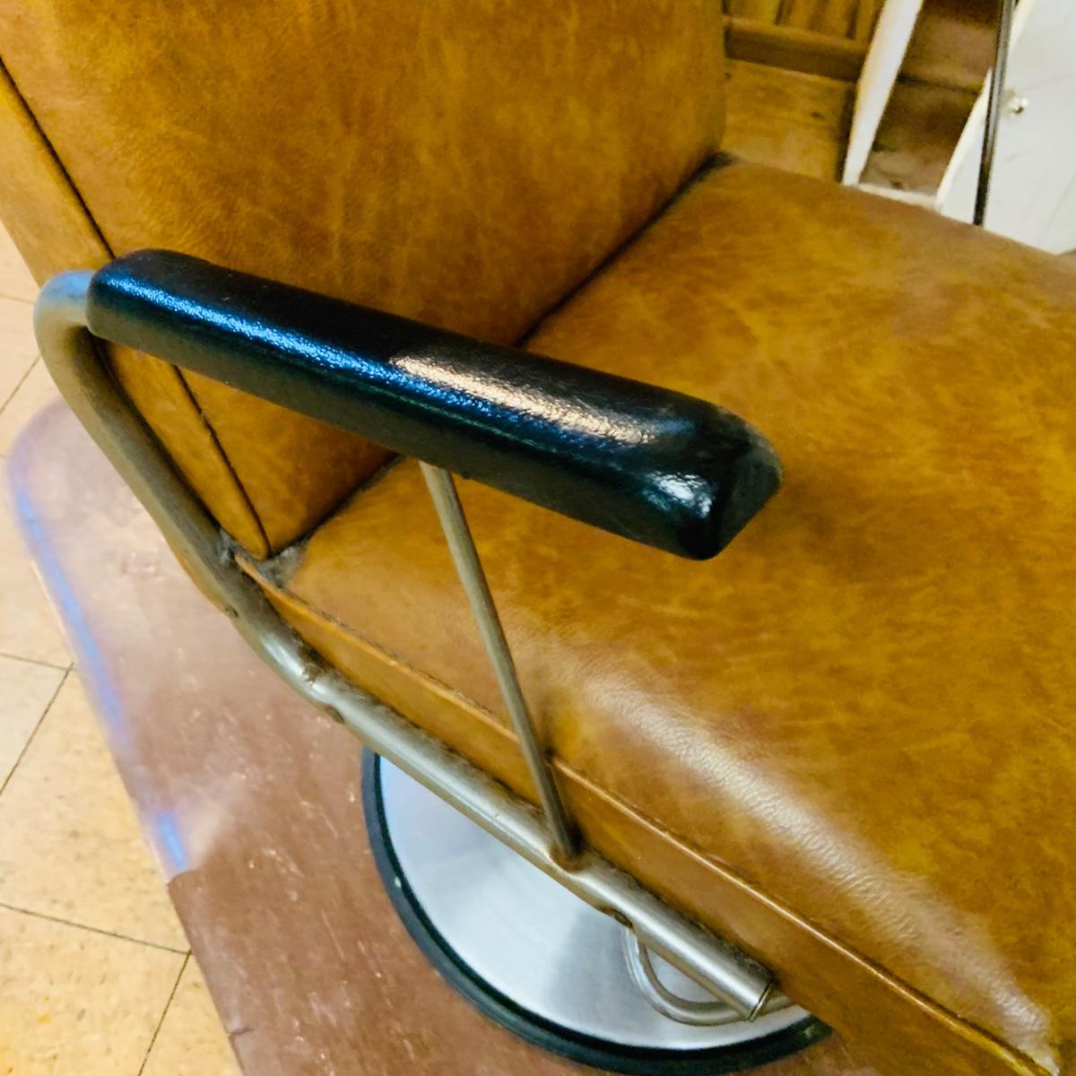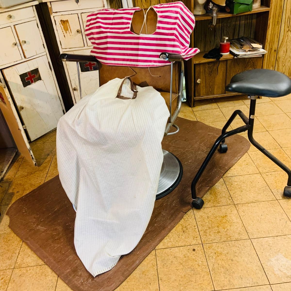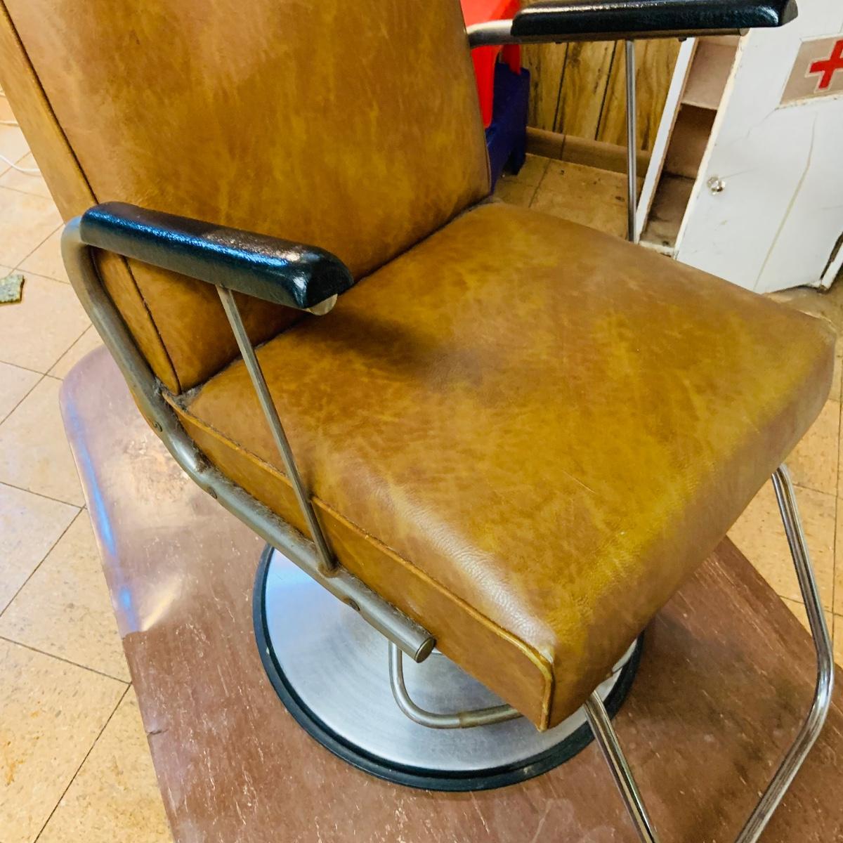 LOT 86: Mid - Century Adjustable Barber’s Chair with Barber Capes and a Three Leg Roll About Stool
