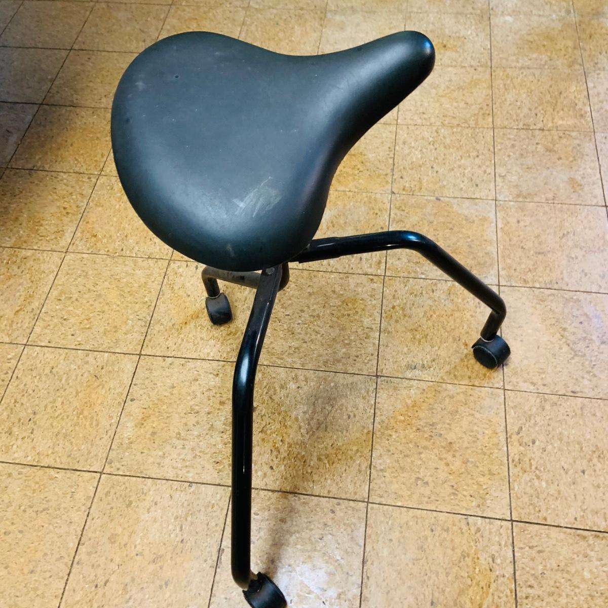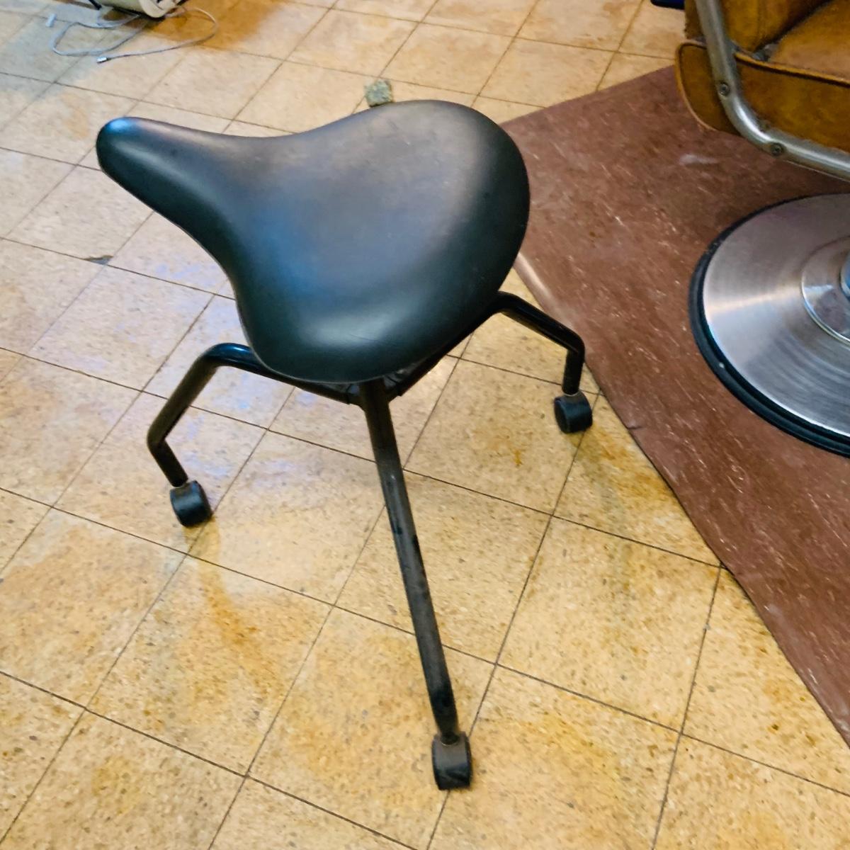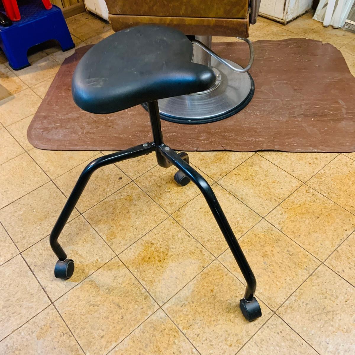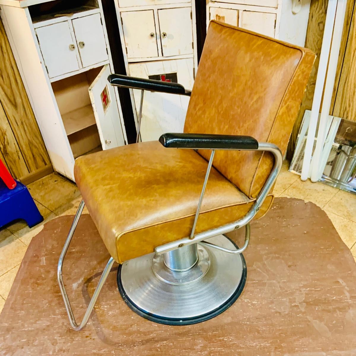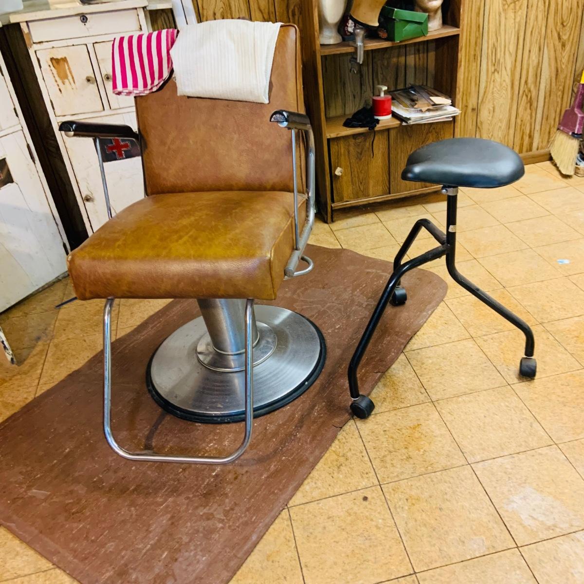 LOT 86: Mid - Century Adjustable Barber’s Chair with Barber Capes and a Three Leg Roll About Stool