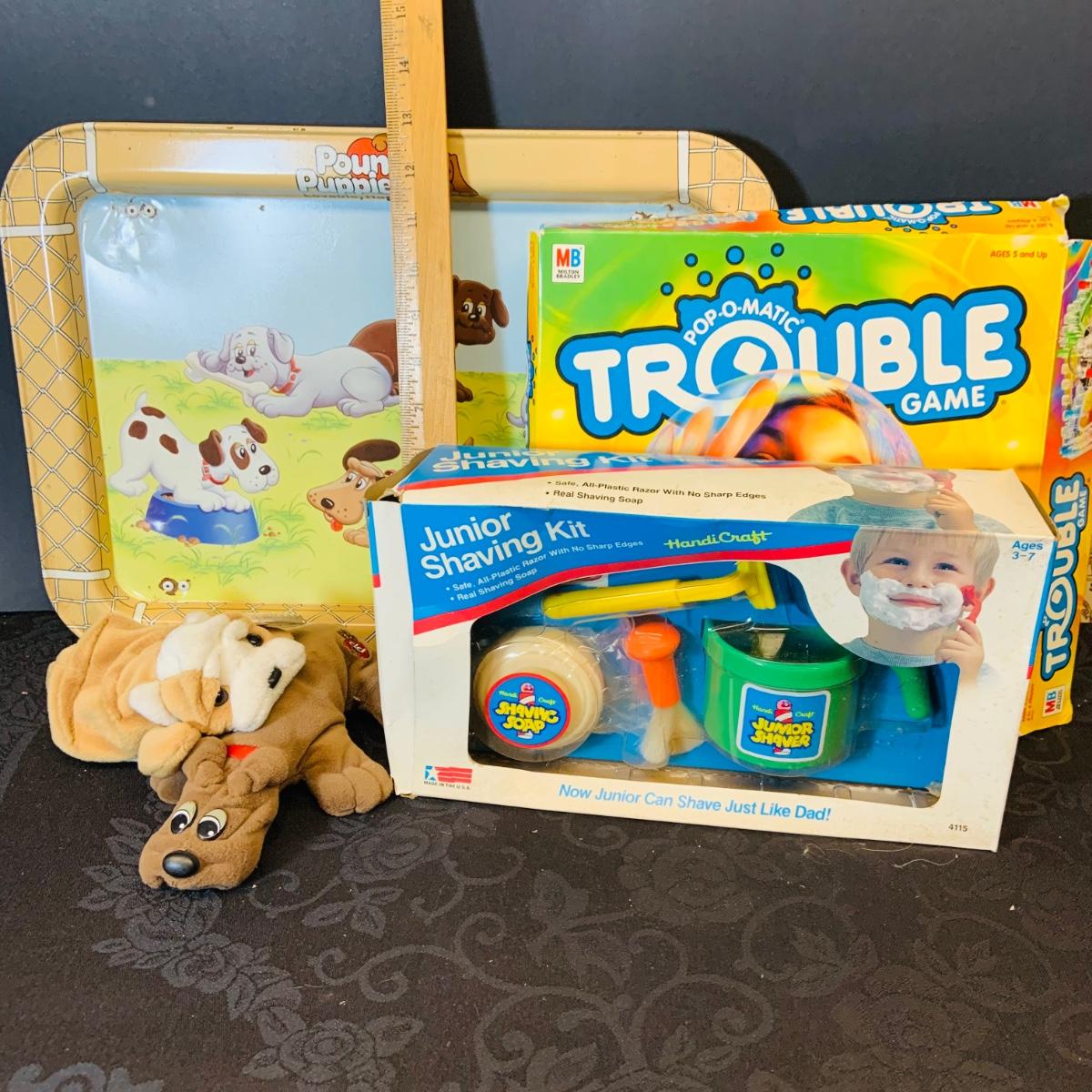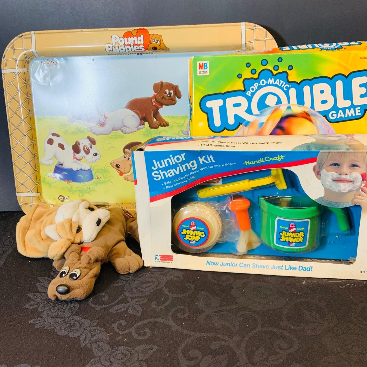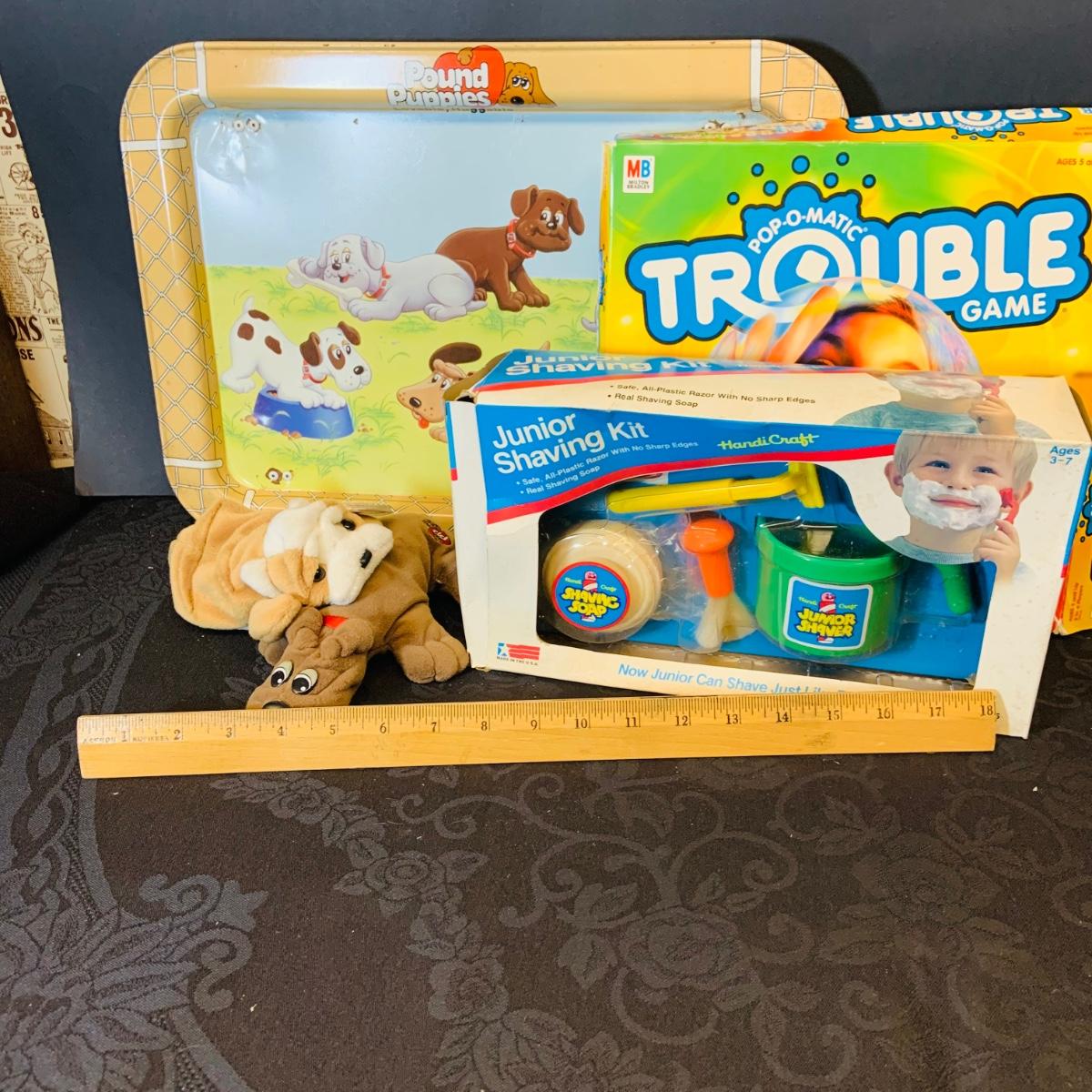 LOT 90: Collection of Children’s Toy, Game and More Featuring a Pound Puppy TV Tray, Vintage Junior Shaving Kit a Mini Pound Puppy and More