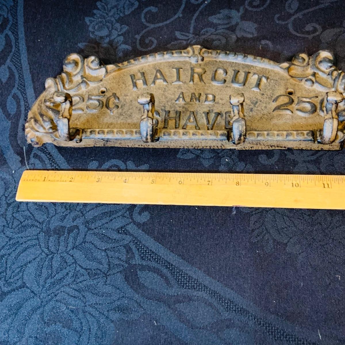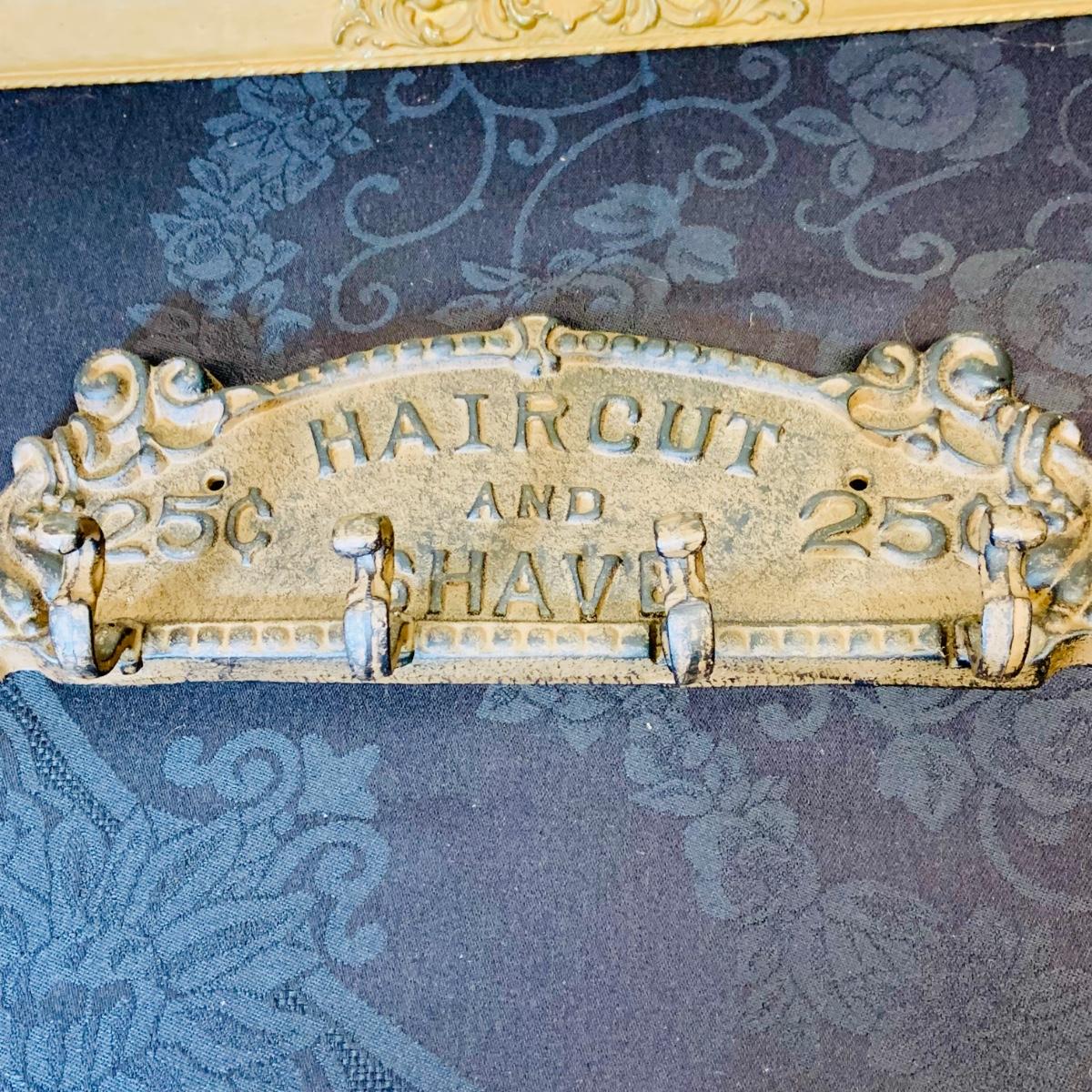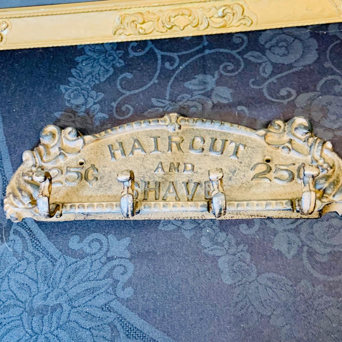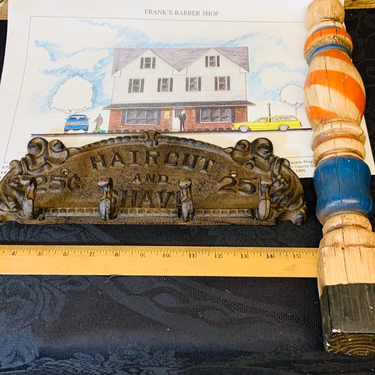 LOT 91: Barber Shop Memorabilia a Framed Etching, Cast Iron Haircut Plaque, Wooden Barber Poll, Books and Mor