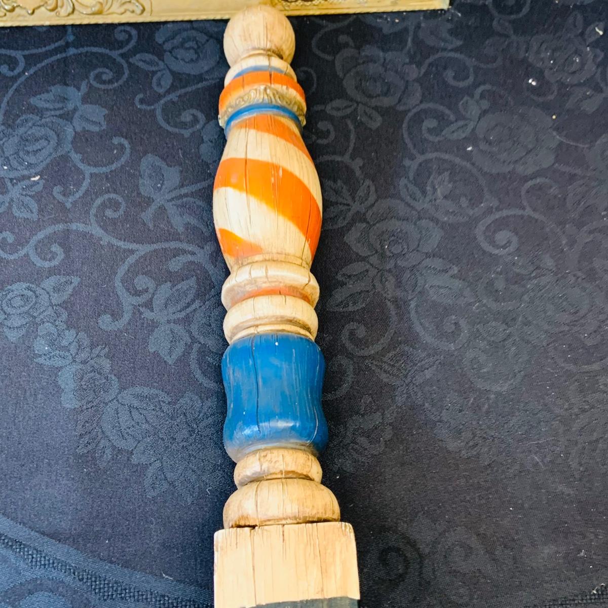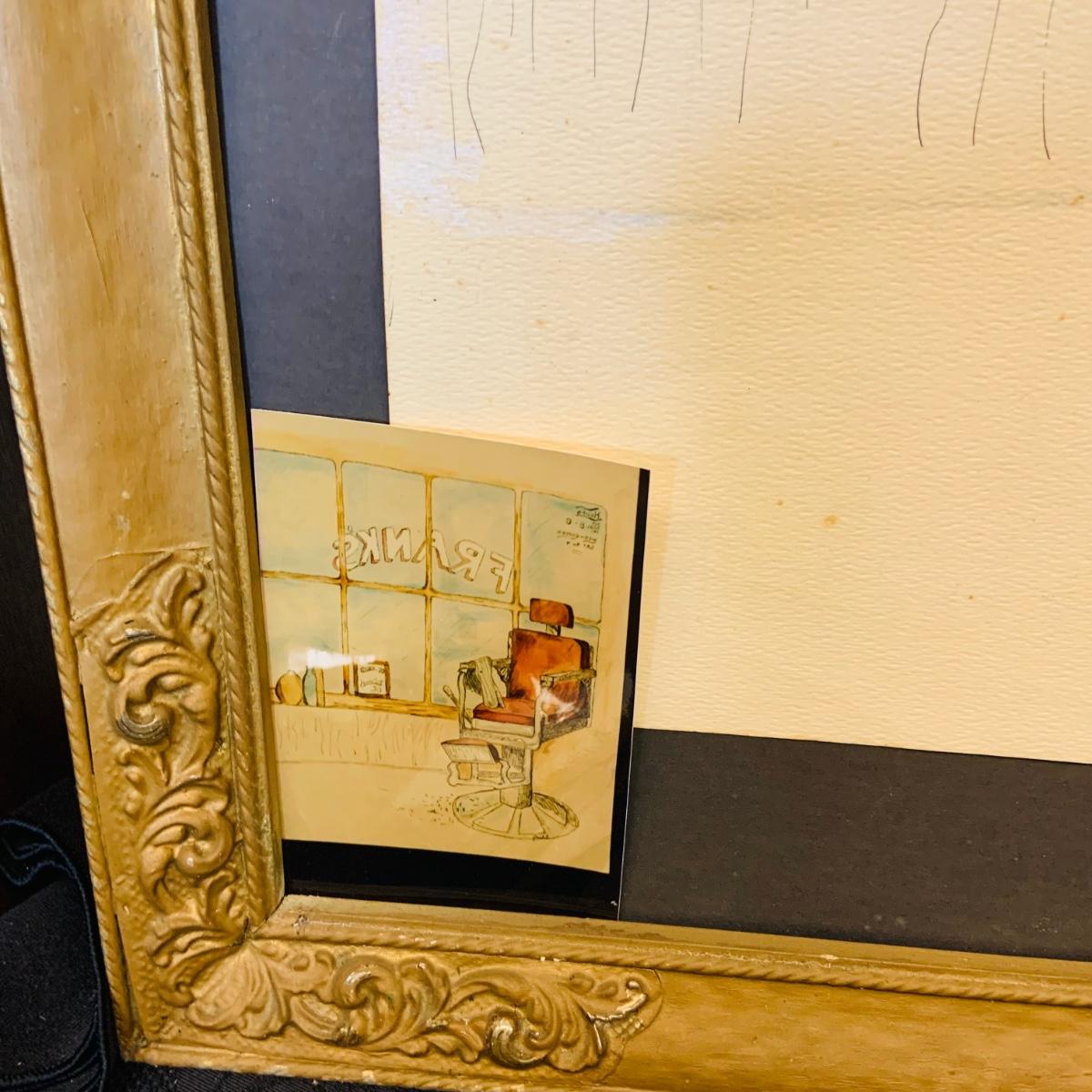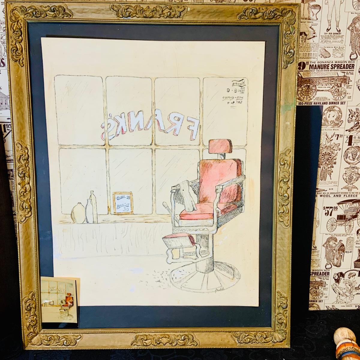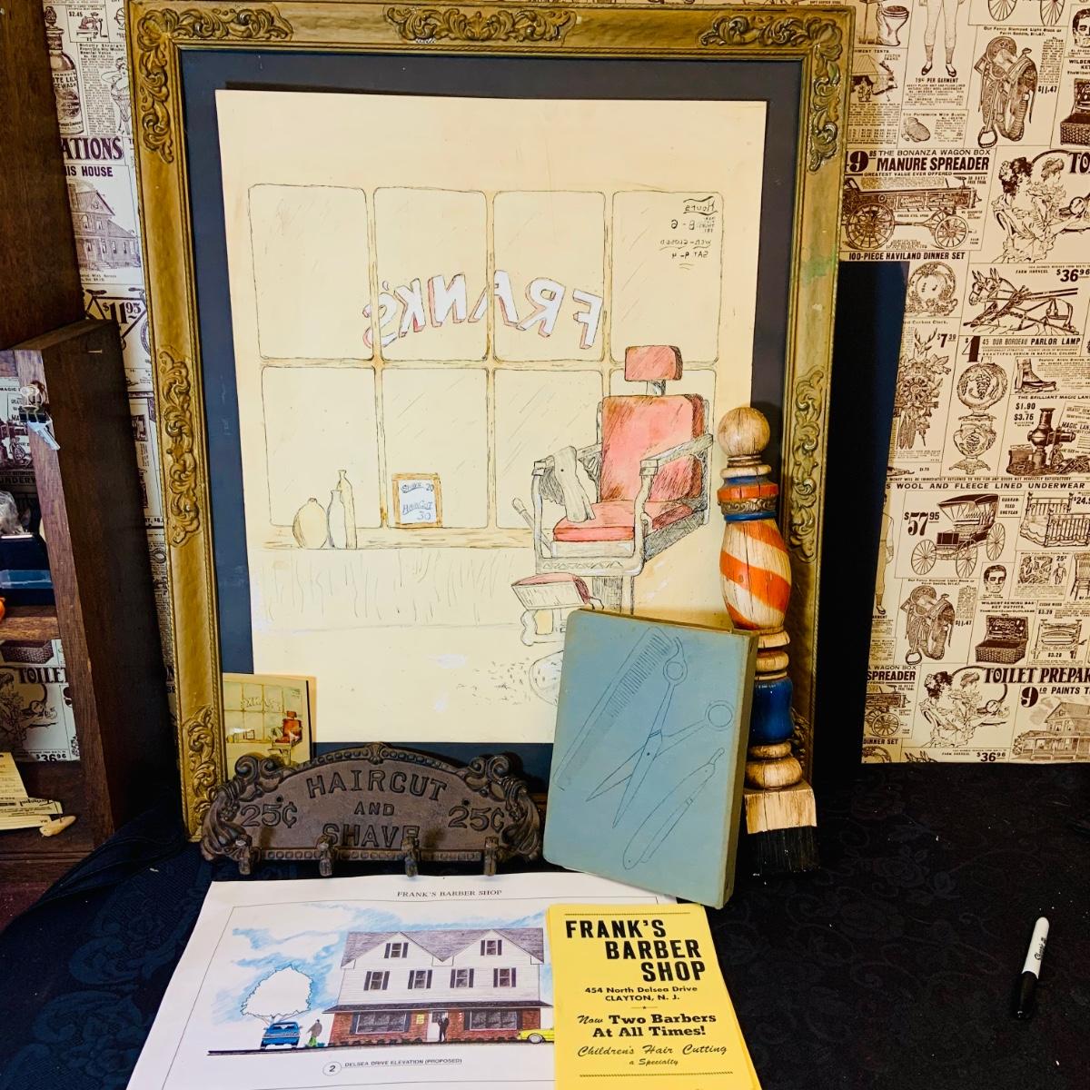 LOT 91: Barber Shop Memorabilia a Framed Etching, Cast Iron Haircut Plaque, Wooden Barber Poll, Books and Mor