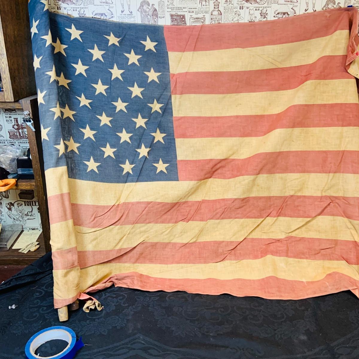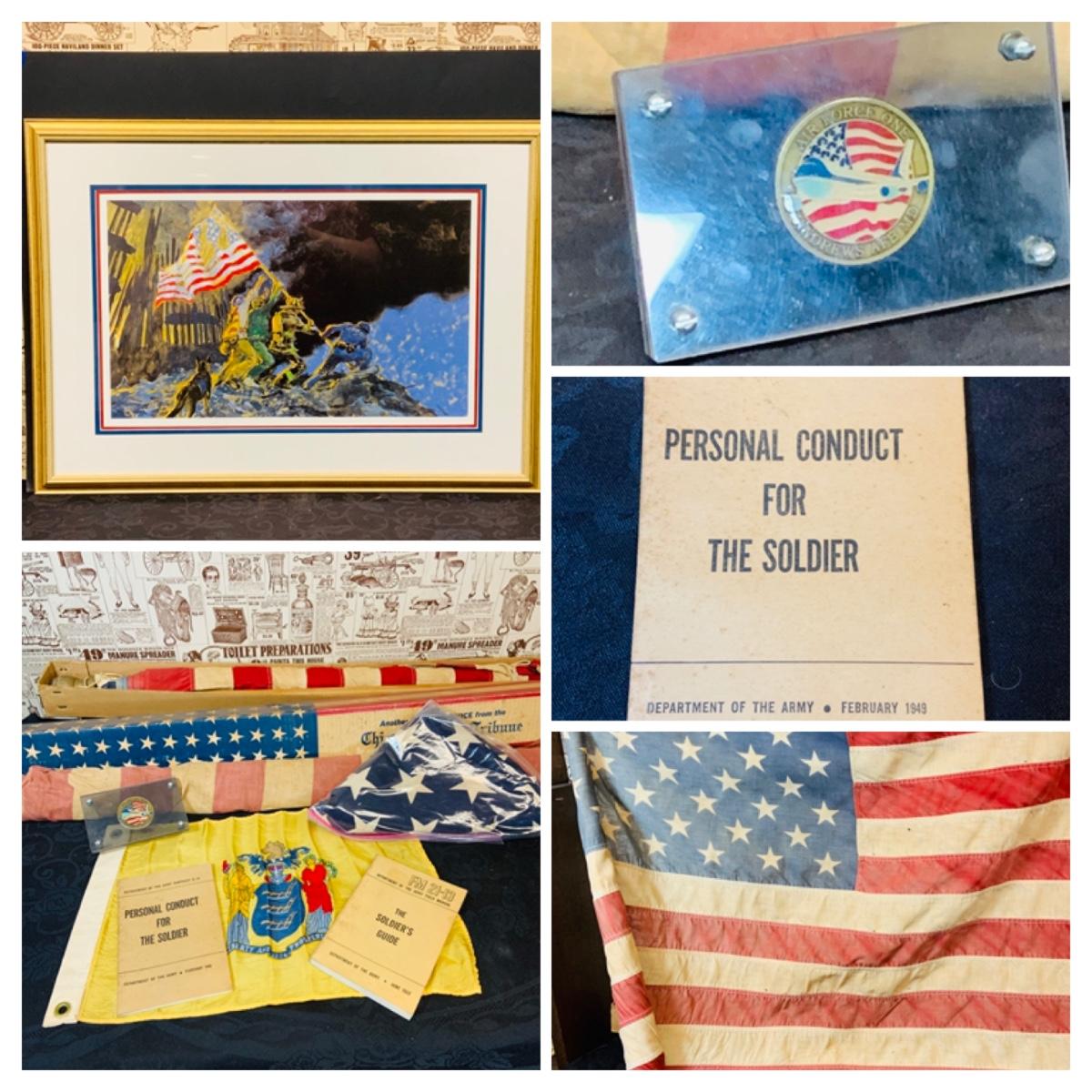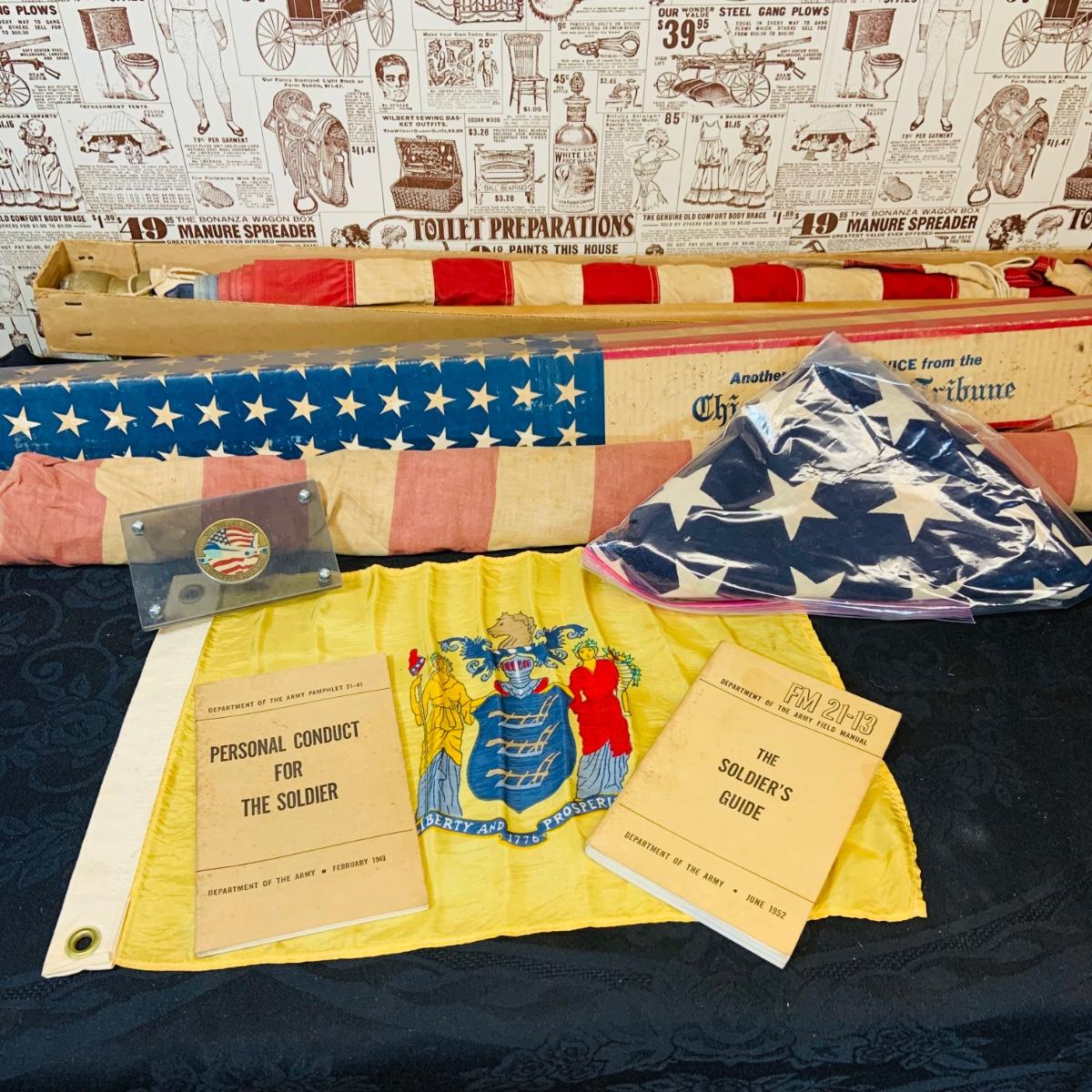 LOT 101: Patriotic Collection Featuring a Framed Jamie Wyeth 911 Wall Art, Vintage US Flags, New Jersey Flag, Army Pamphlets and More