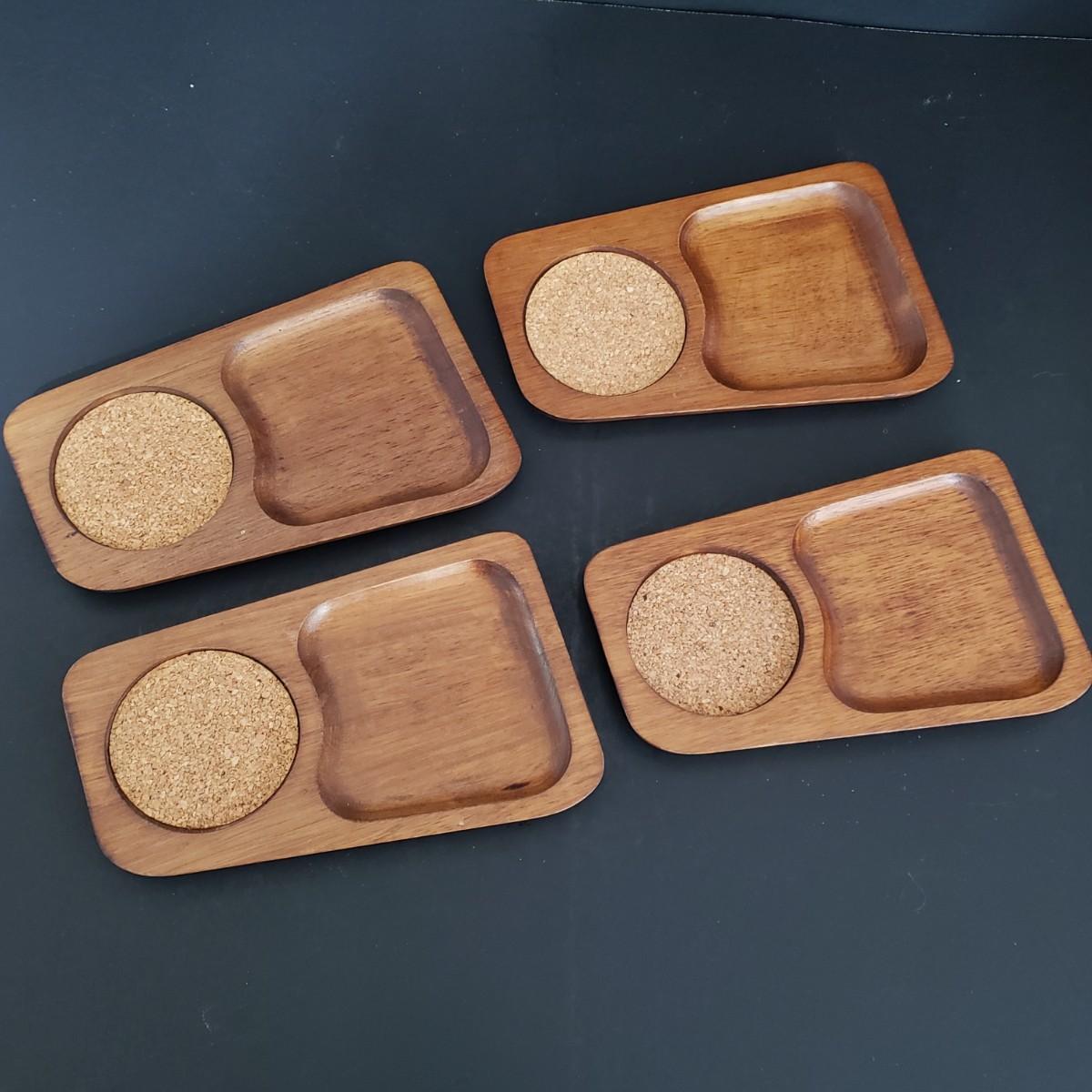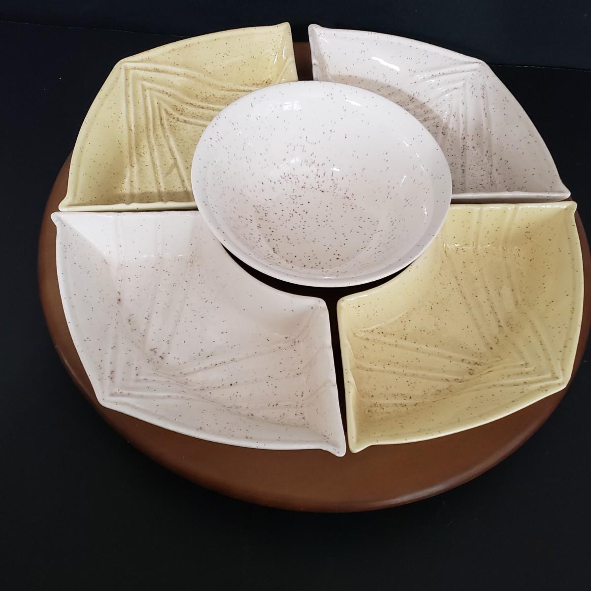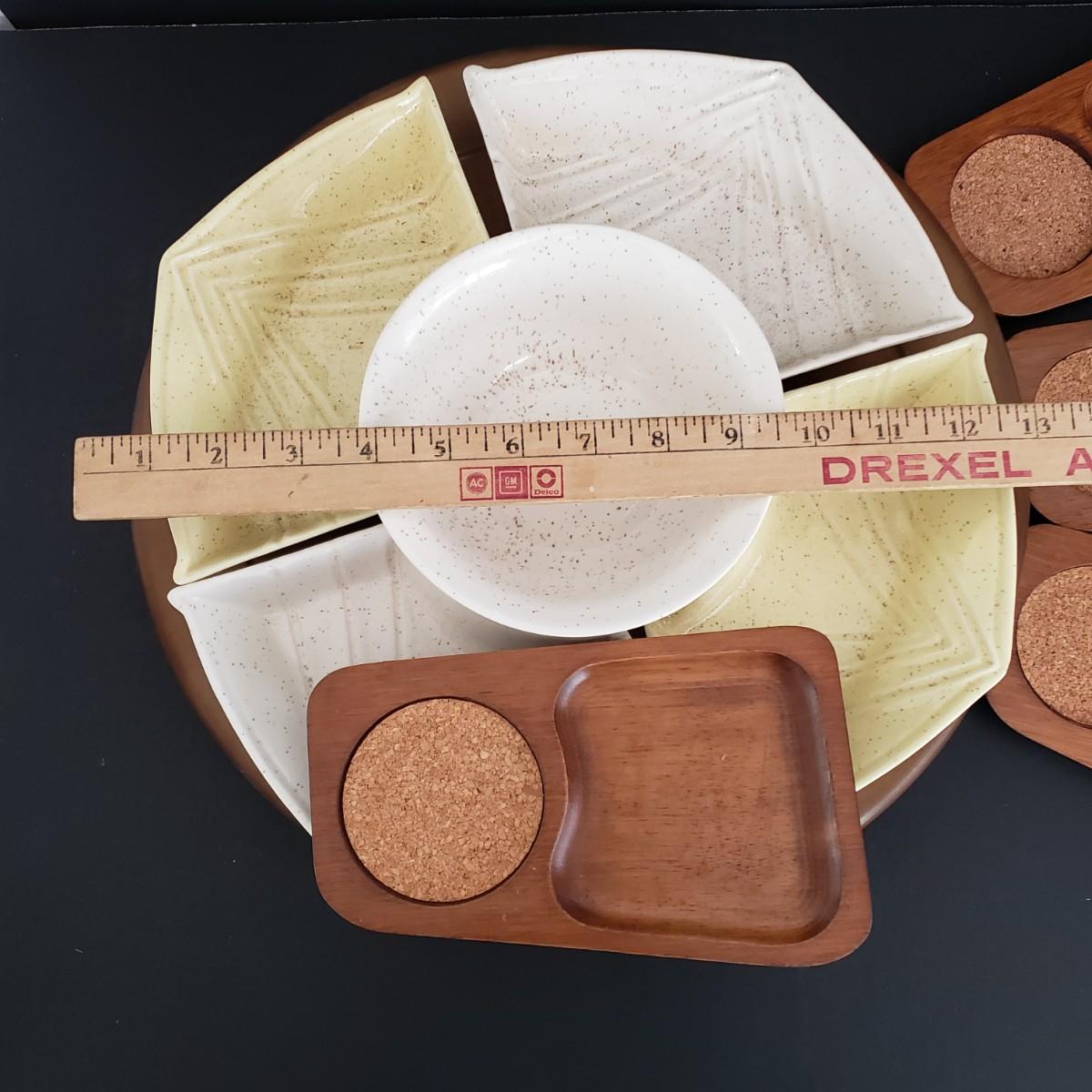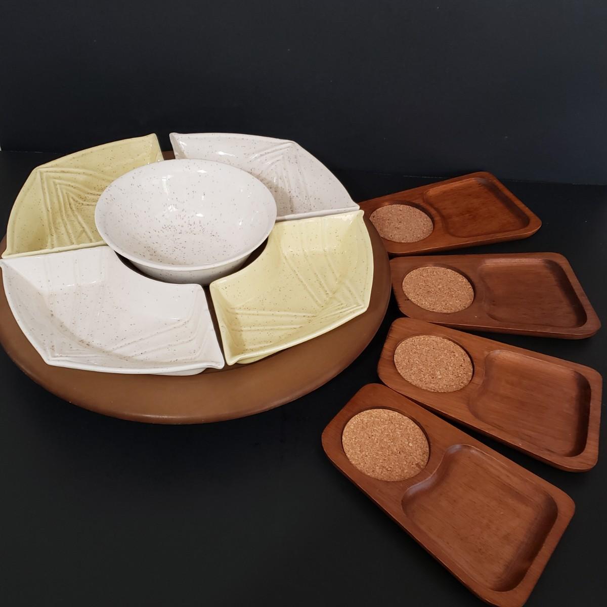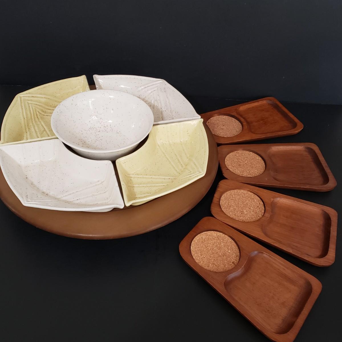 LOT 114: MCM Entertaining; California Pottery Lazy Susan and Teak Cork Coaster Snack Set