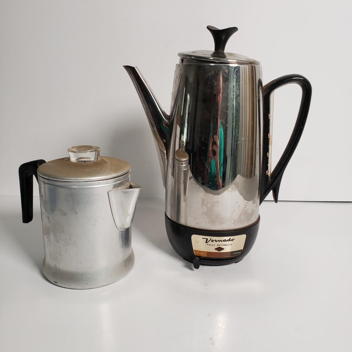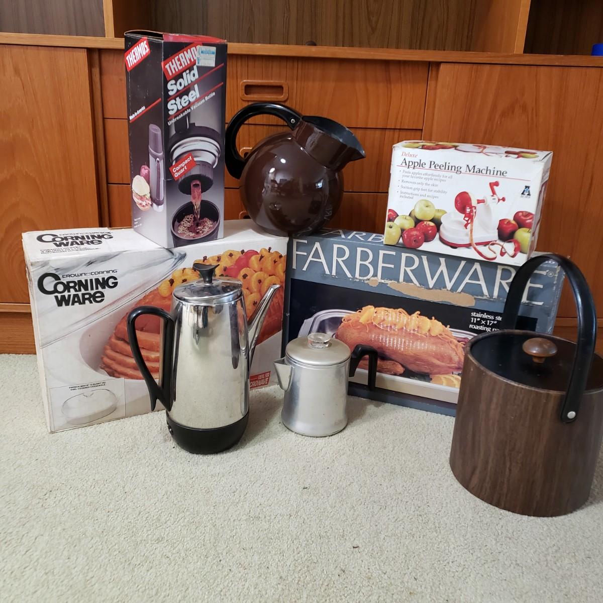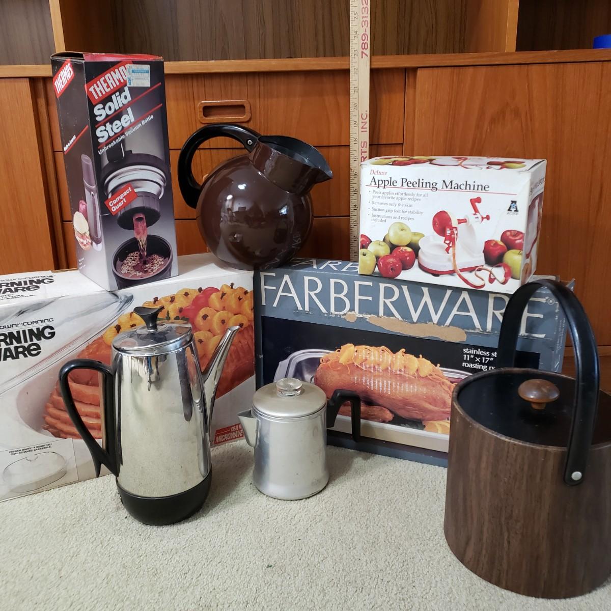LOT 126: Kitchen Collection: Corning Ware, Farberware, Apple Peeling Machine, Coffee Pots & More