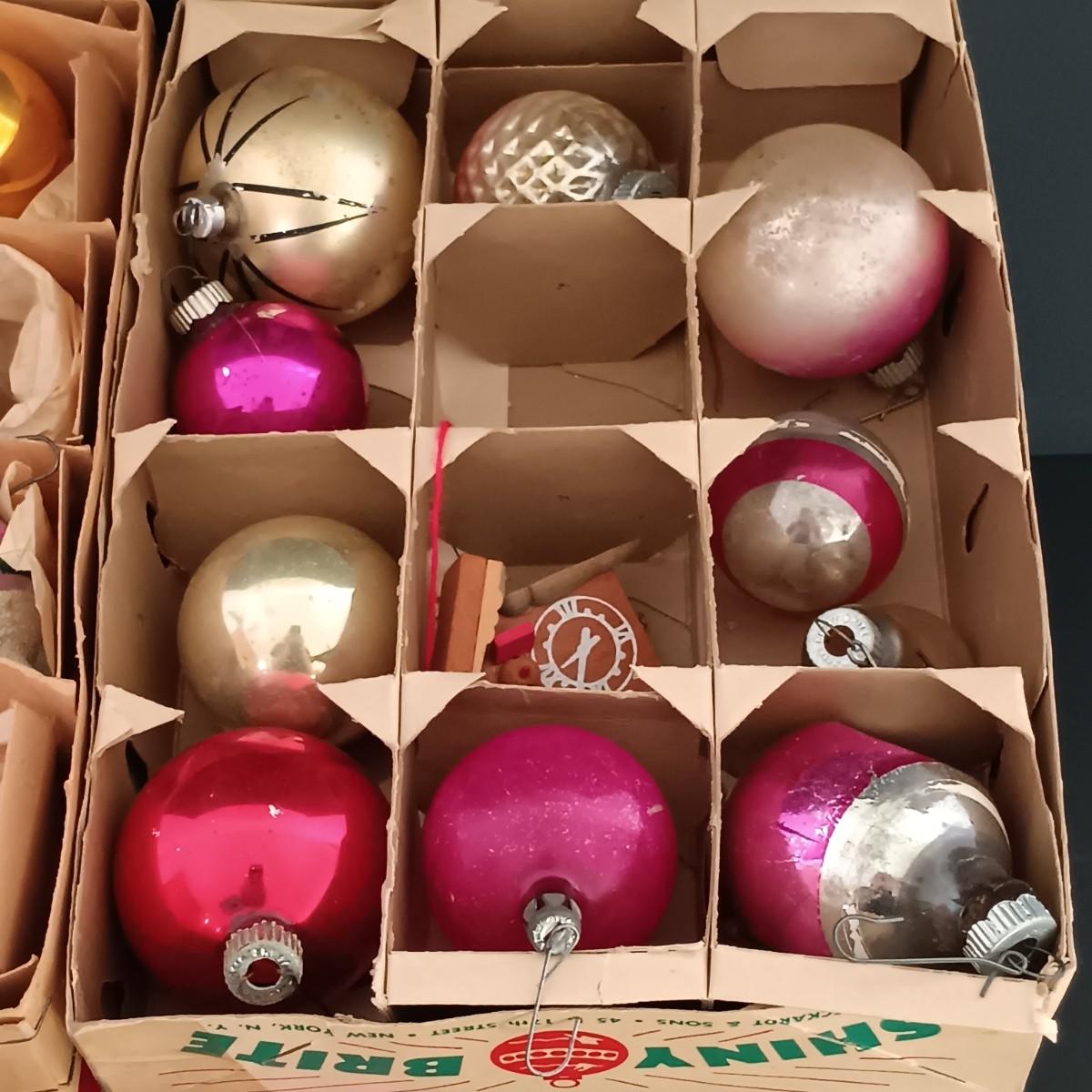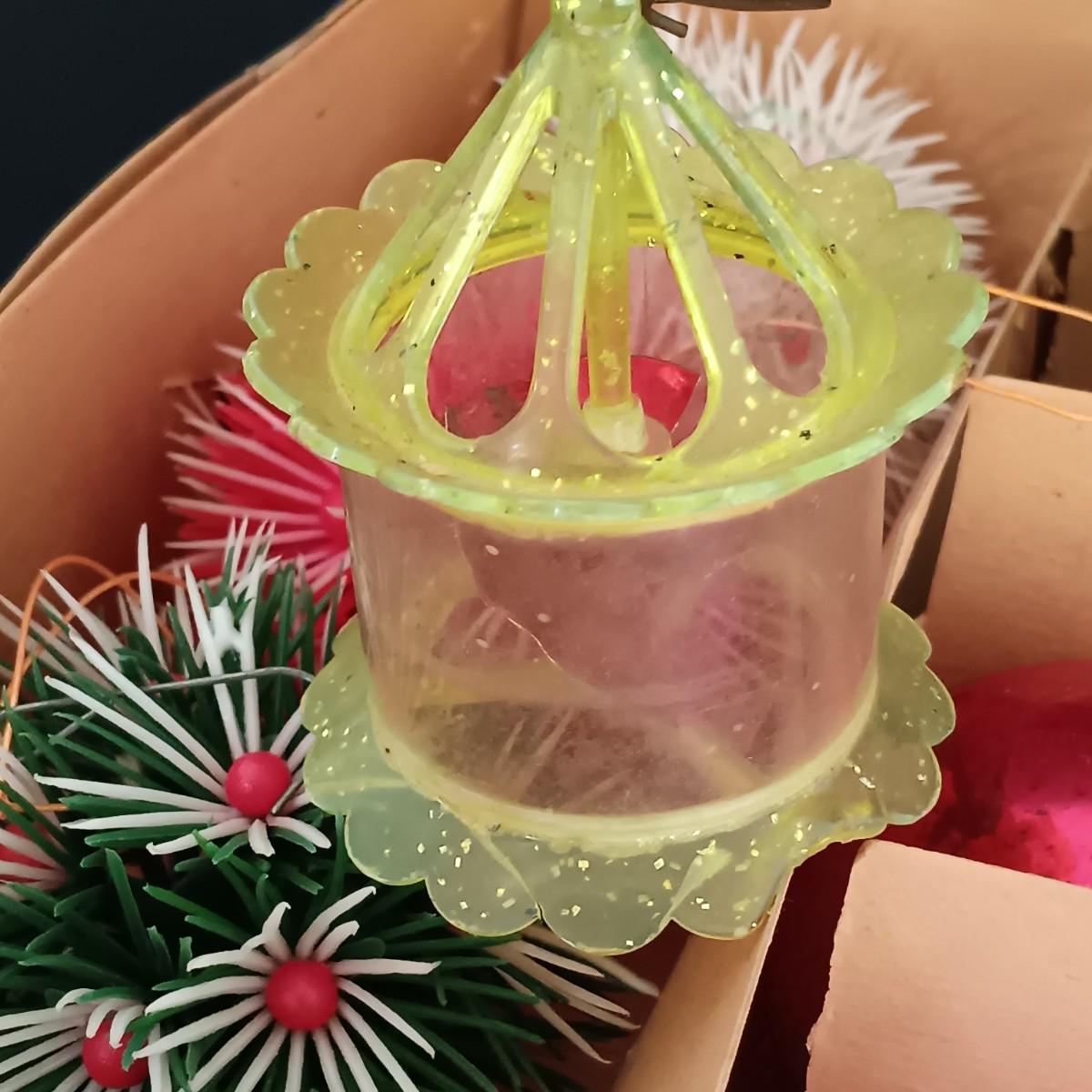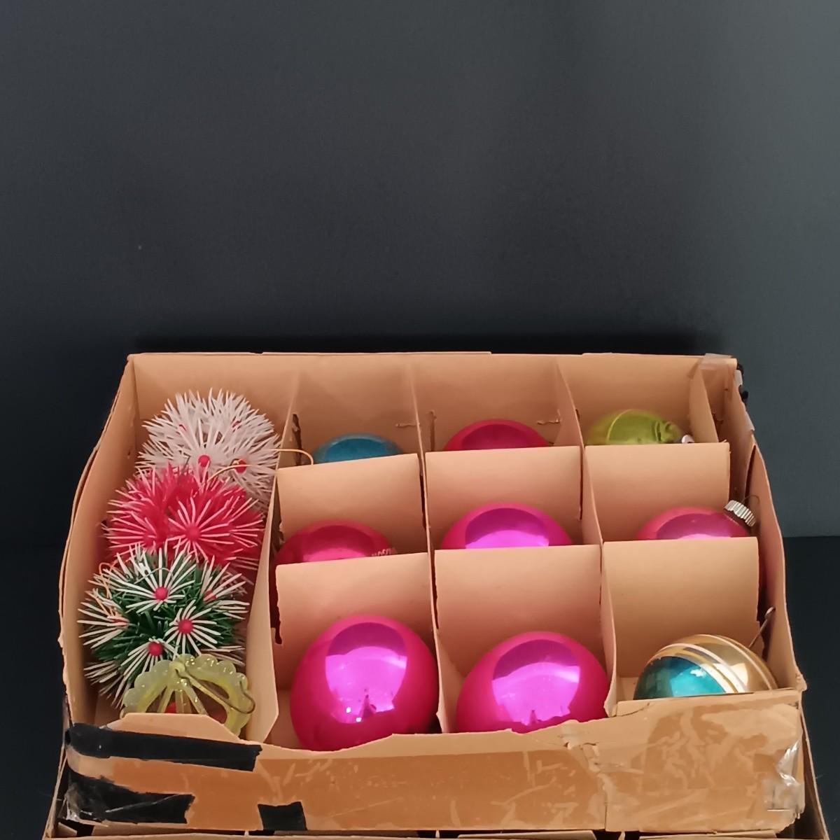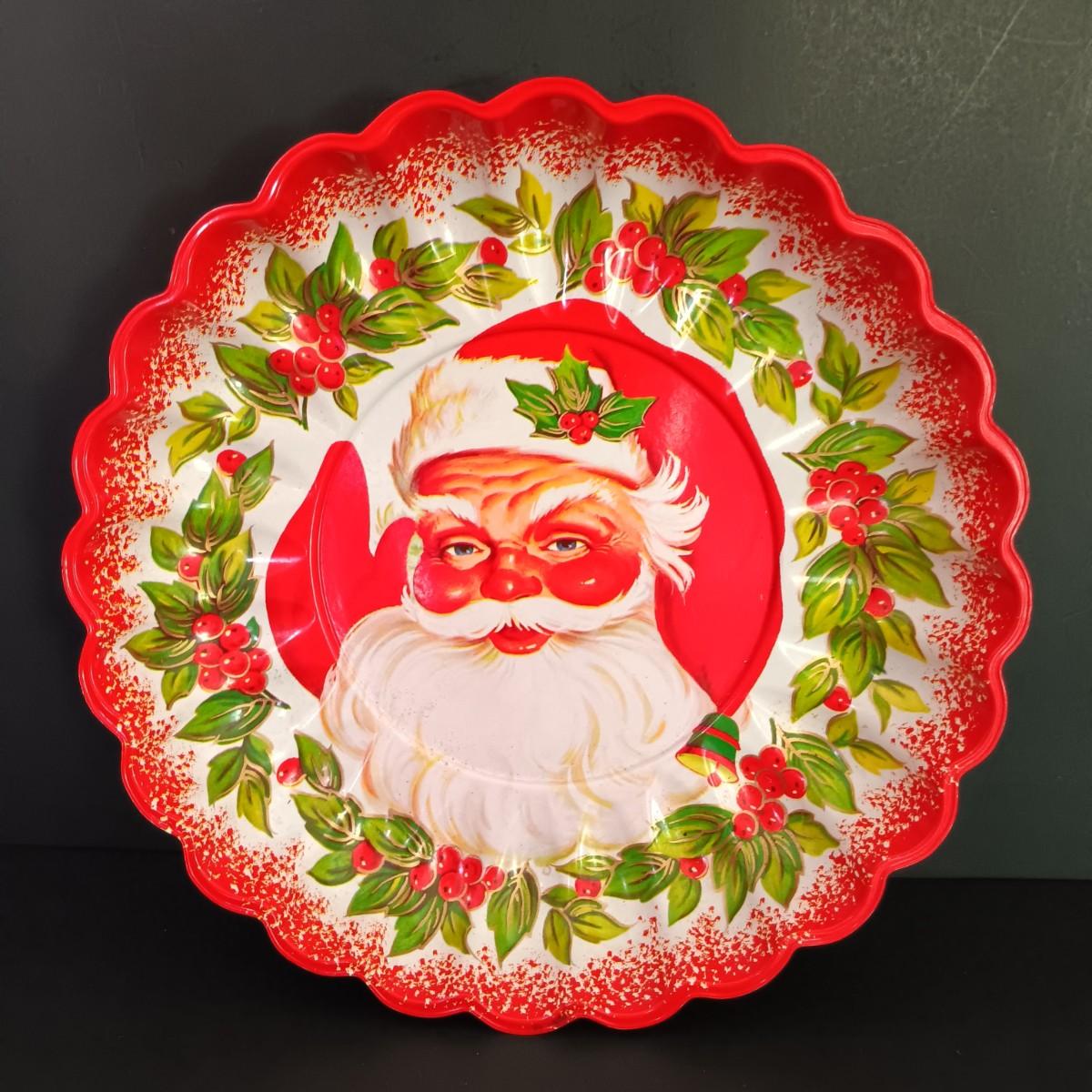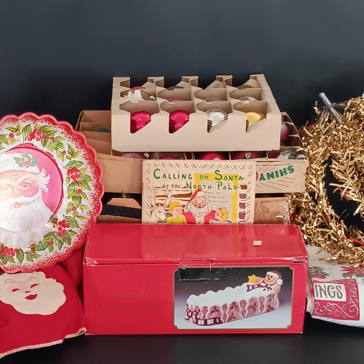 LOT 141: Vintage Christmas- Tinsel Ball, Ceramic Cookie Dish, Shiney Brites, Molded Plastic Santa Bowl & More