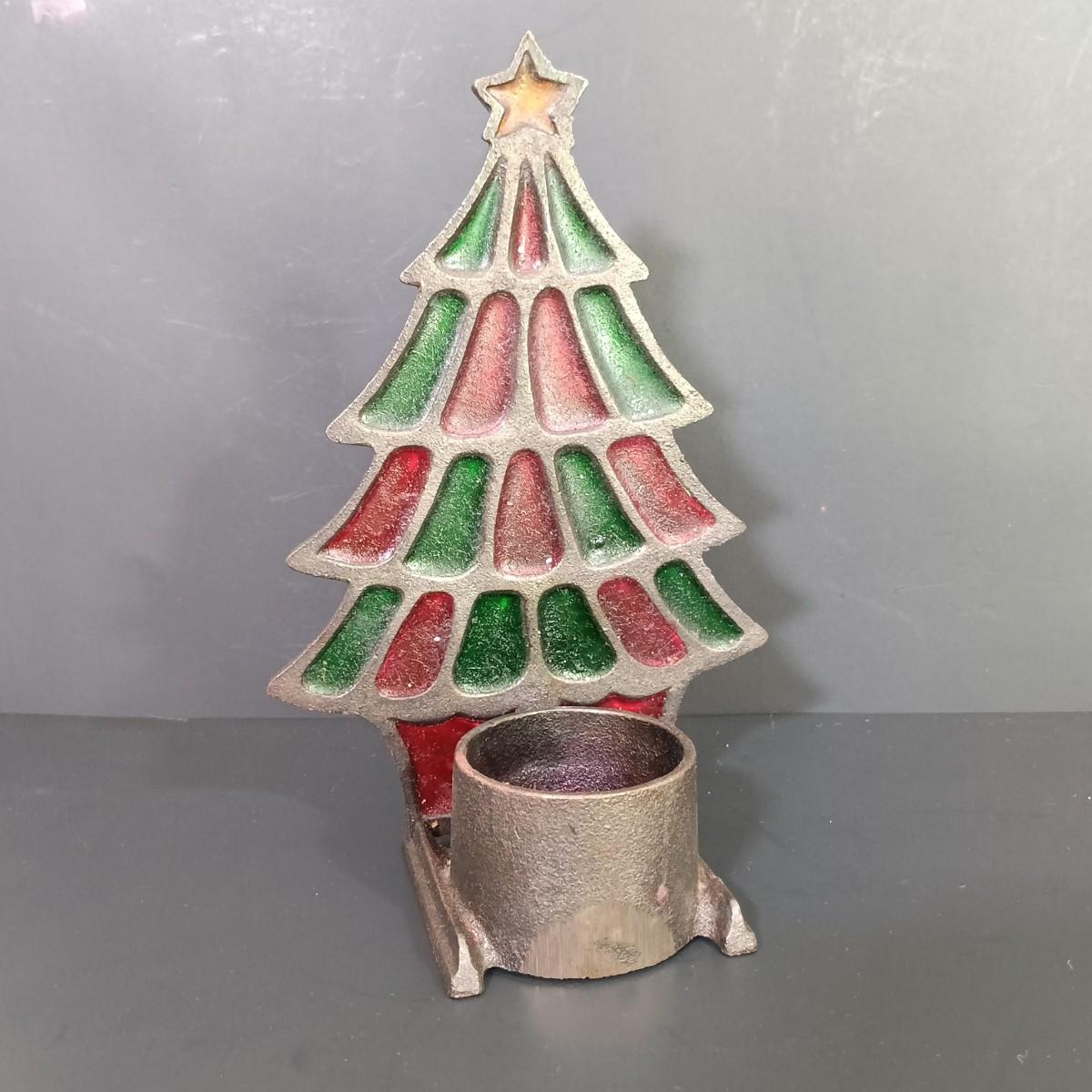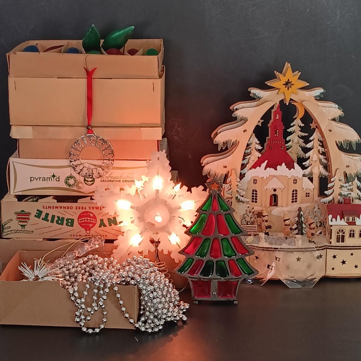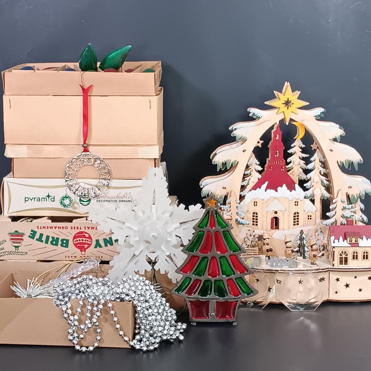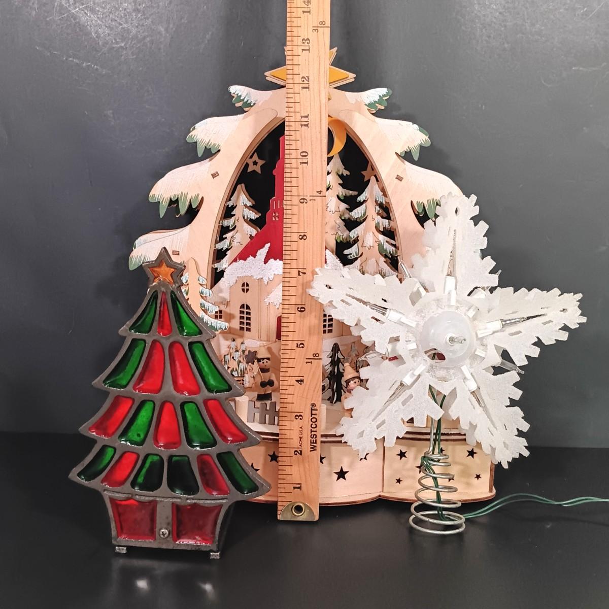 LOT 142: Vintage Christmas- Laser Cut Wood Winter Scene, R&R Imports Cast Iron and Stained Glass Candle Holder, Pyramid Ornaments & More