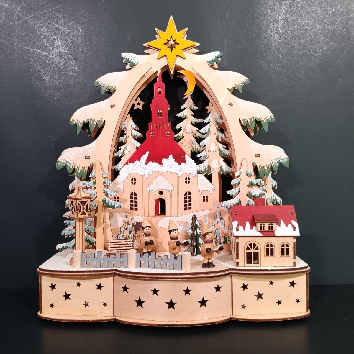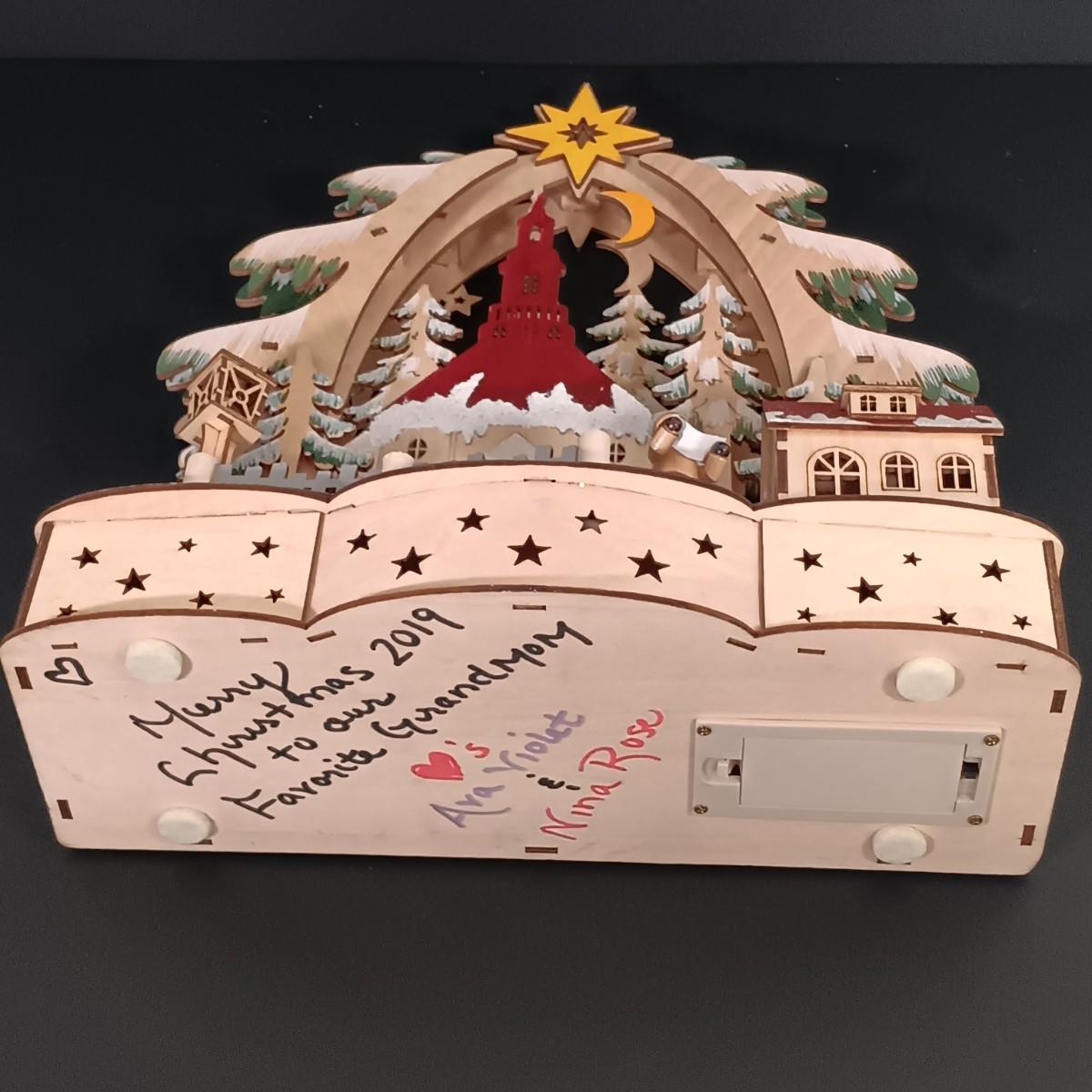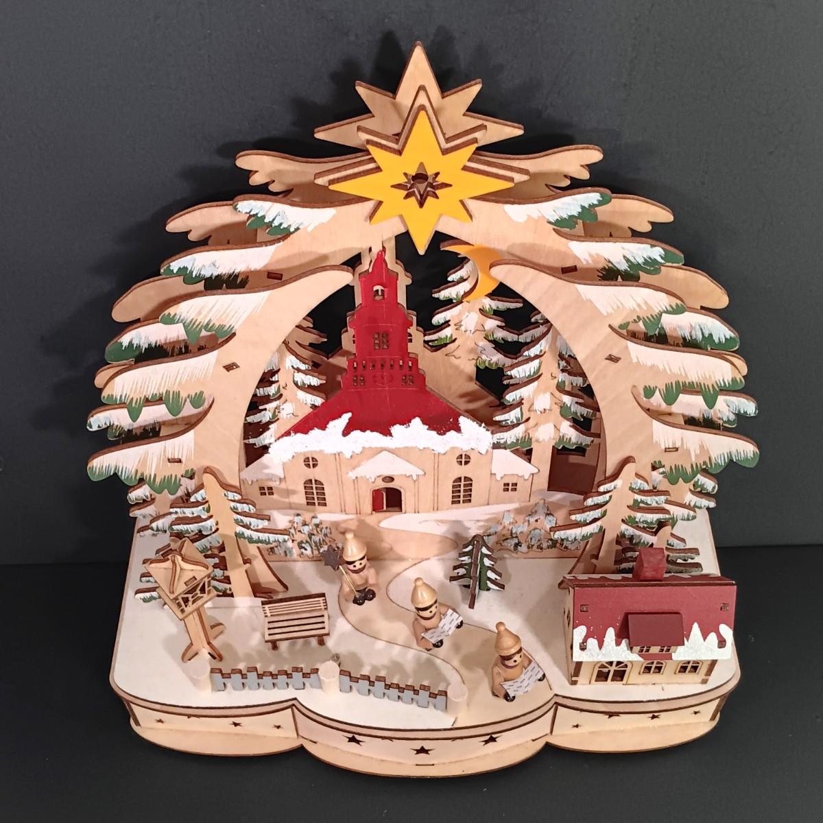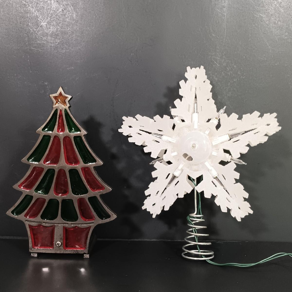 LOT 142: Vintage Christmas- Laser Cut Wood Winter Scene, R&R Imports Cast Iron and Stained Glass Candle Holder, Pyramid Ornaments & More