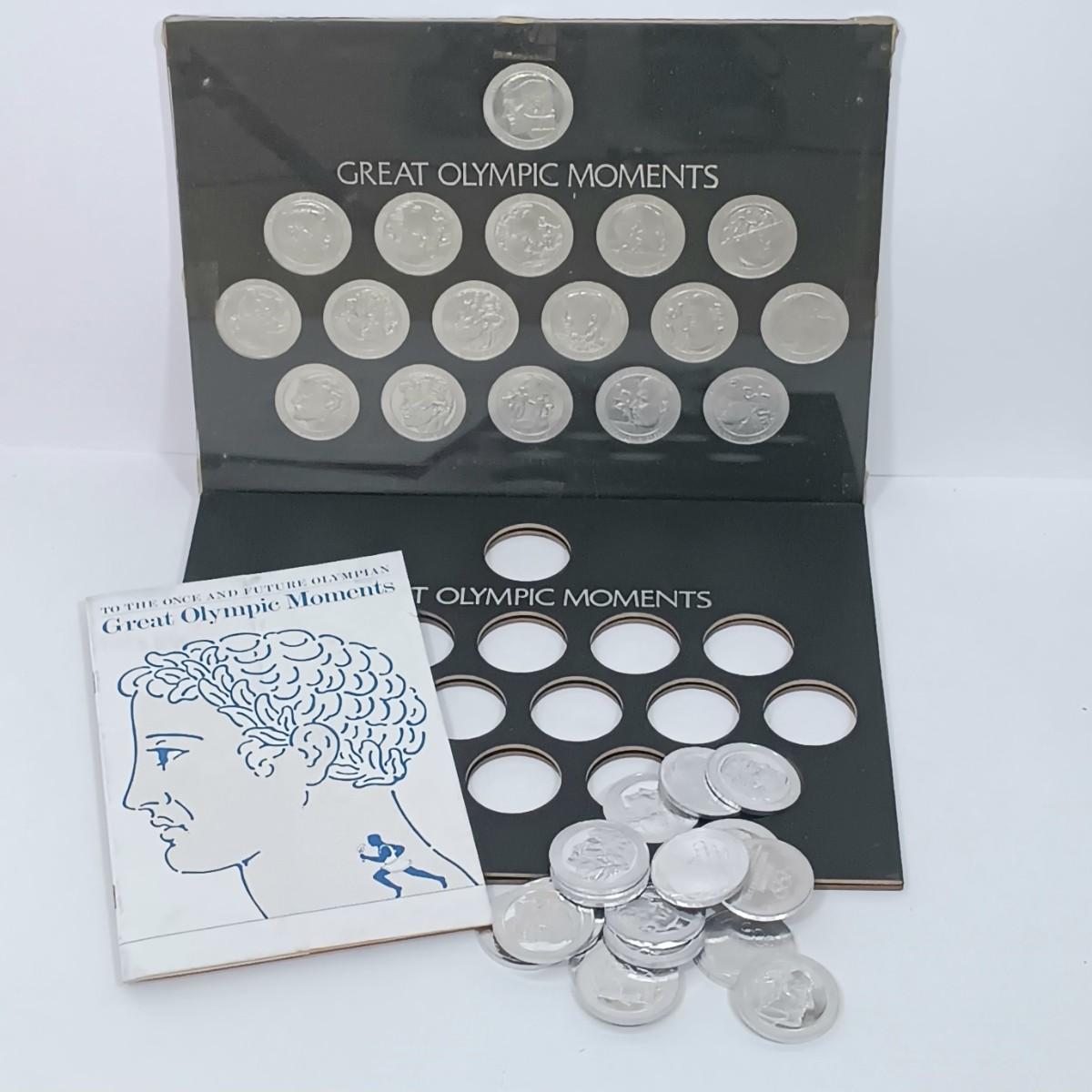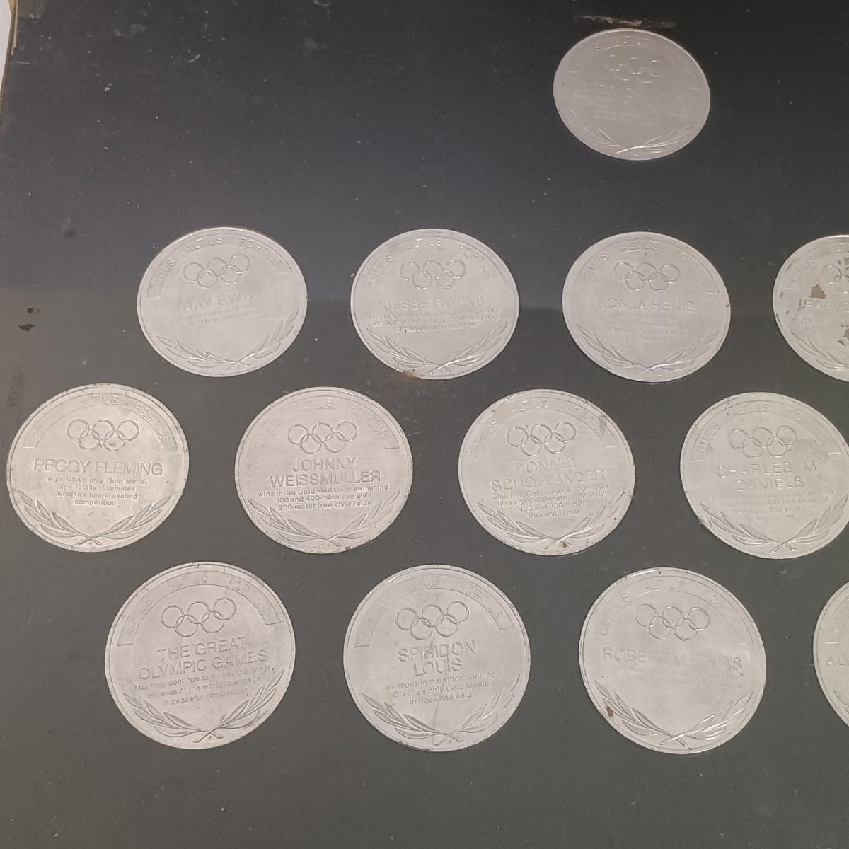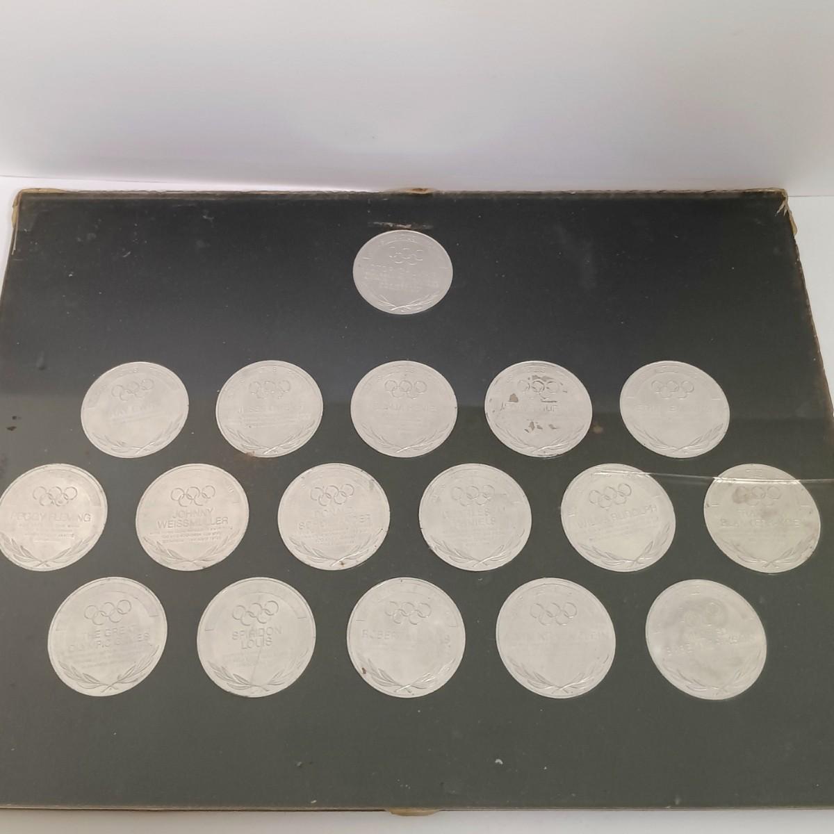 This is a vintage collectible set of 17 commemorative medals, sponsored by Coca-Cola, celebrating "Great Olympic Moments".