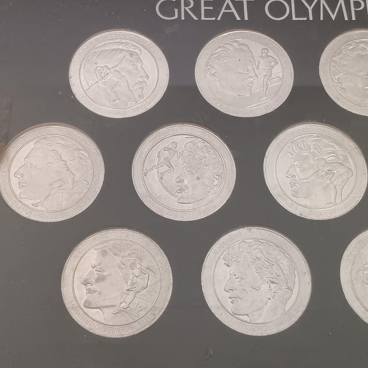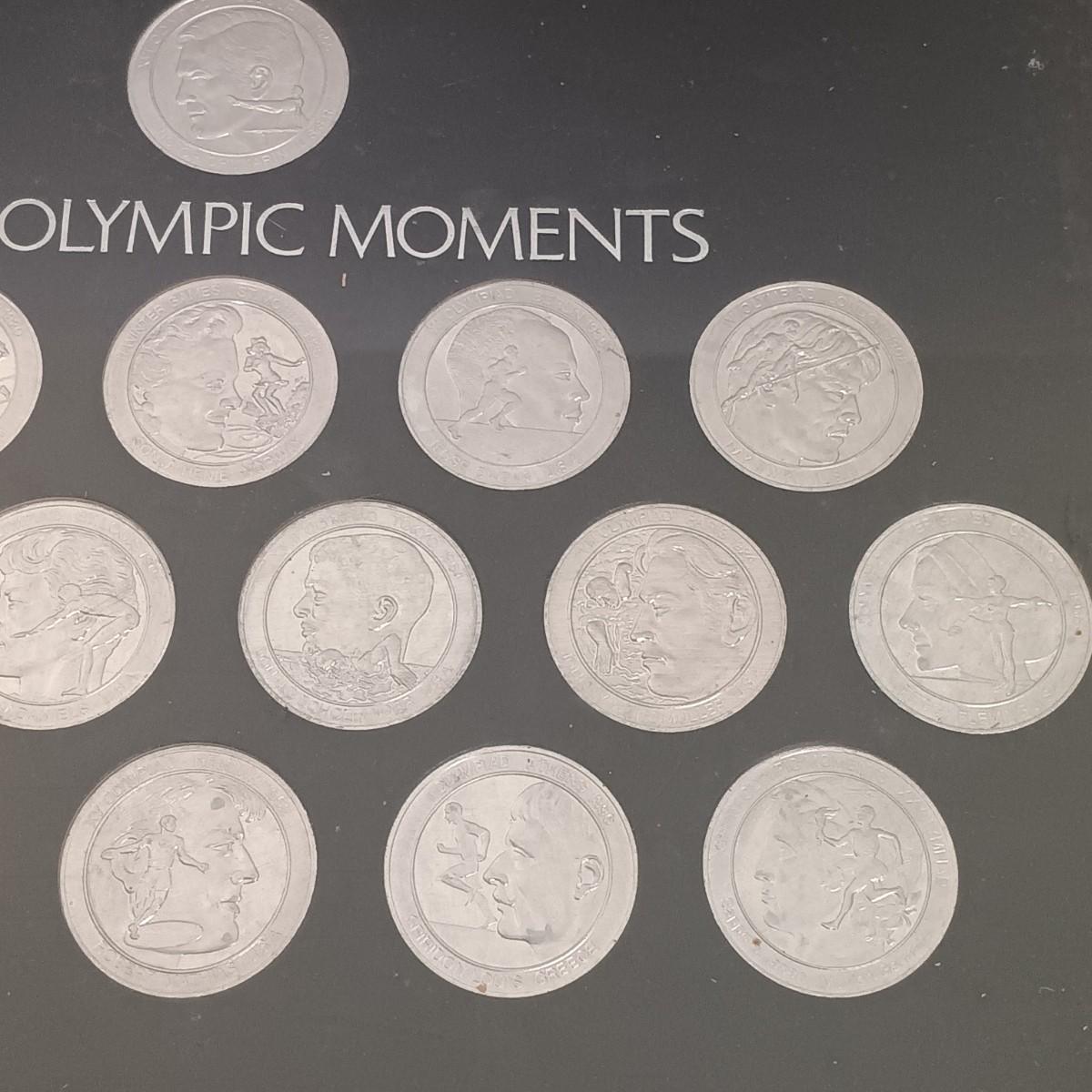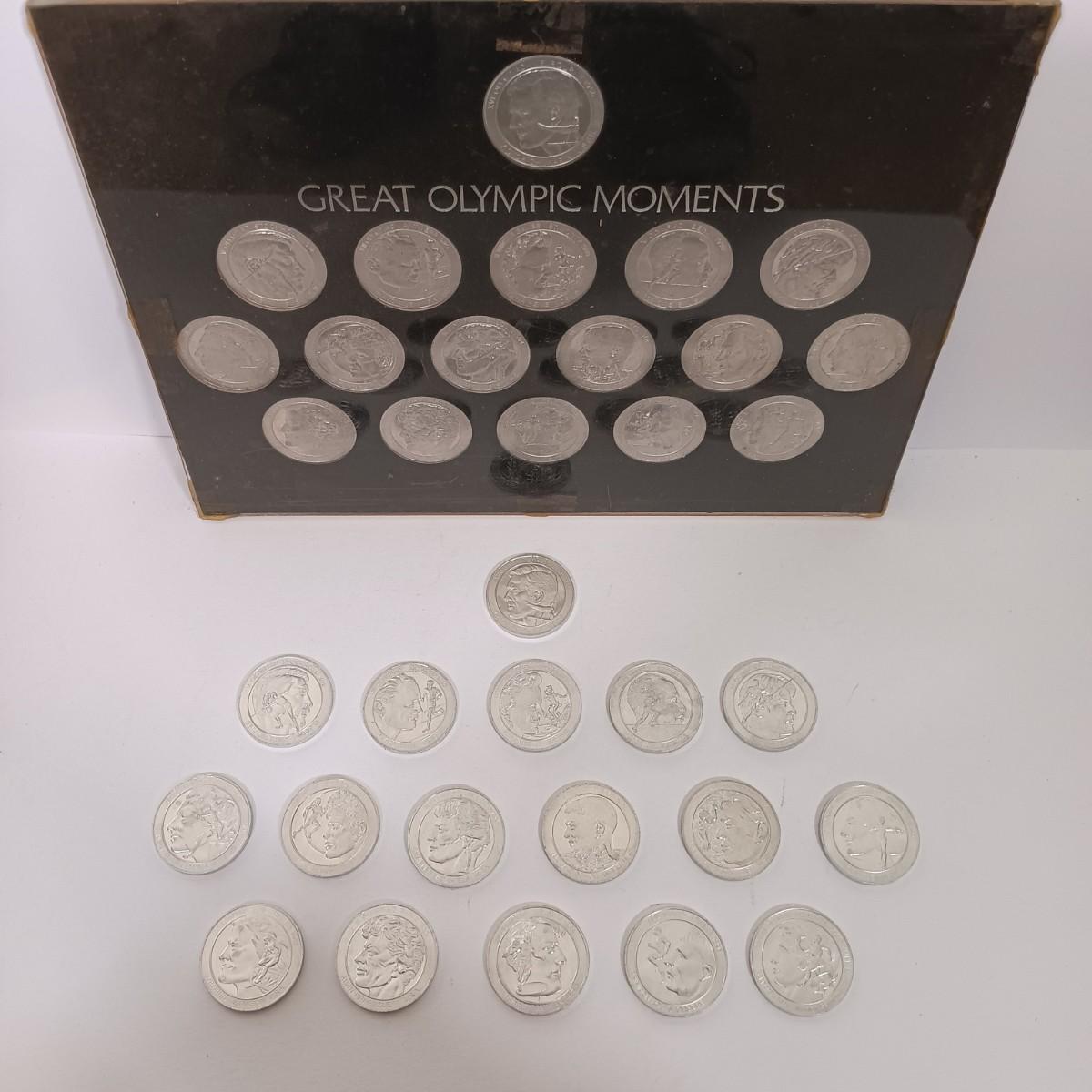 This is a vintage collectible set of 17 commemorative medals, sponsored by Coca-Cola, celebrating "Great Olympic Moments".