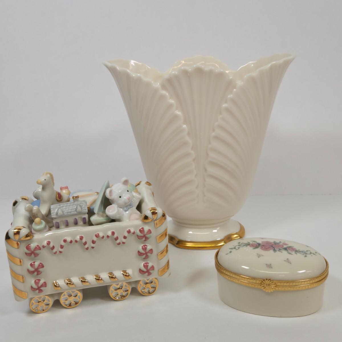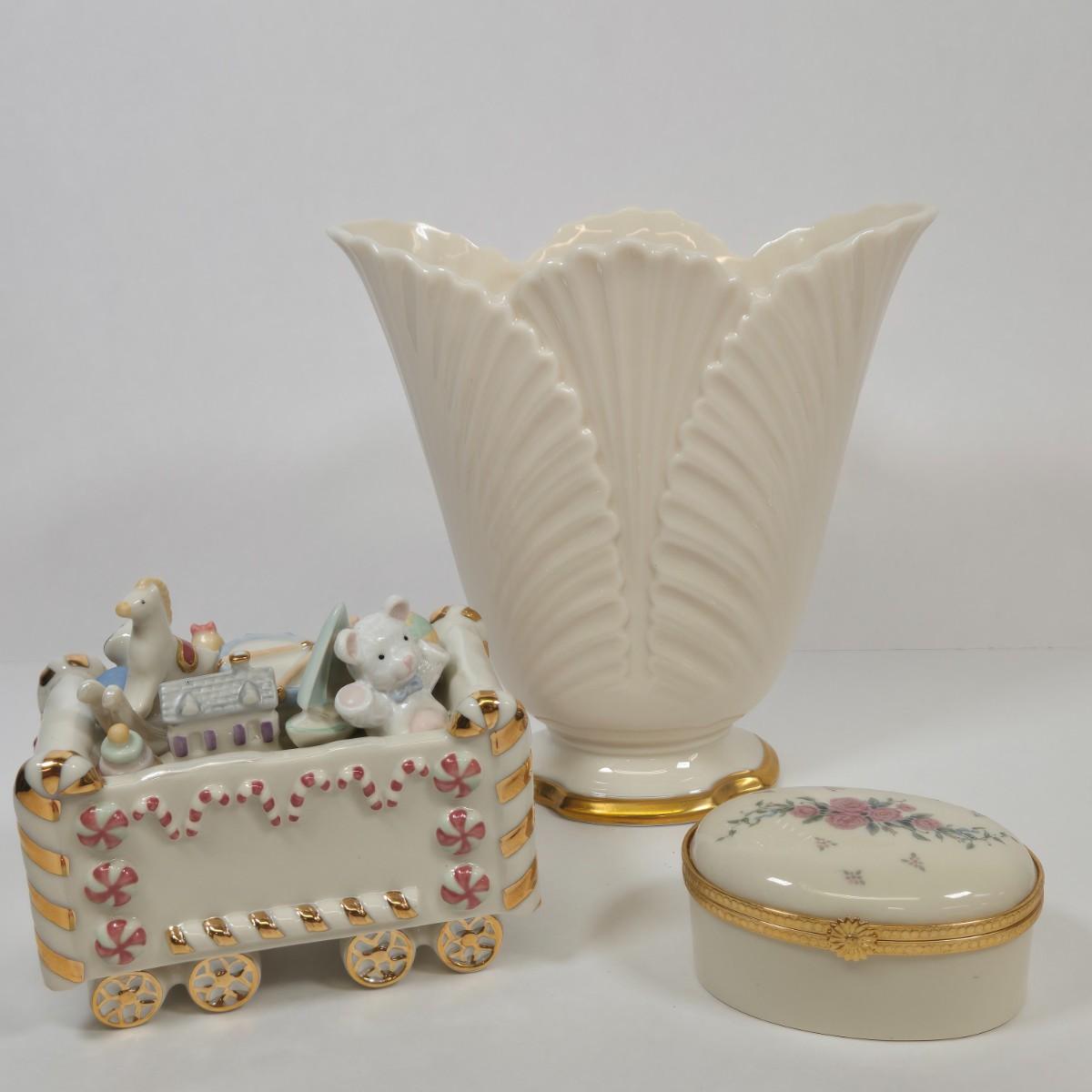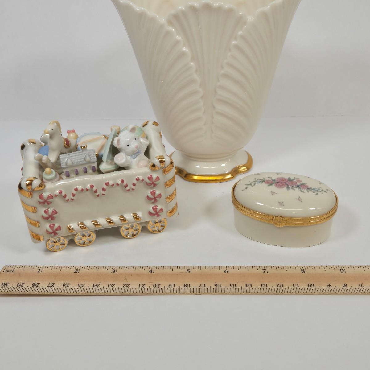 LOT 7: Lenox Corinthian Collection Vase, Train Toy Car, and Petite Rose Oval Hinged Trinket Box