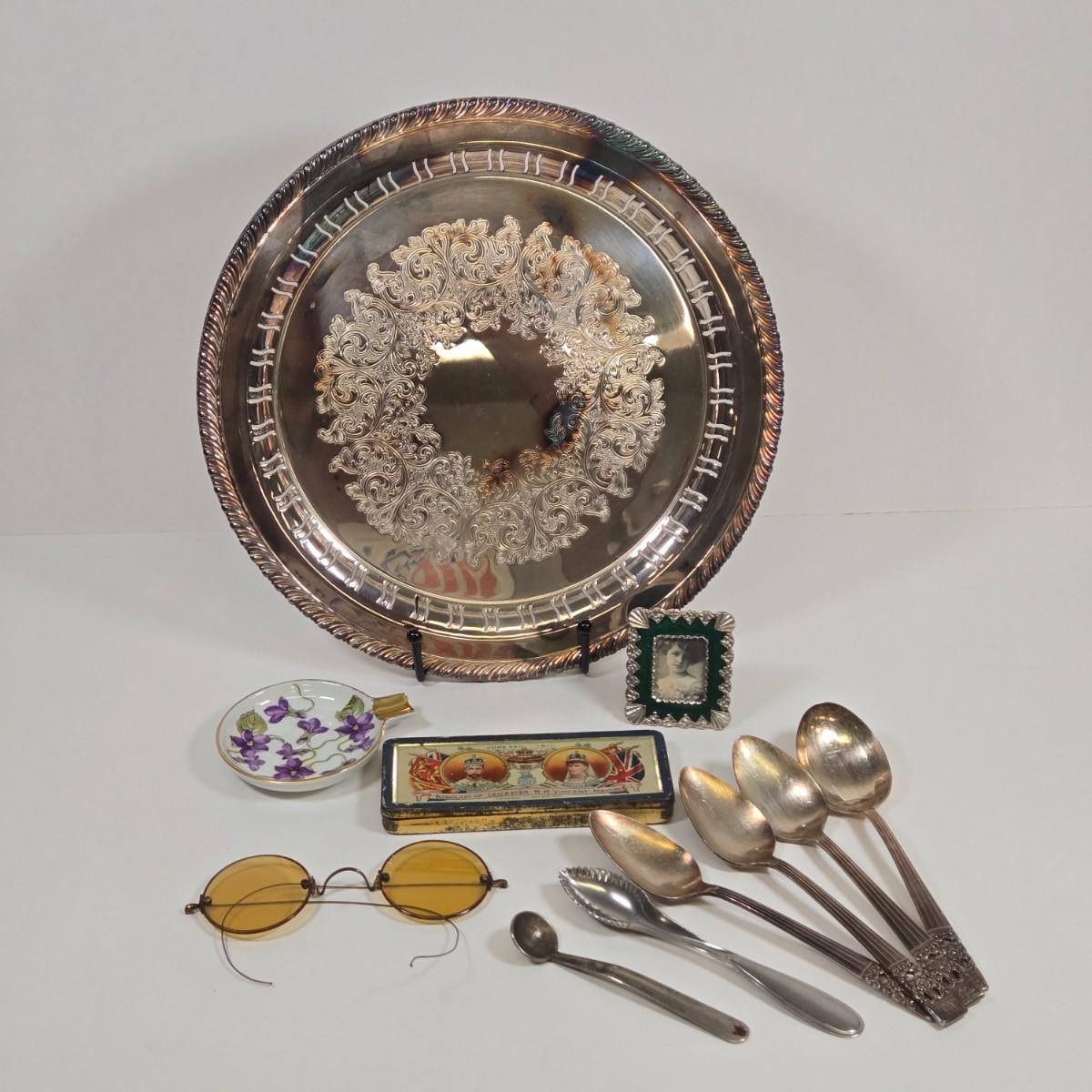 LOT 19: Wm. A. Rogers Serving Tray, Miniature Picture Frame, Mitterteich Bavaria Personal Ashtray, Vintage Art Deco Sunglasses, and More