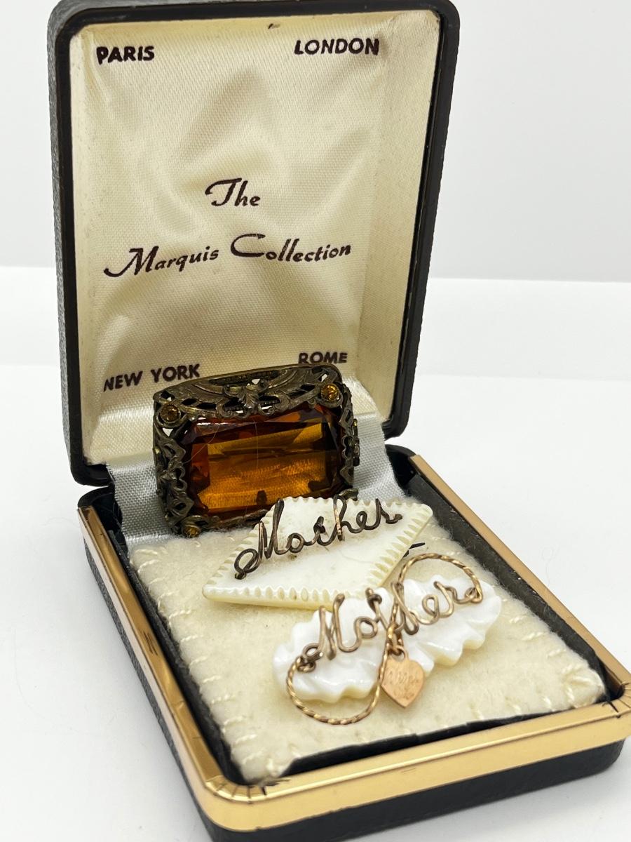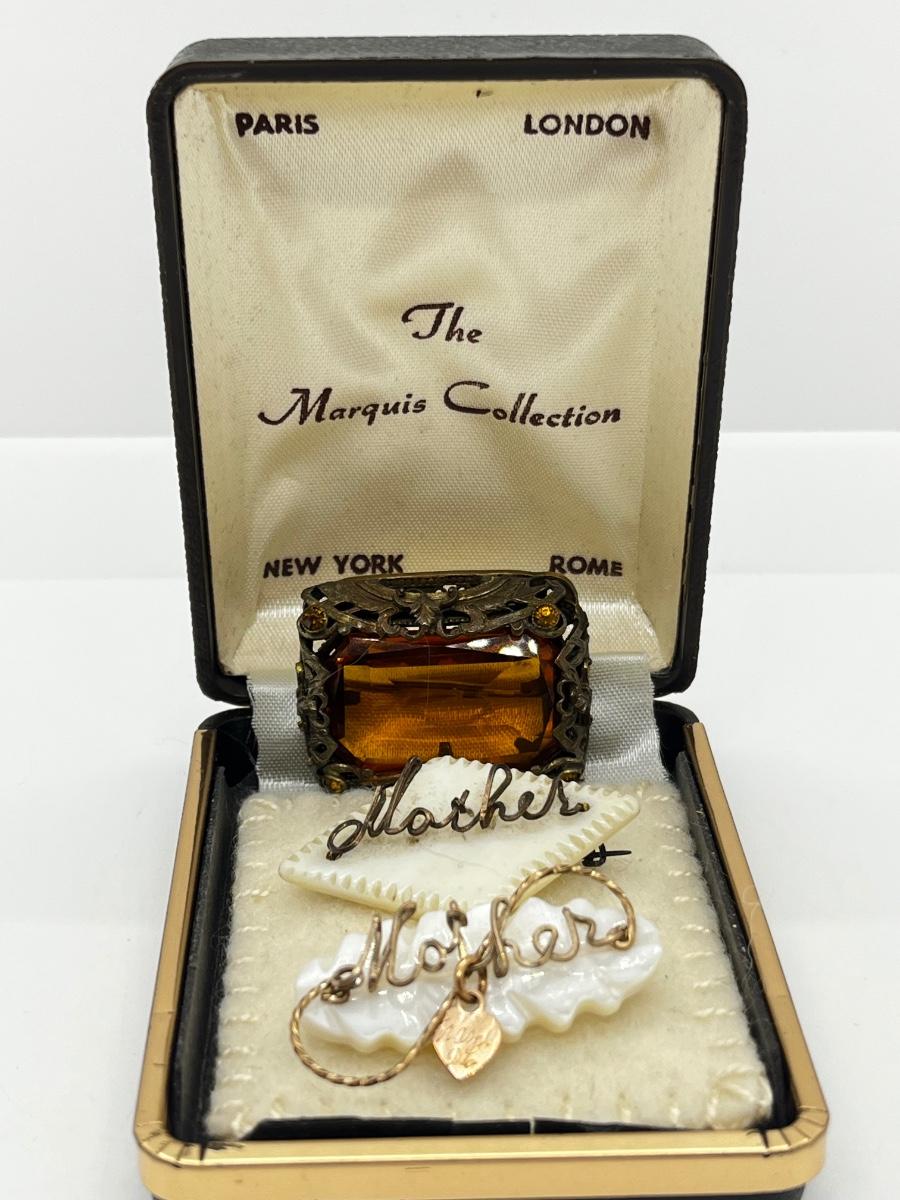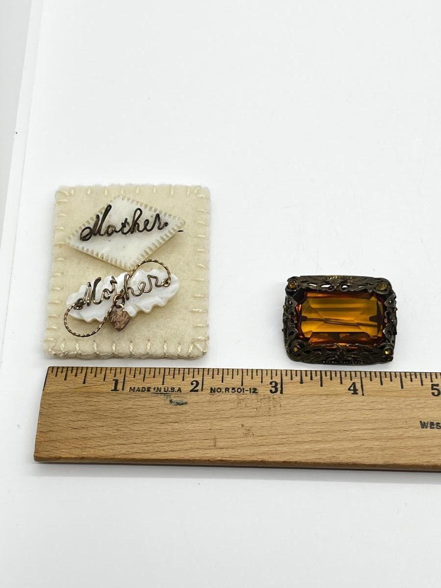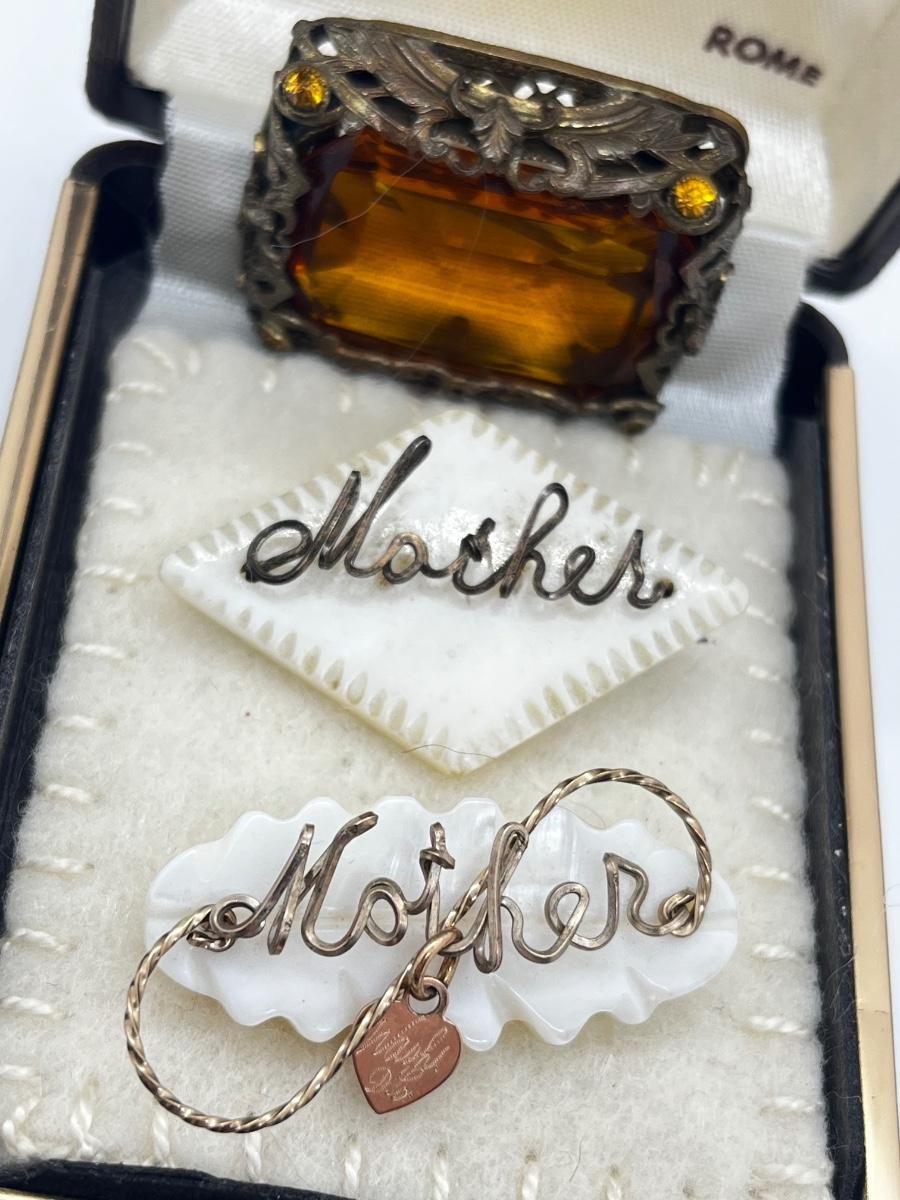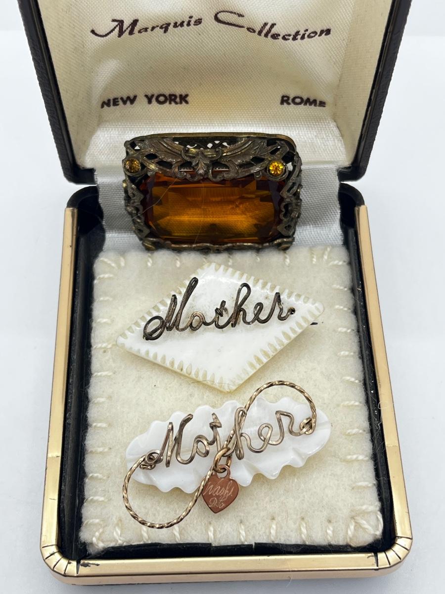 LOT 162J: Two Vintage Wire Wrapped Mother of Pearl "Mother" Pins and a Vintage Art Glass "Citrine" Rhinestone Brooch