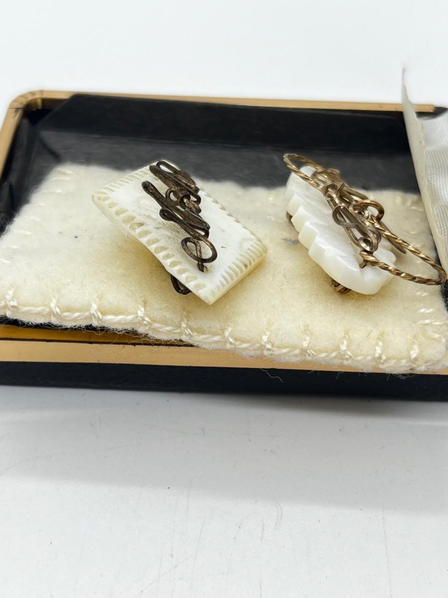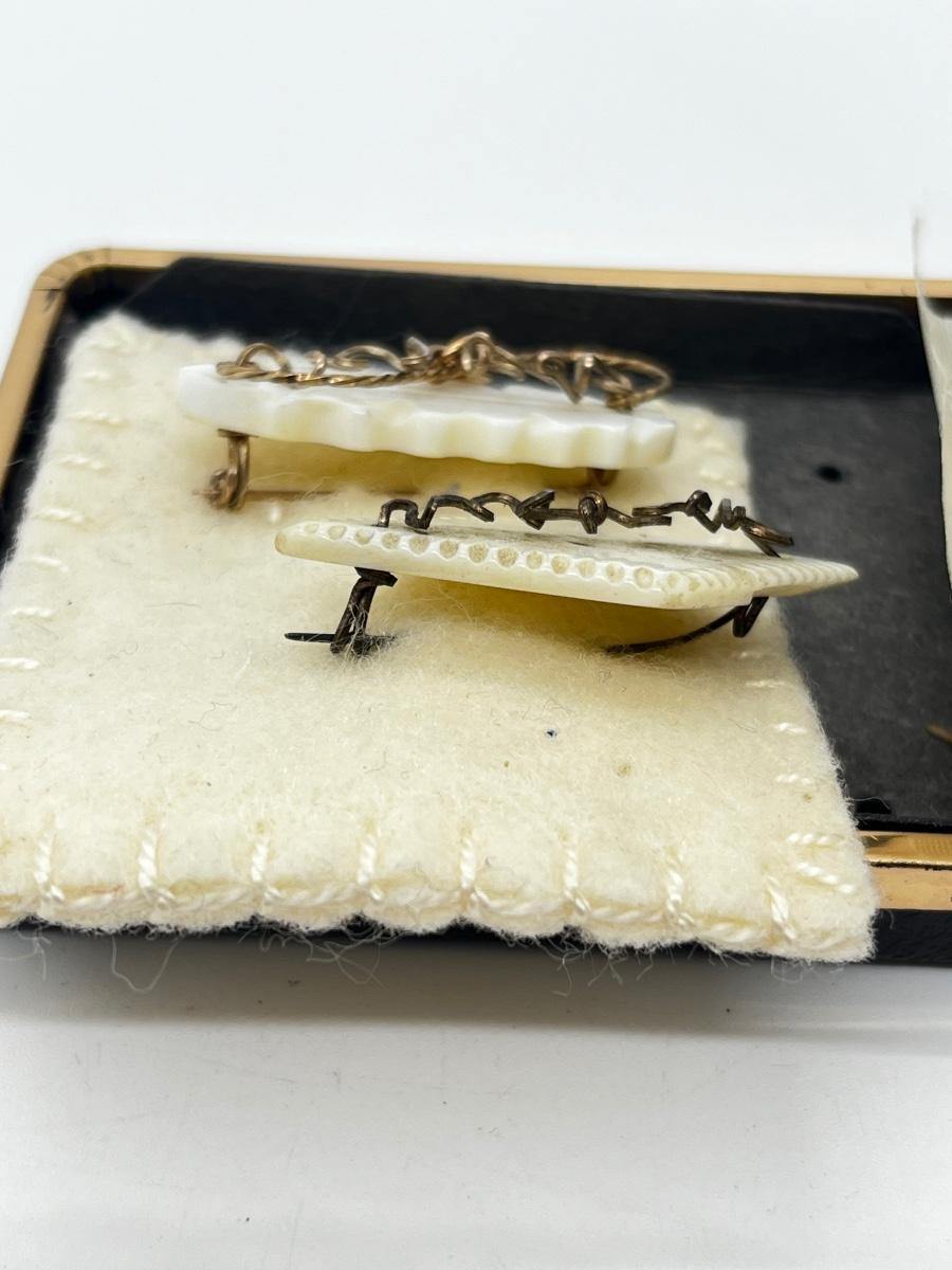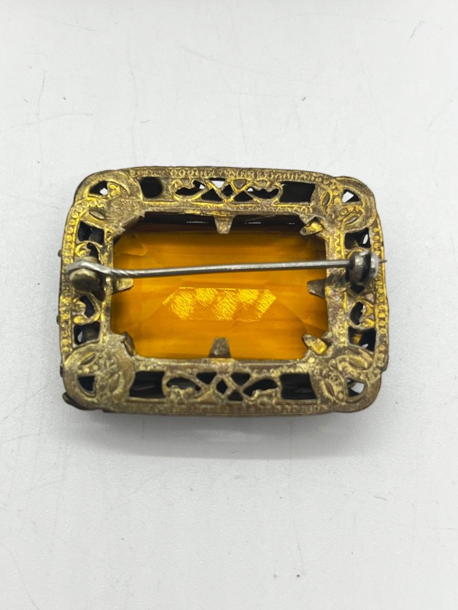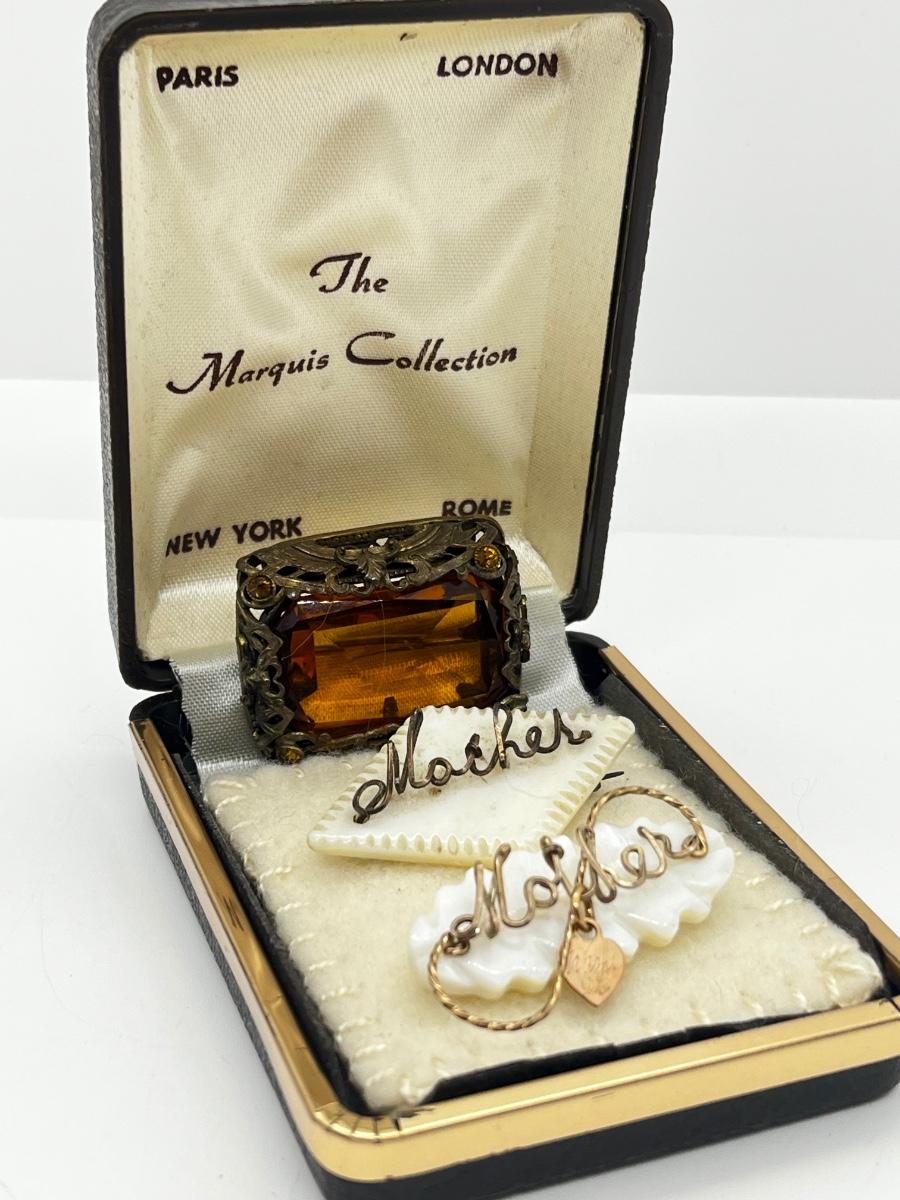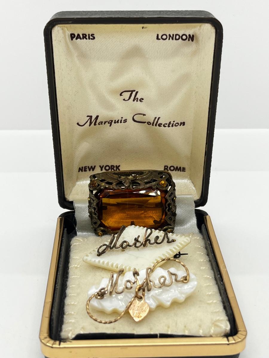 LOT 162J: Two Vintage Wire Wrapped Mother of Pearl "Mother" Pins and a Vintage Art Glass "Citrine" Rhinestone Brooch