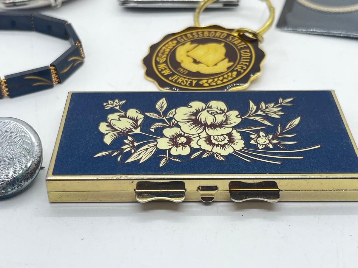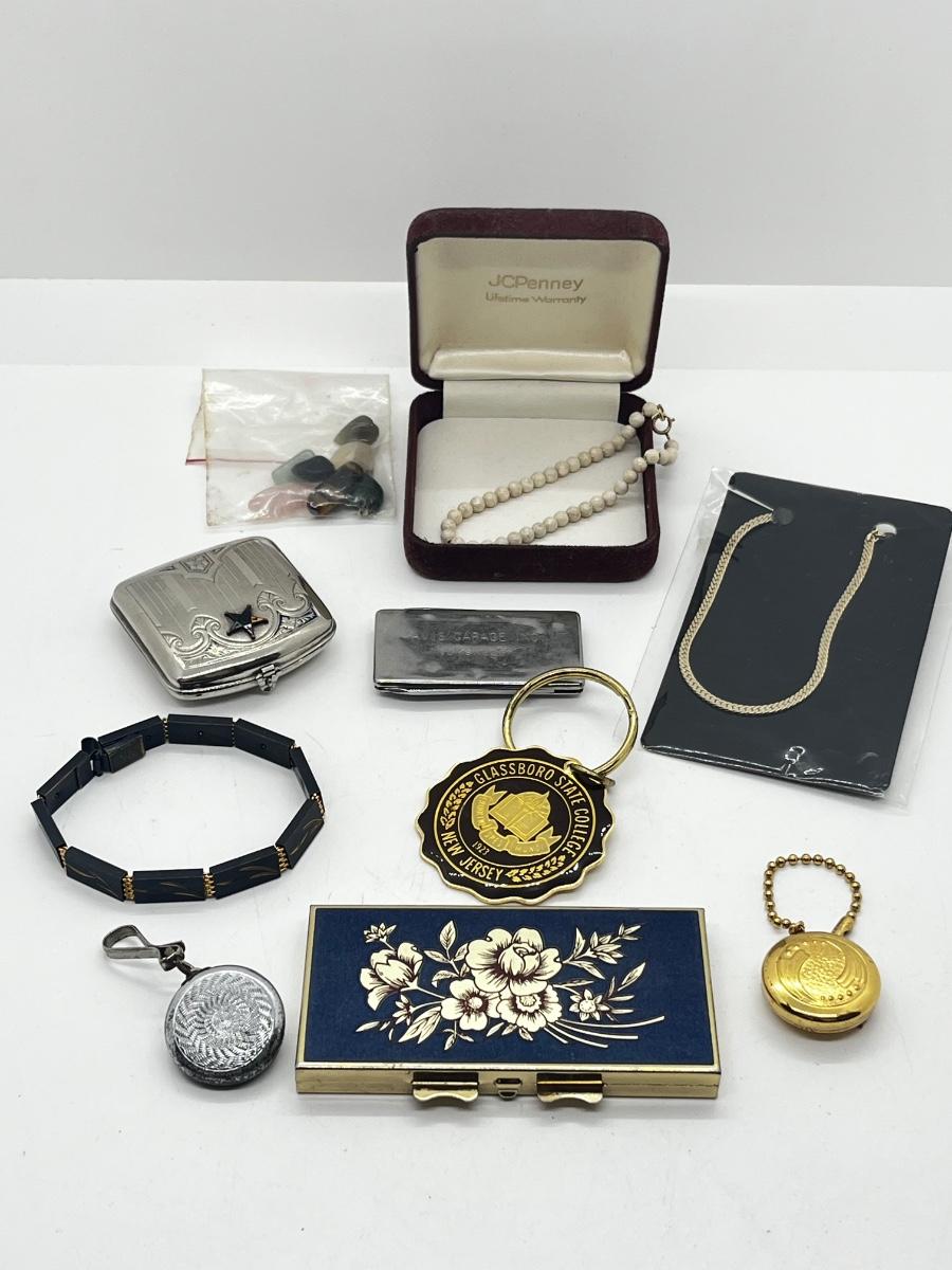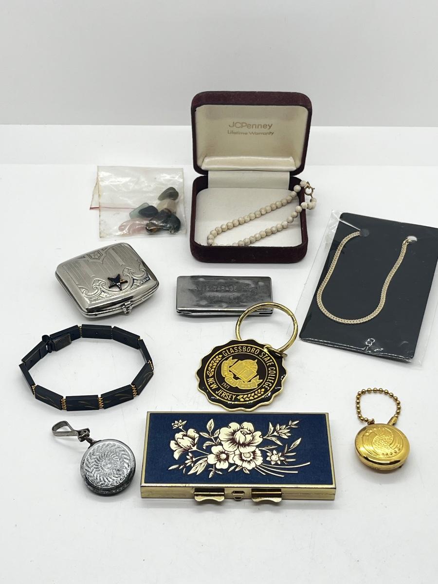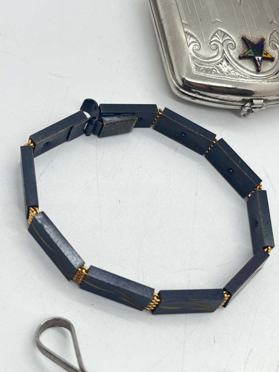 LOT 177J: 14K Gold Filled Natural Stone Bracelet, Black and Gold Metal Bracelet, Eastern Star Compact, Pill Box and More