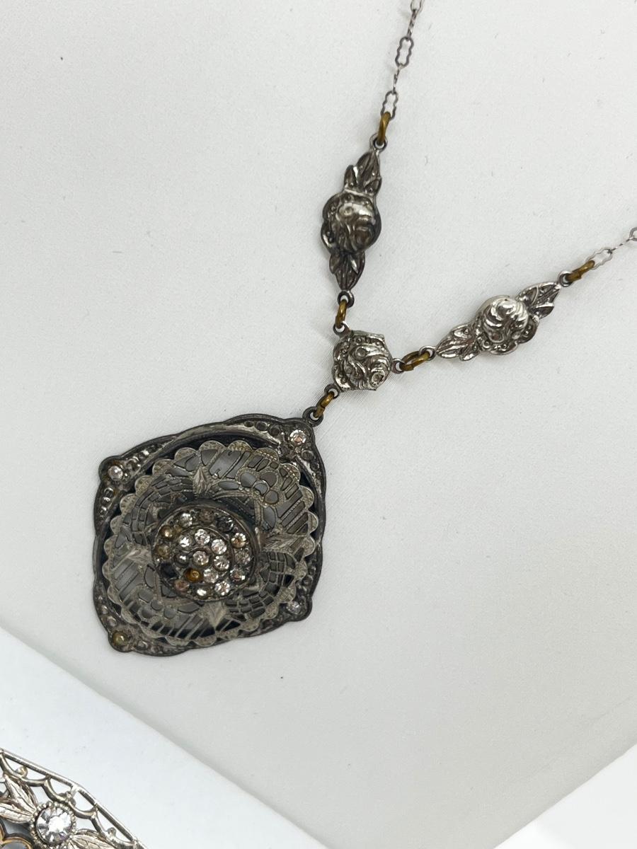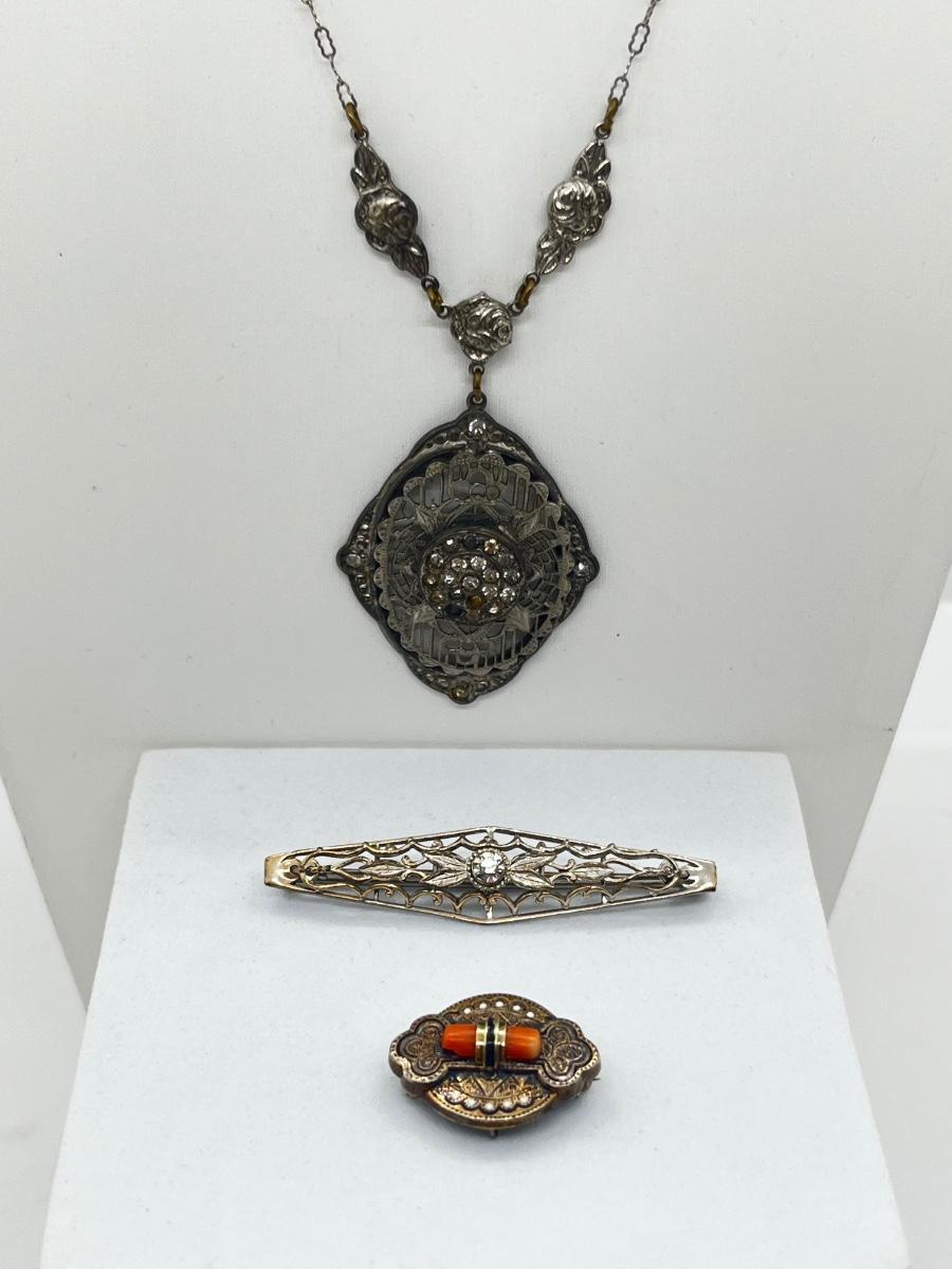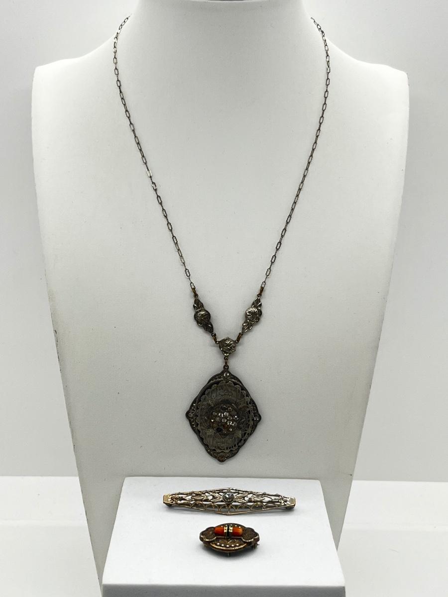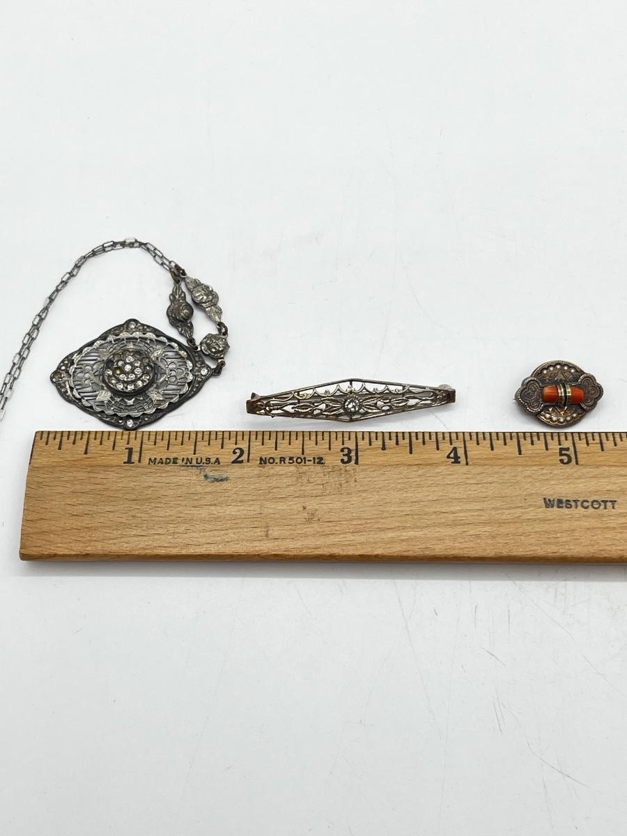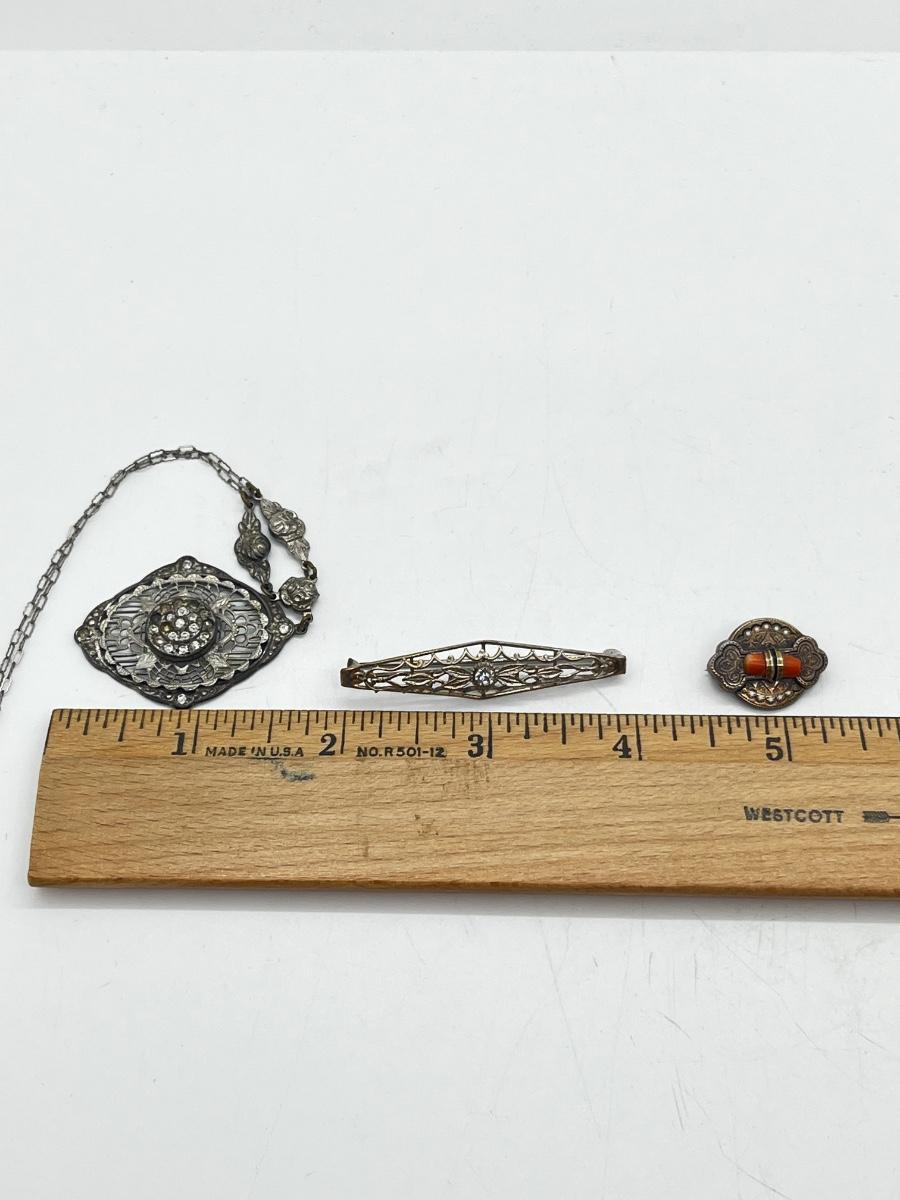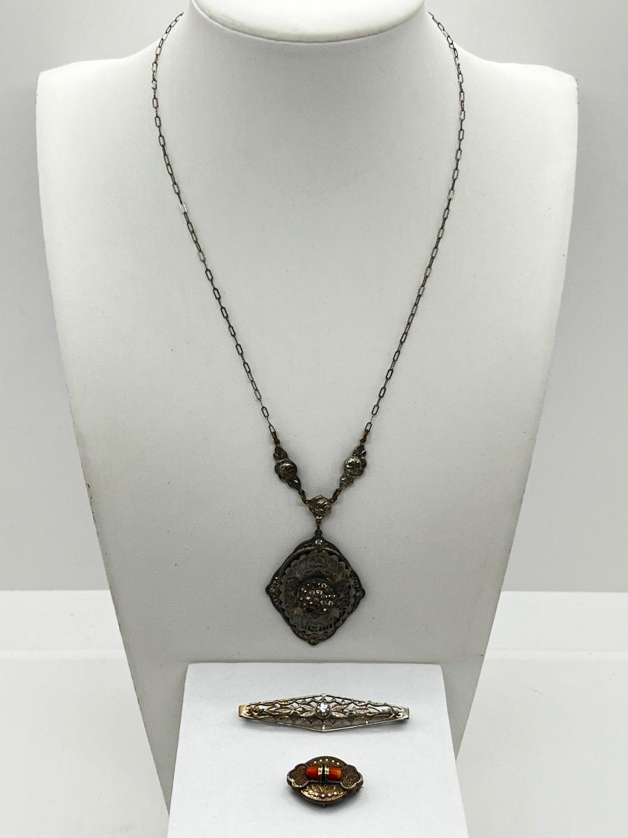 LOT 186J: Antique Victorian Enamel Coral Pendant/Pin, Sterling Rhinestone Fillagree Pendant Necklace and More