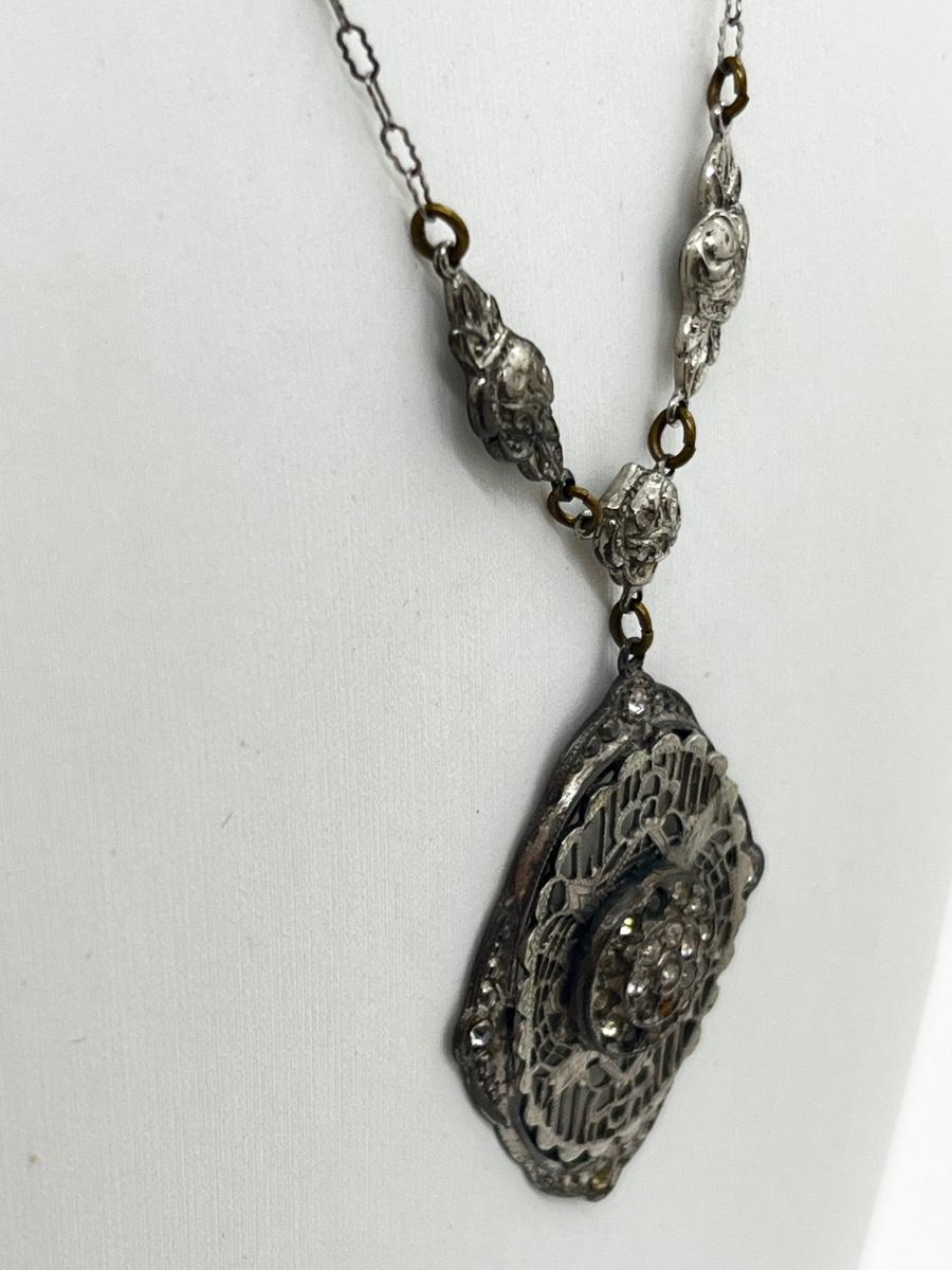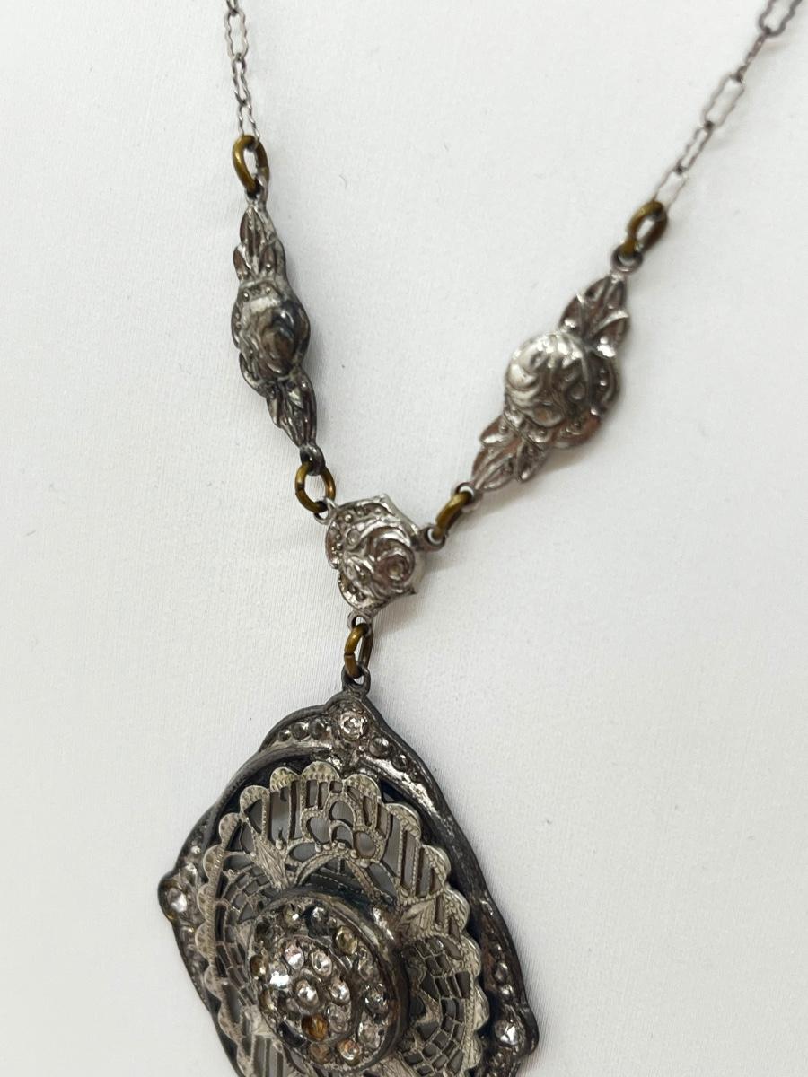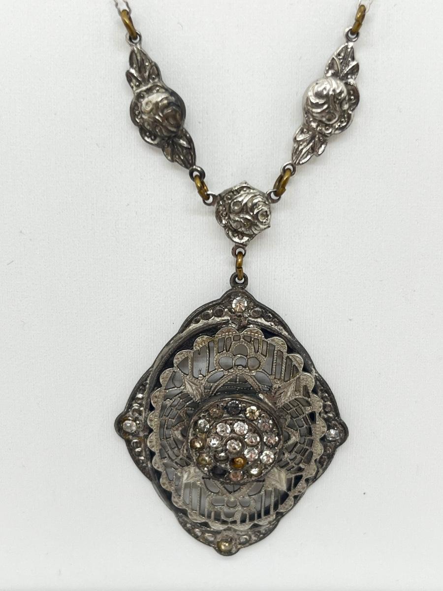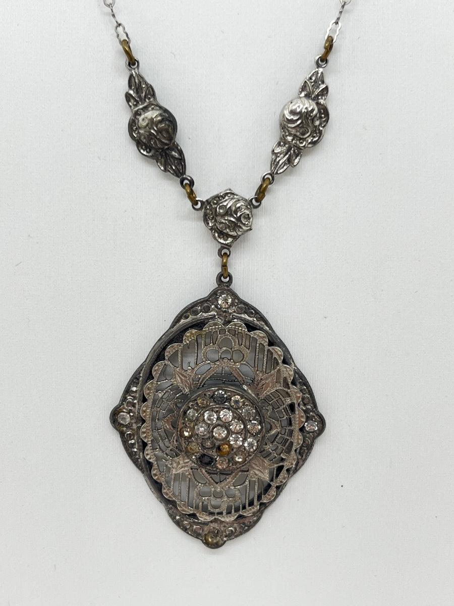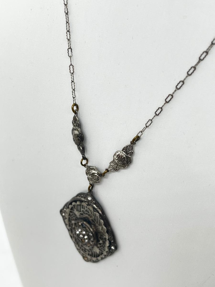 LOT 186J: Antique Victorian Enamel Coral Pendant/Pin, Sterling Rhinestone Fillagree Pendant Necklace and More