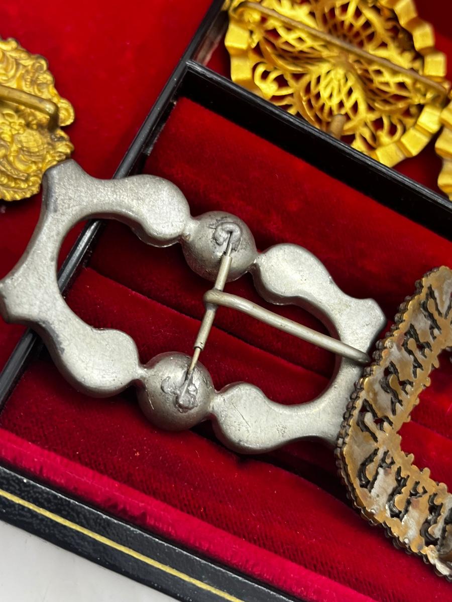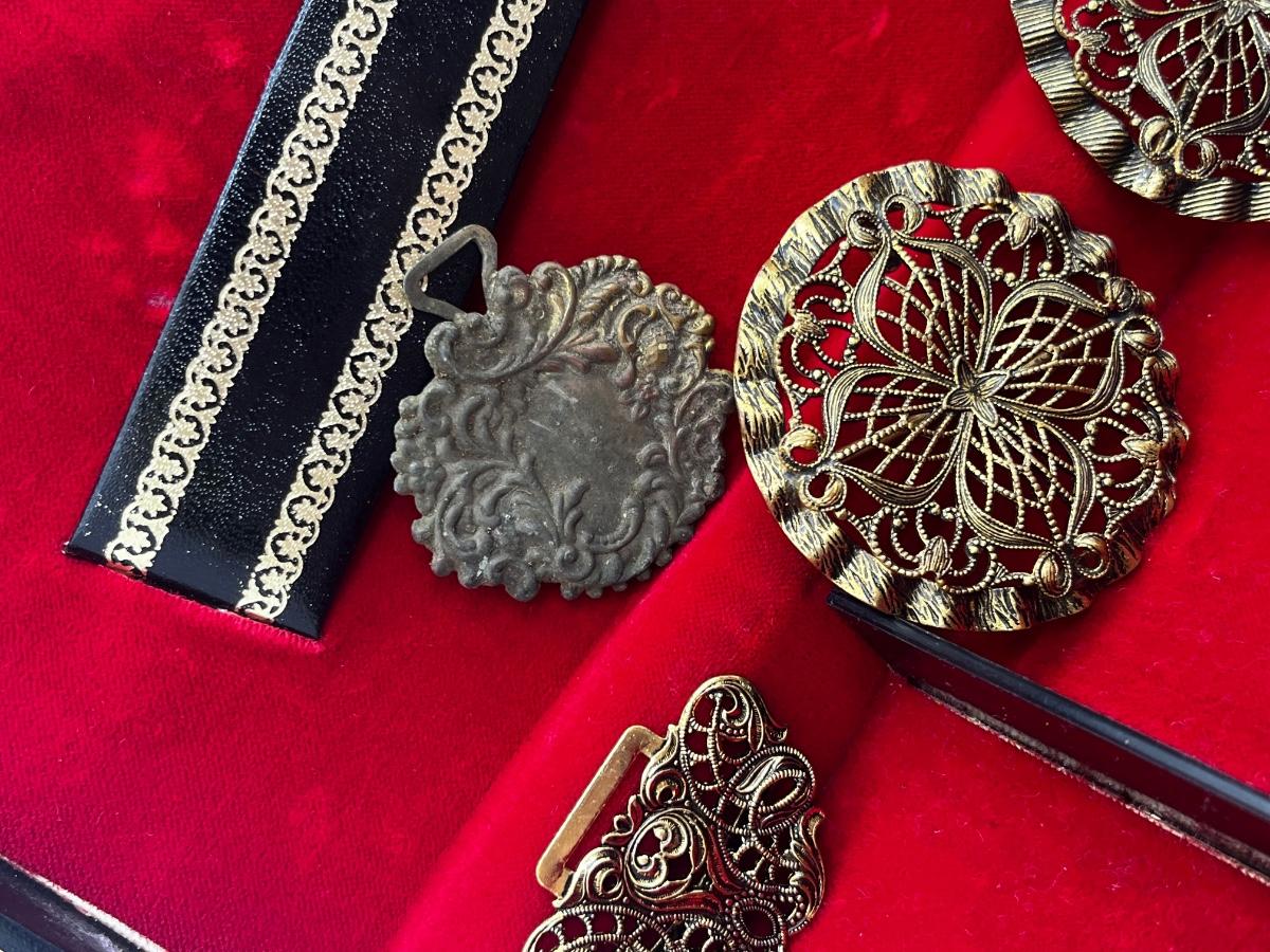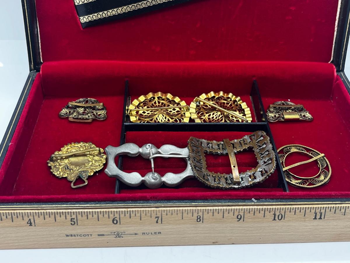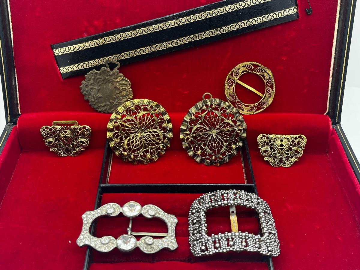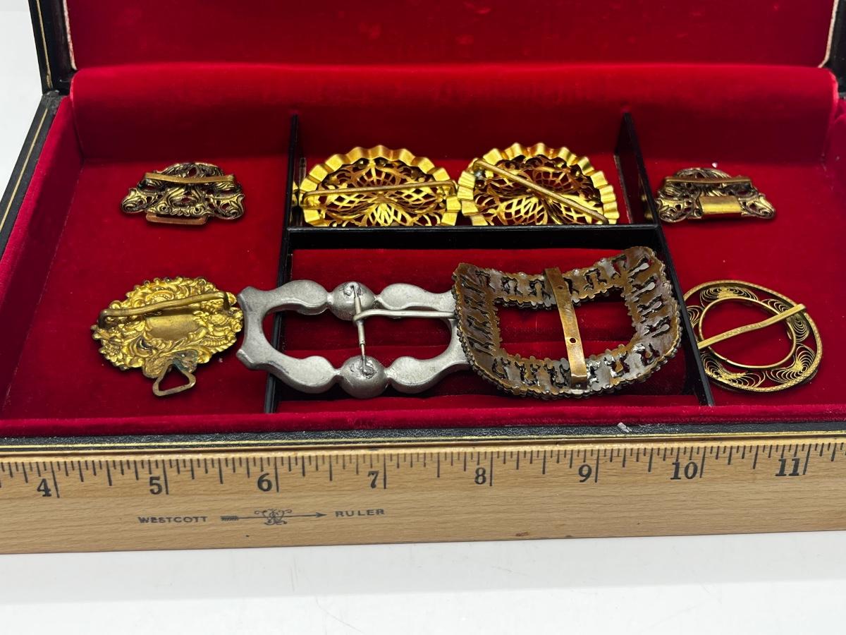 LOT 198J: Antique Victorian Belt Buckles with a Vintage Red Velvet Lined Jewelry Case