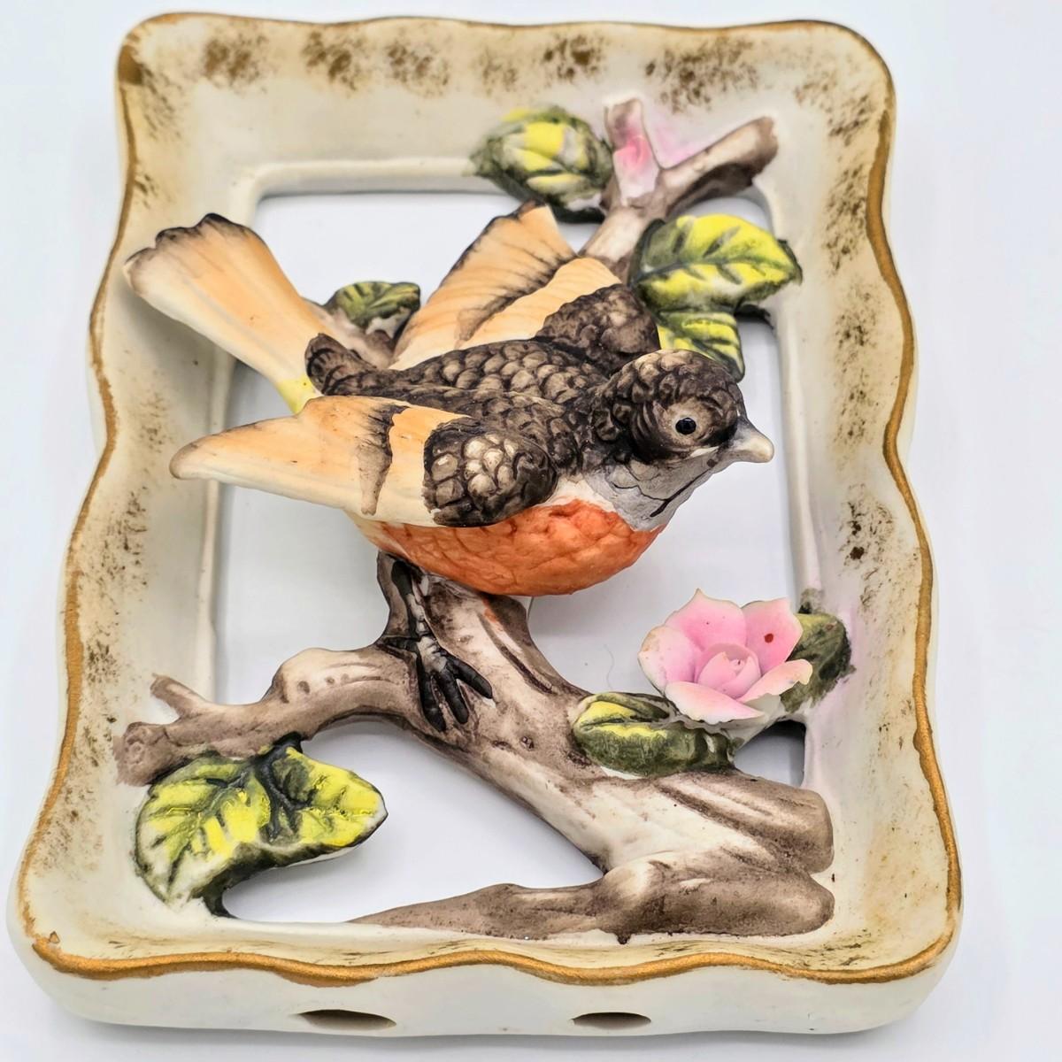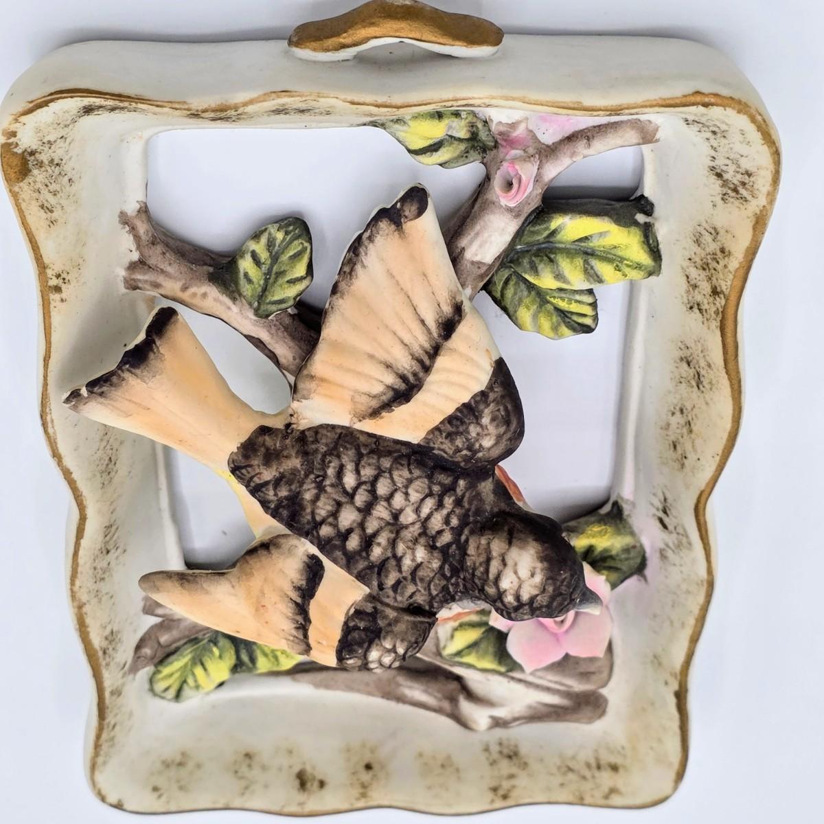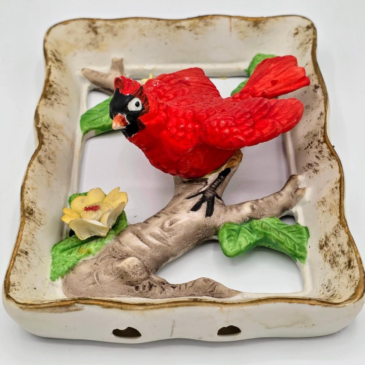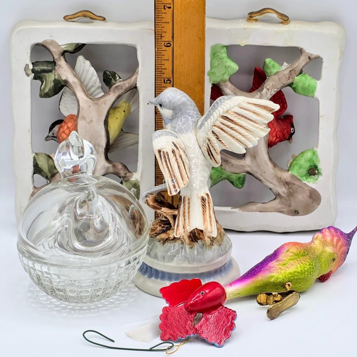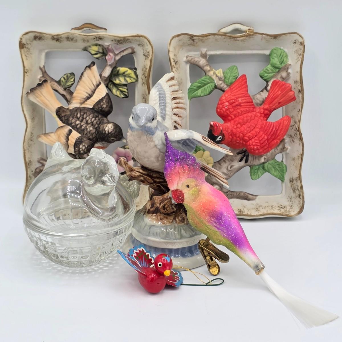 LOT 10L: Vintage Porcelain Blue Bird Figurine, Chalkware Sparrow, Cardinal Wall Plaques & More