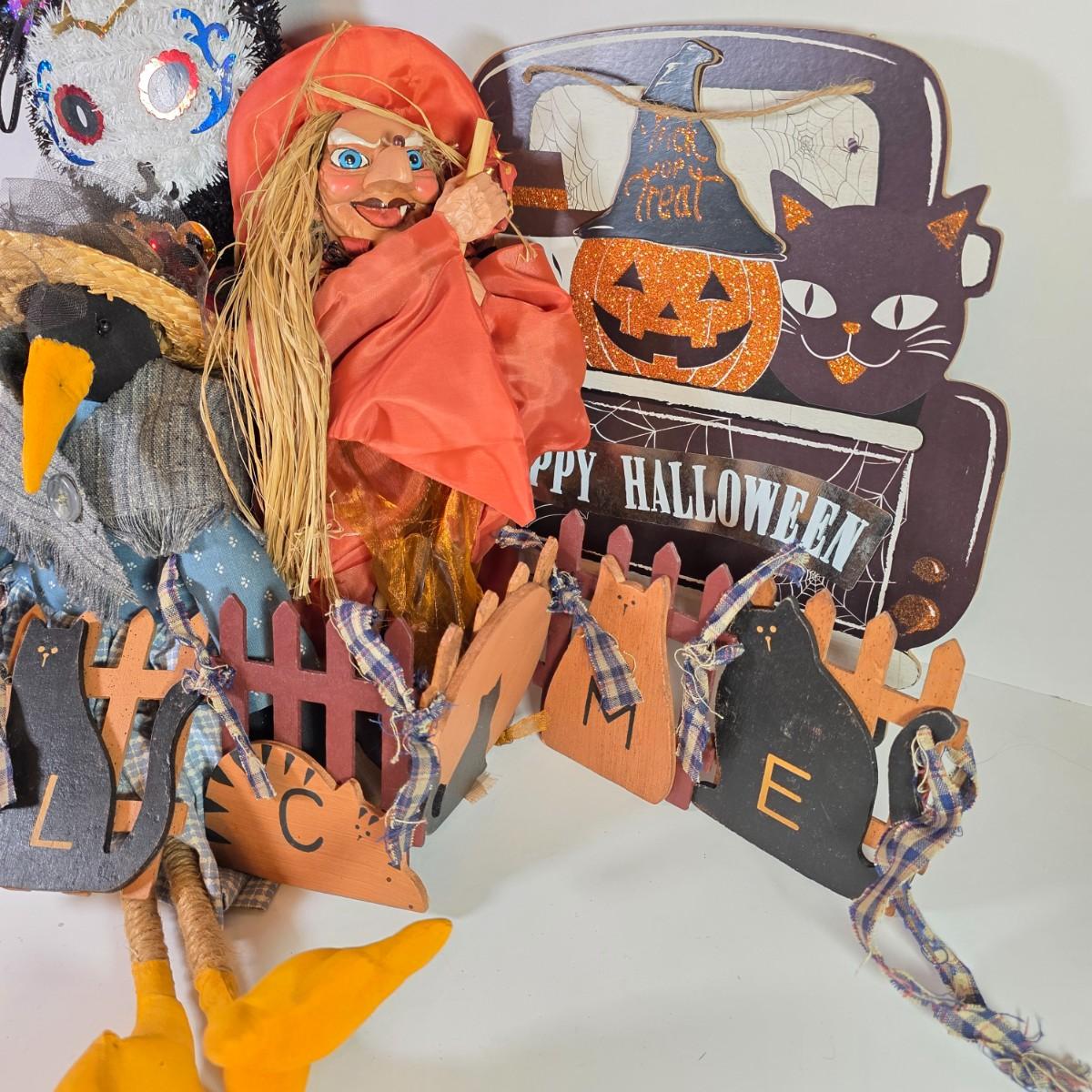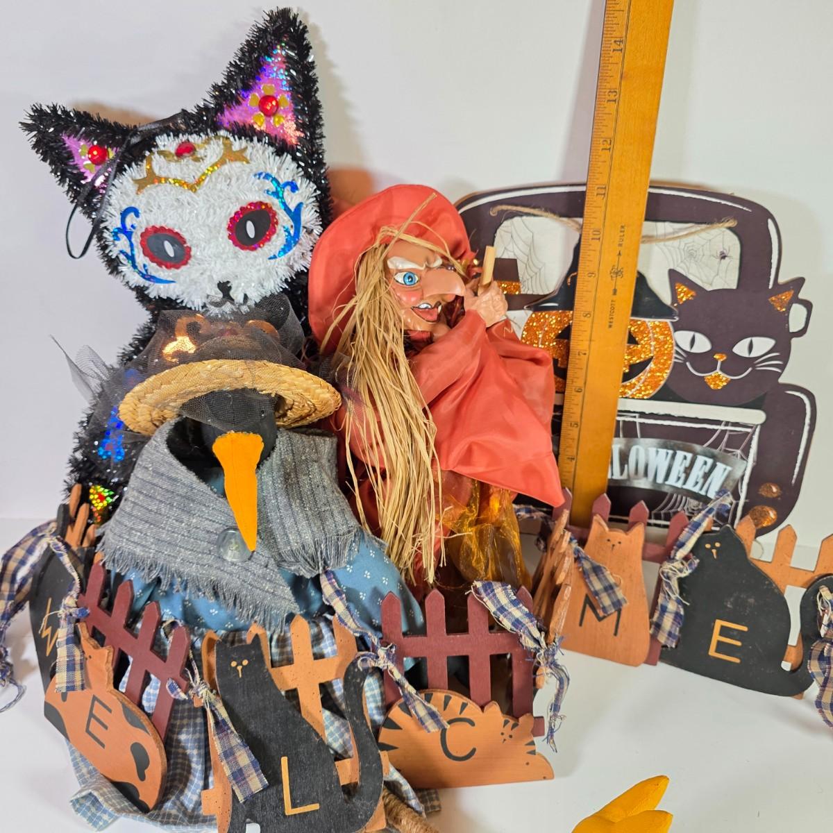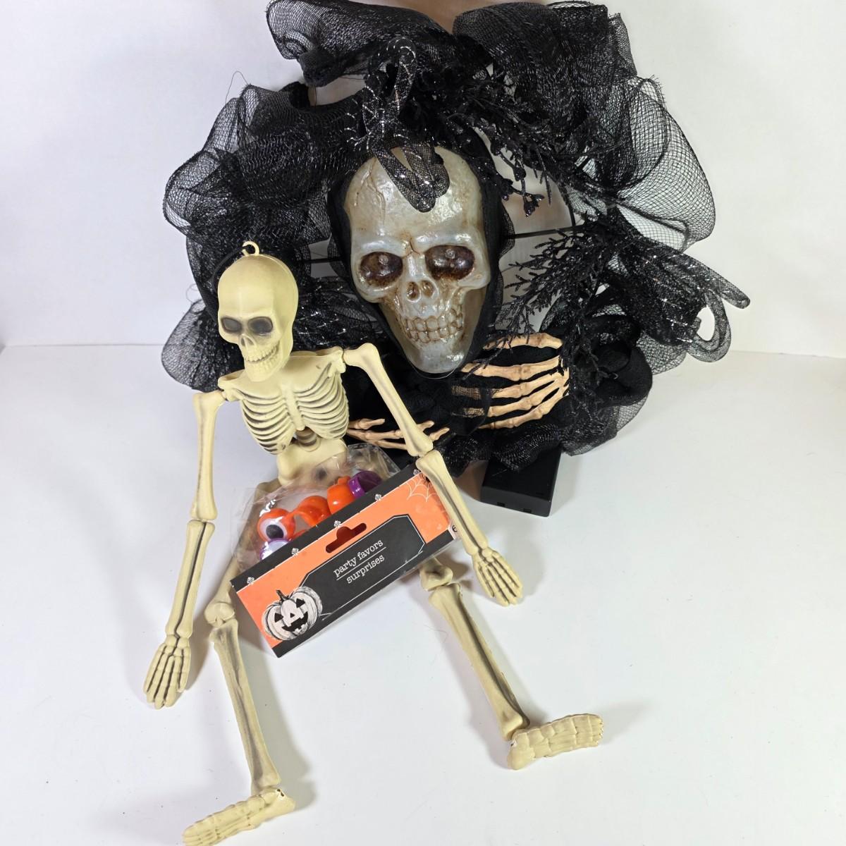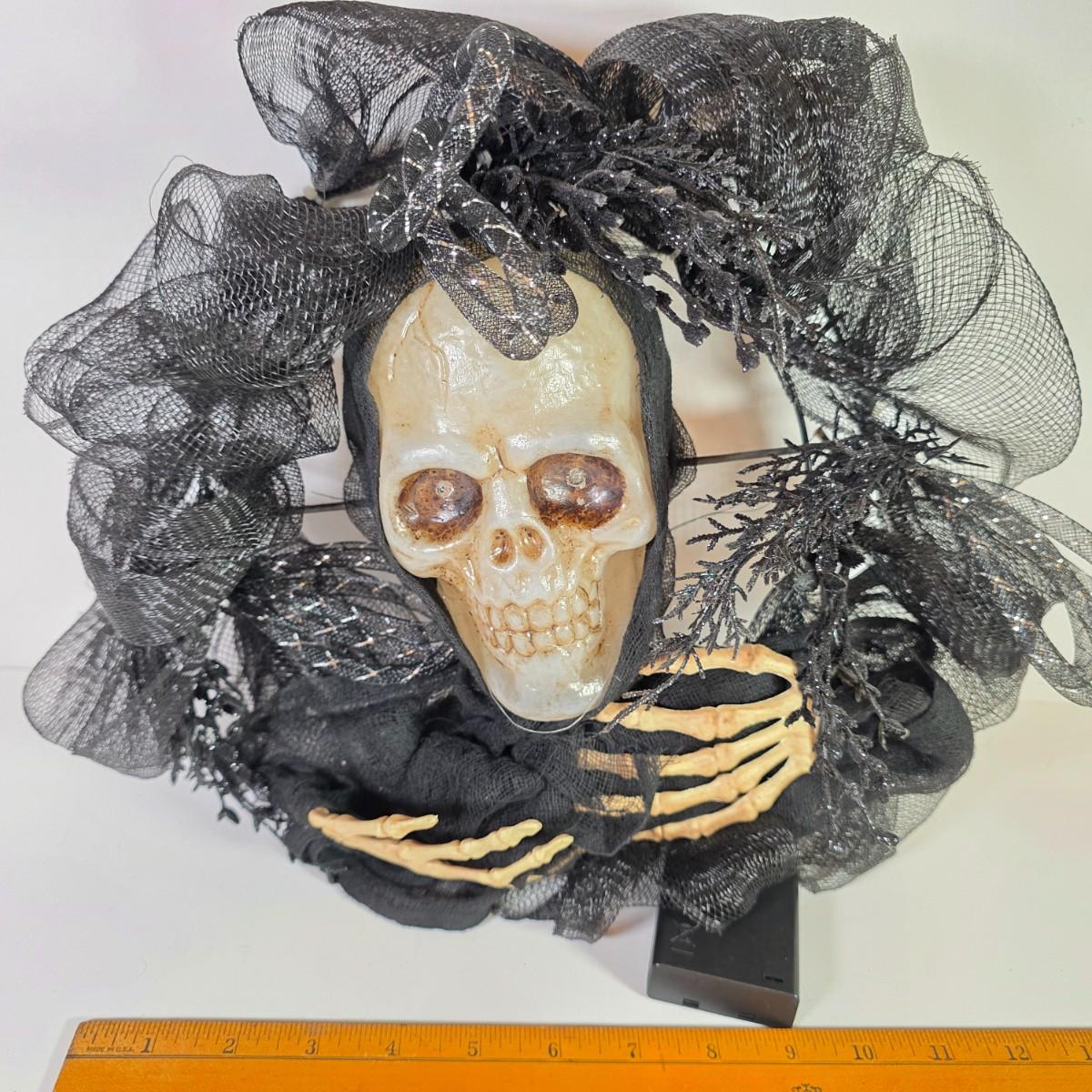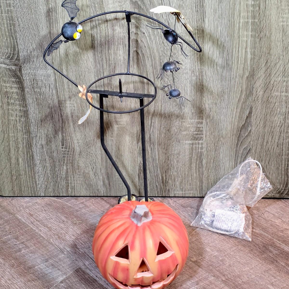 LOT 20D: Scary Cool Lighted Metal/Plastic Pumpkin Standing Decoration, Stuffed Crow, Skeleton Wreath & Assorted Halloween Decorations