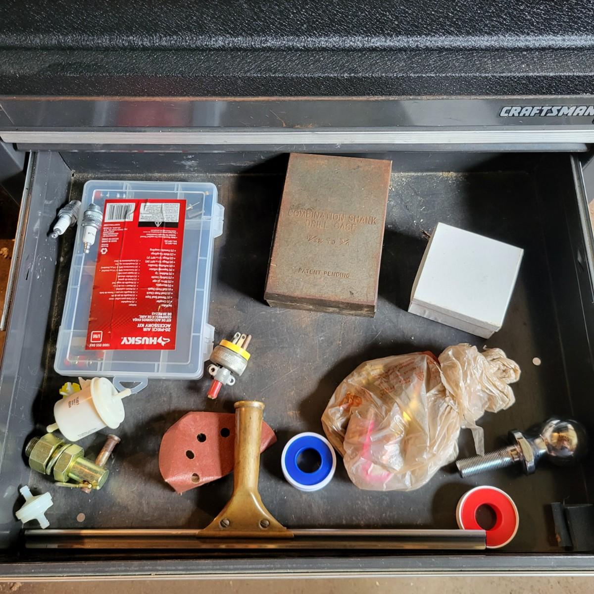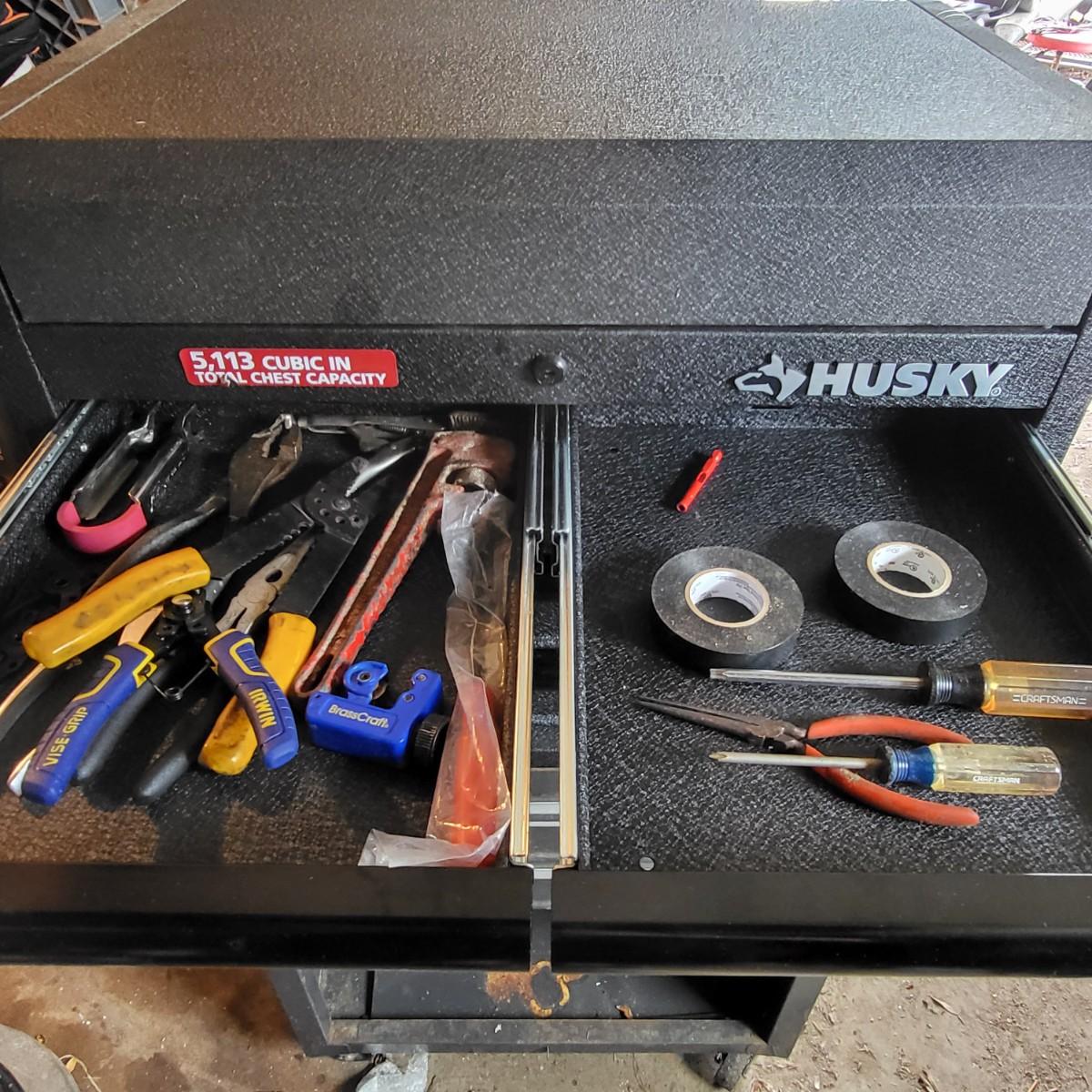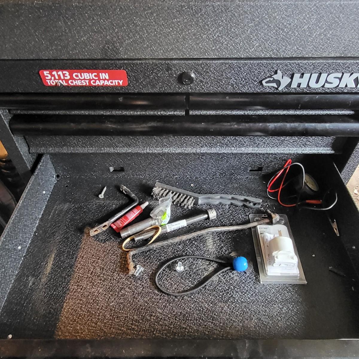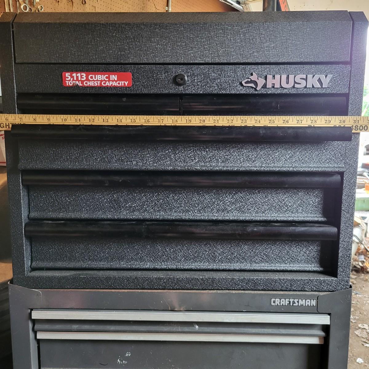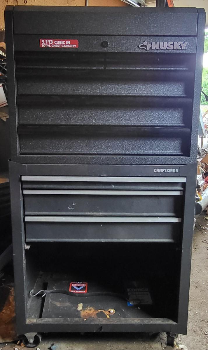 LOT 52: Husky Five Drawer Black Top Tool Chest and Three Drawer Black Craftsman Tool Chest with Dolly and Contents