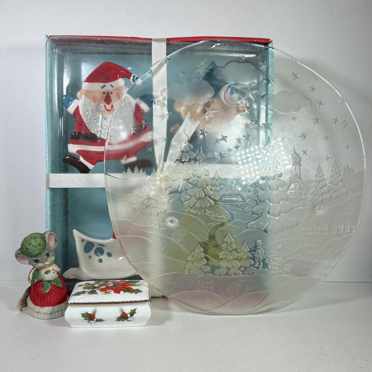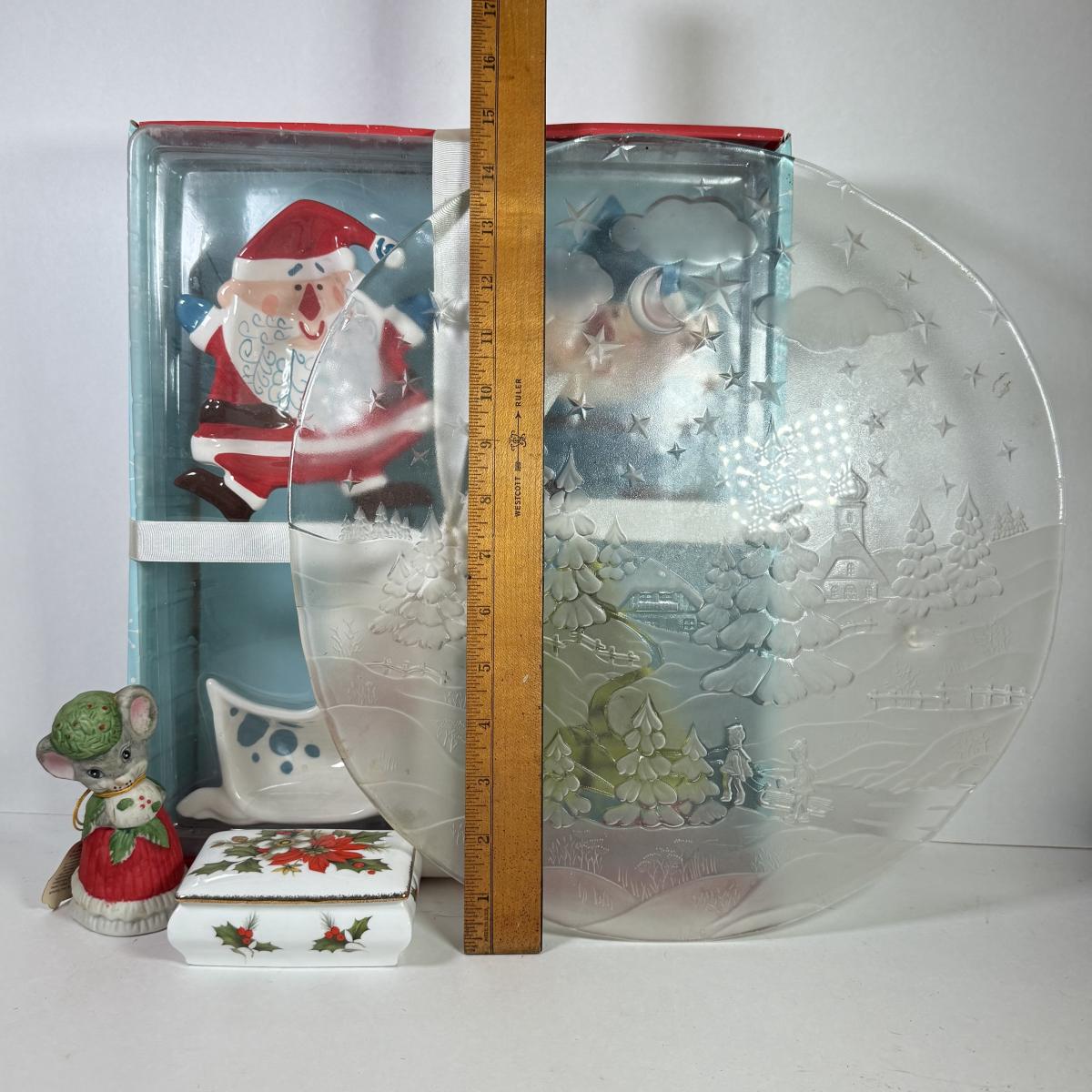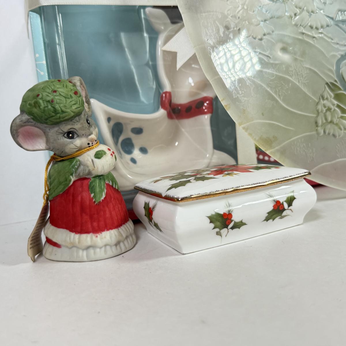 LOT 80K: NIB Christmas Tidbit Trays, Glass Platter, Trinket Box & Bell