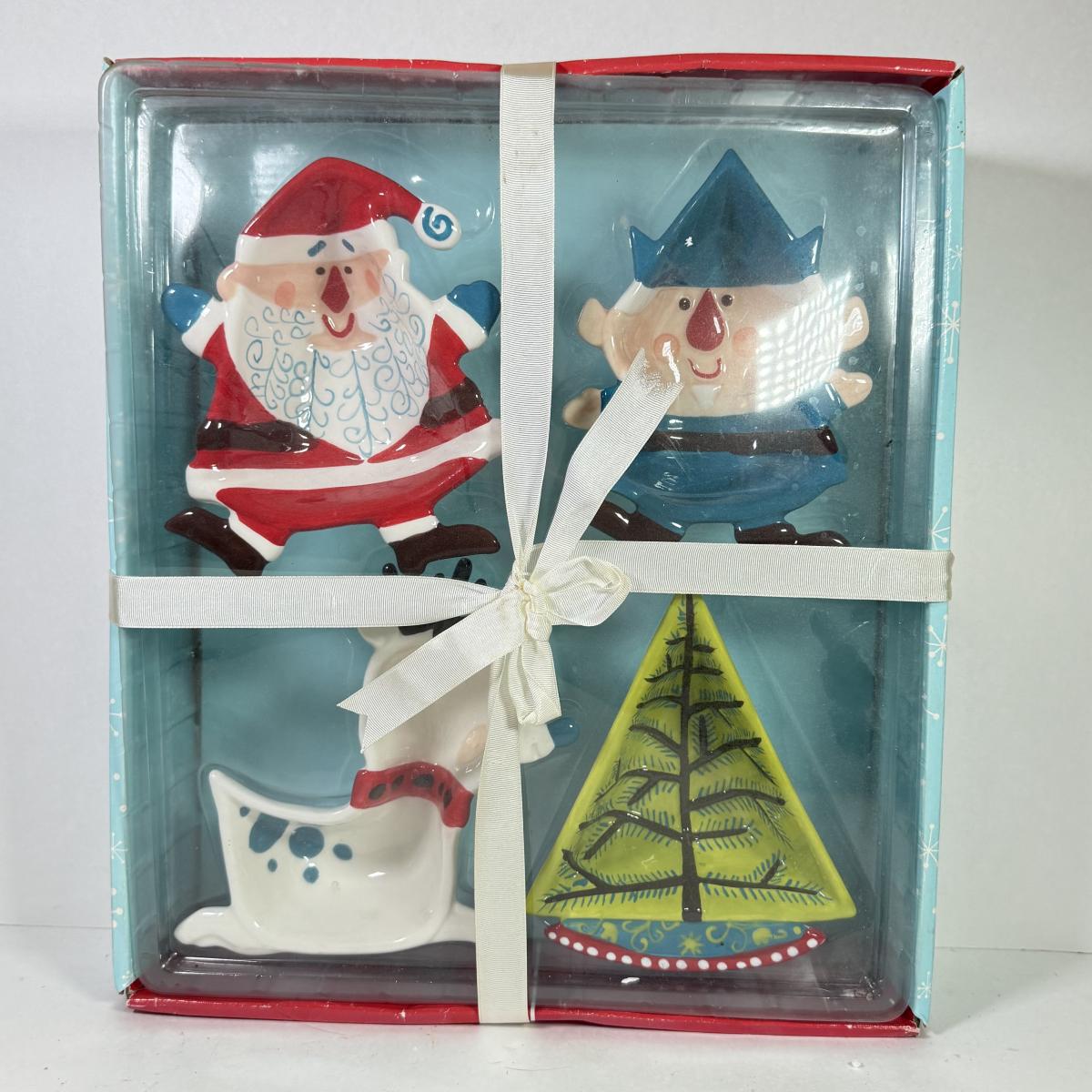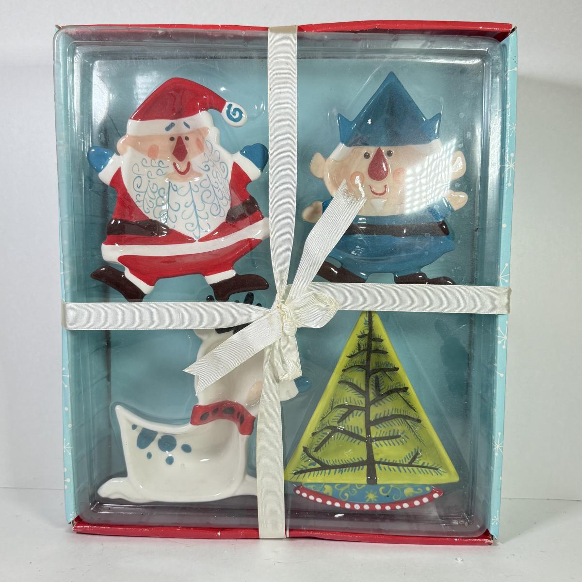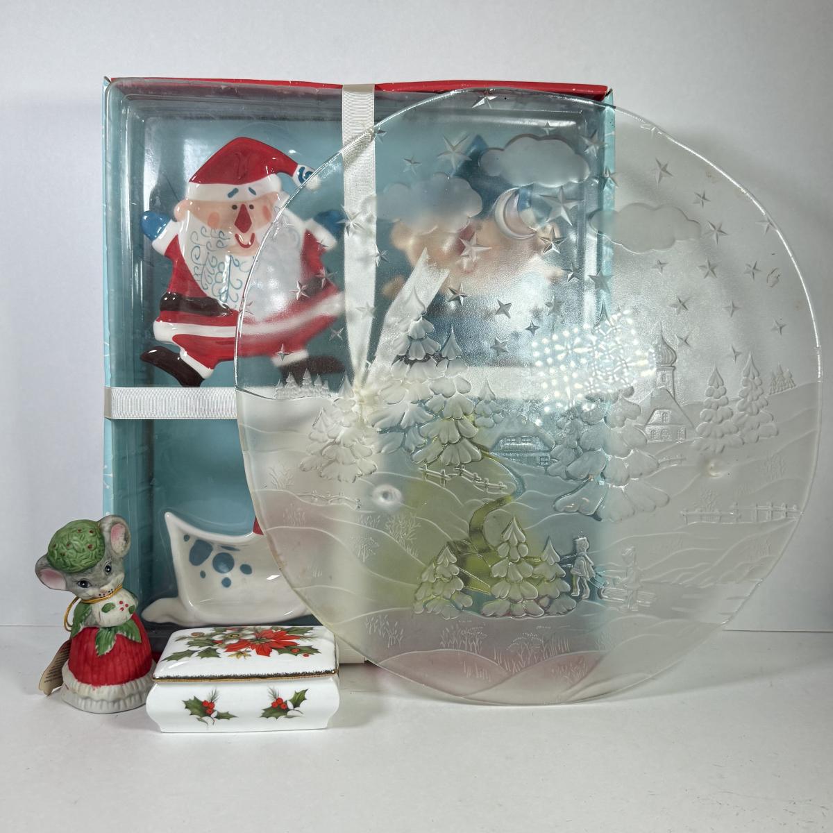 LOT 80K: NIB Christmas Tidbit Trays, Glass Platter, Trinket Box & Bell