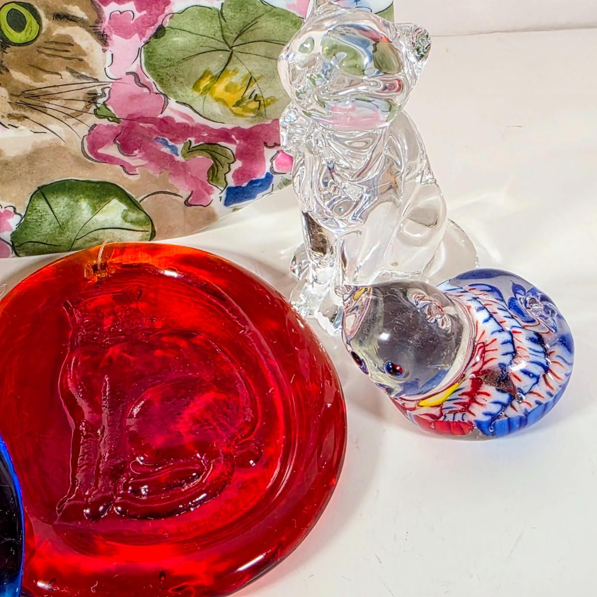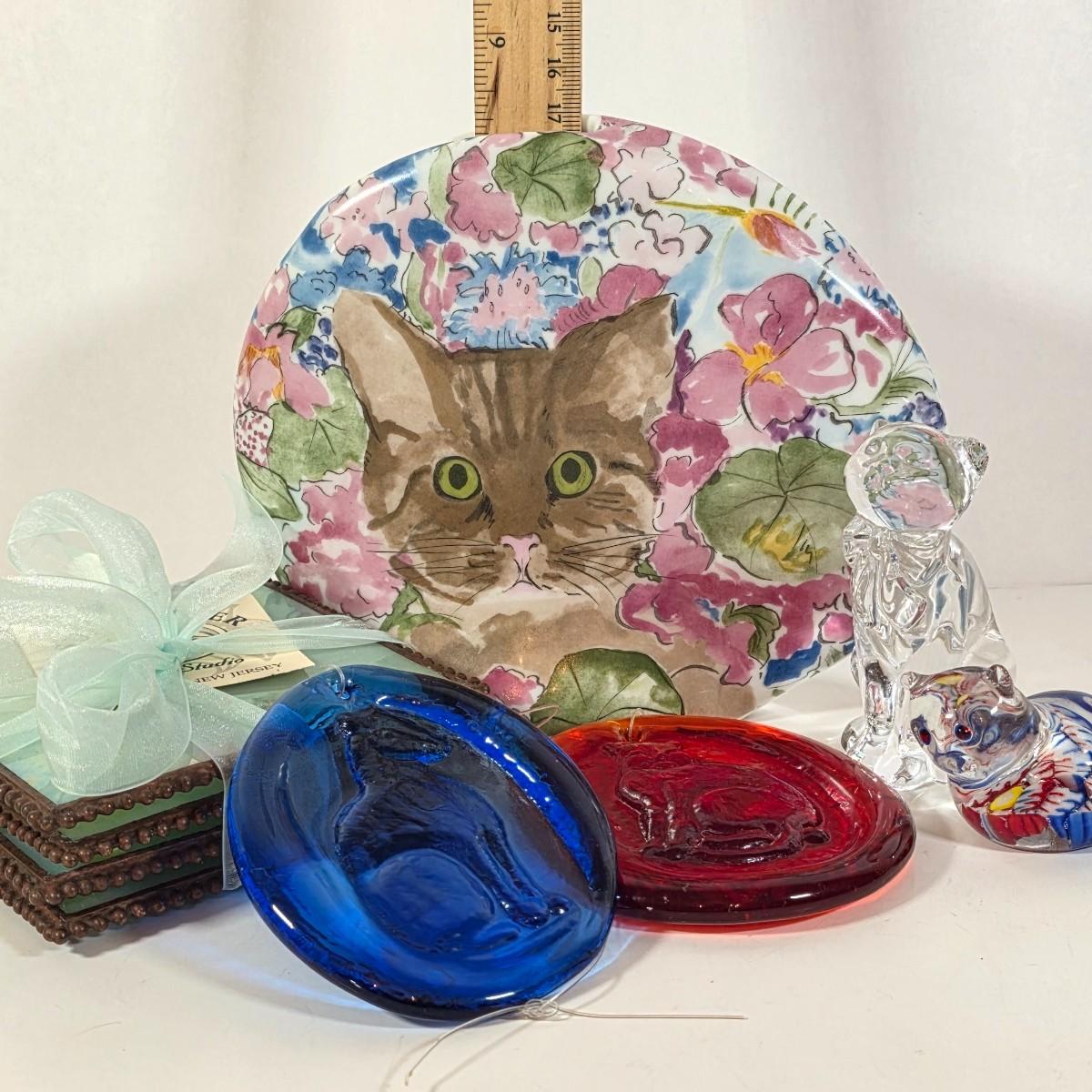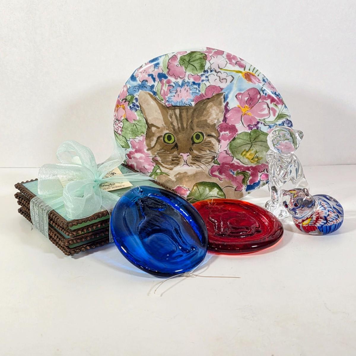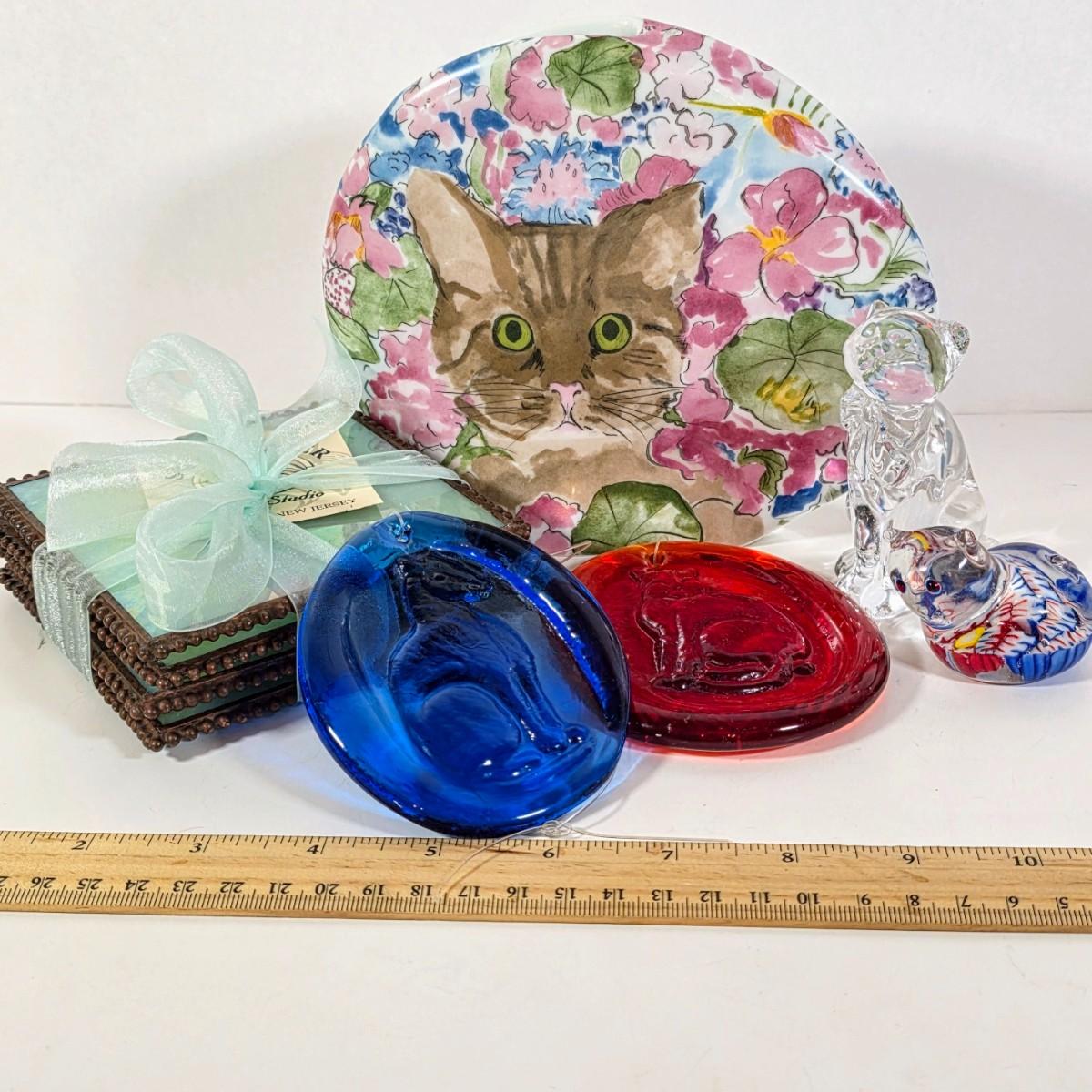 LOT 90D: Glass Coasters Made in Stockton, NJ Sunflower Glass Studio, Vintage Cat Vase, Cobalt & Ruby Colored Cat Suncatchers & Clear/Colored Glass Cat Figurines