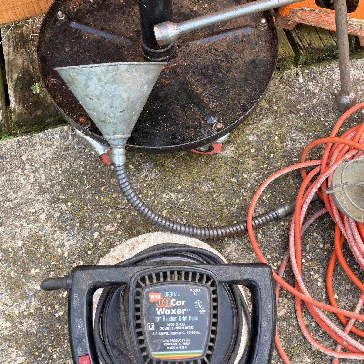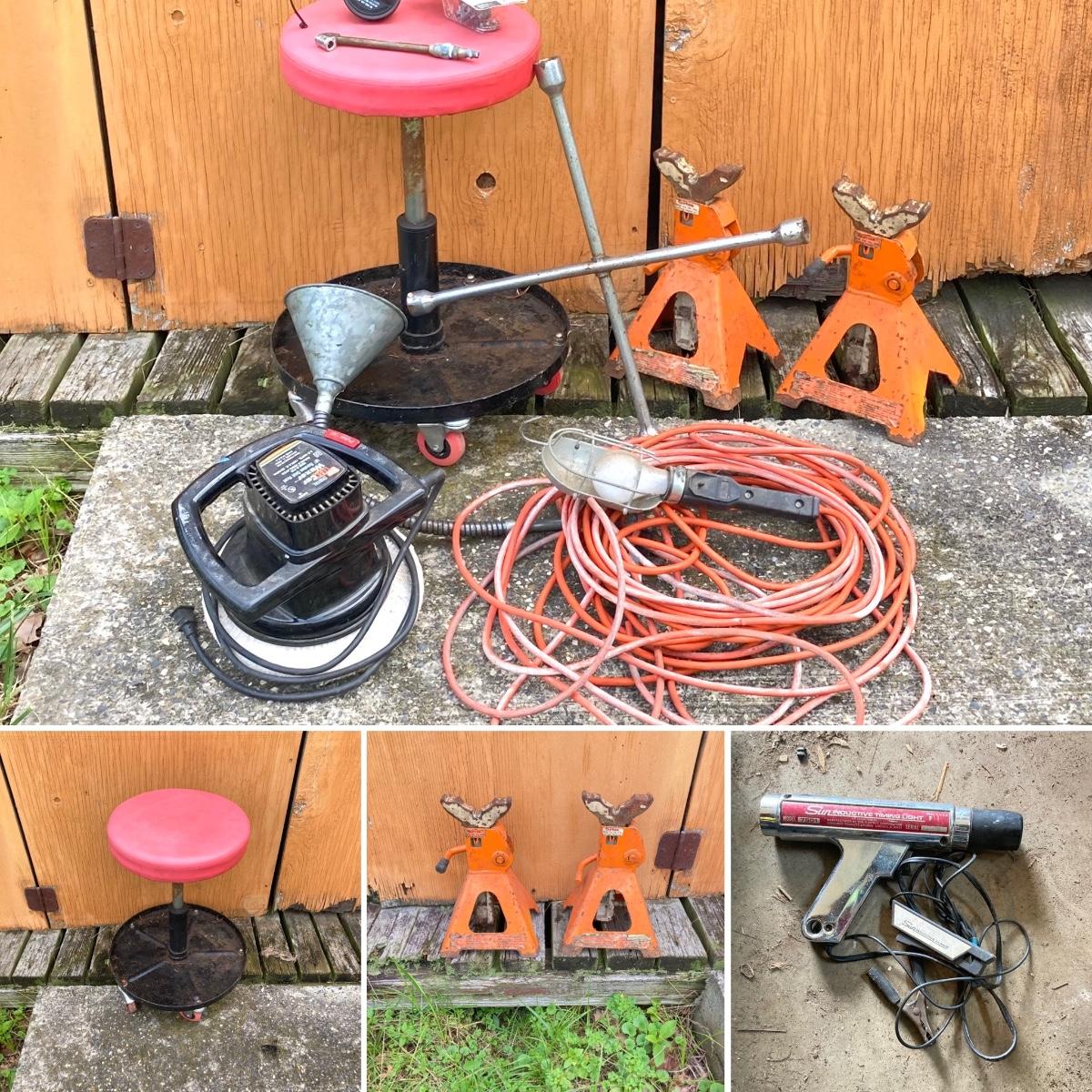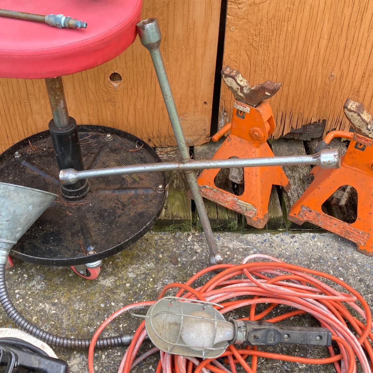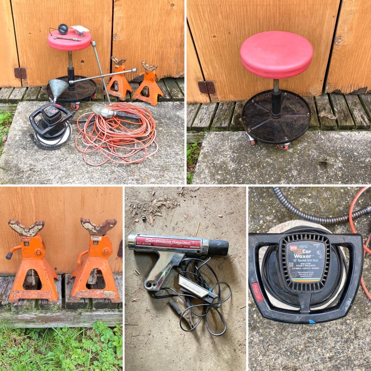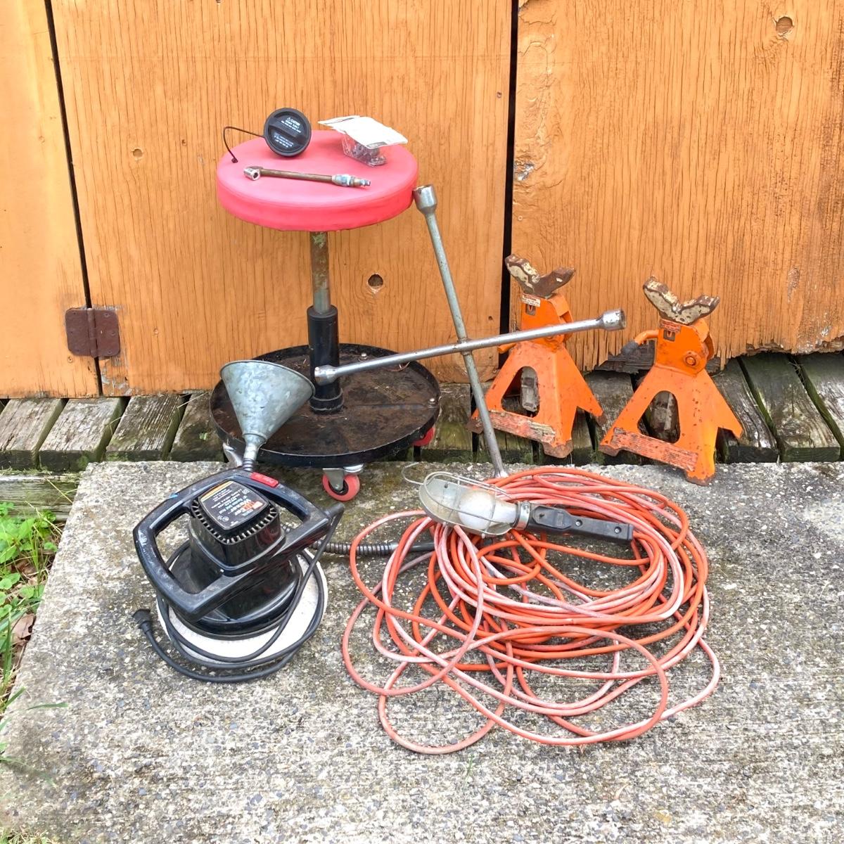 LOT 131S: Automotive Lot - Rolling Seat, Stands, Car Waxer, Hanging Light / Power Cord, Funnel, Sun Inductive Timing Light Model 7501 and More
