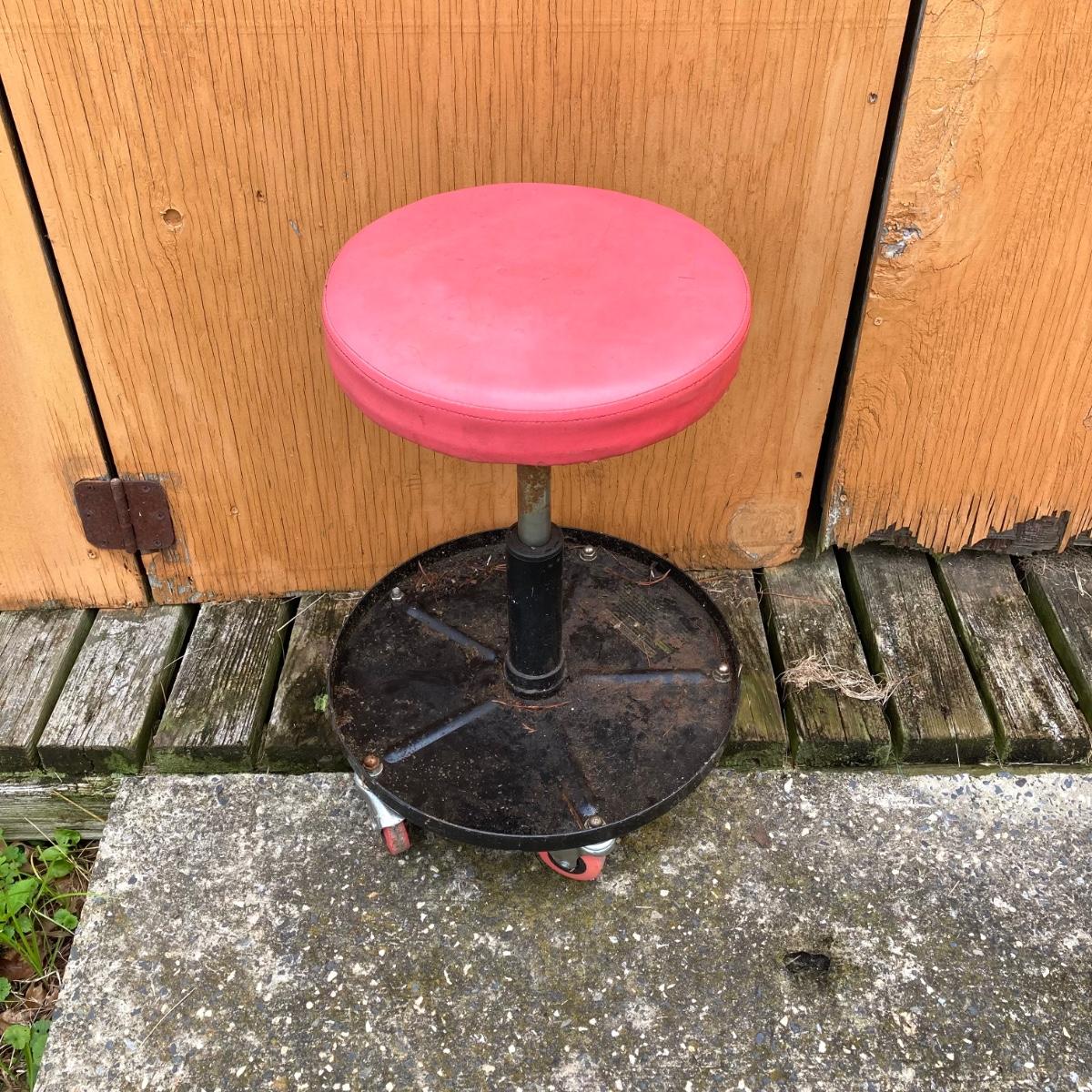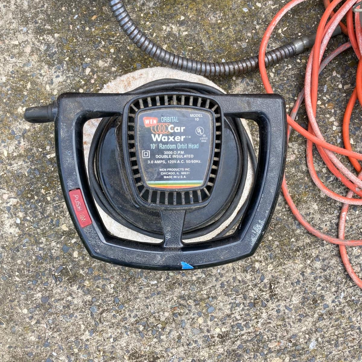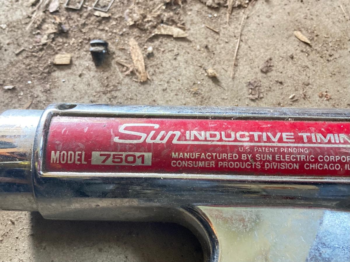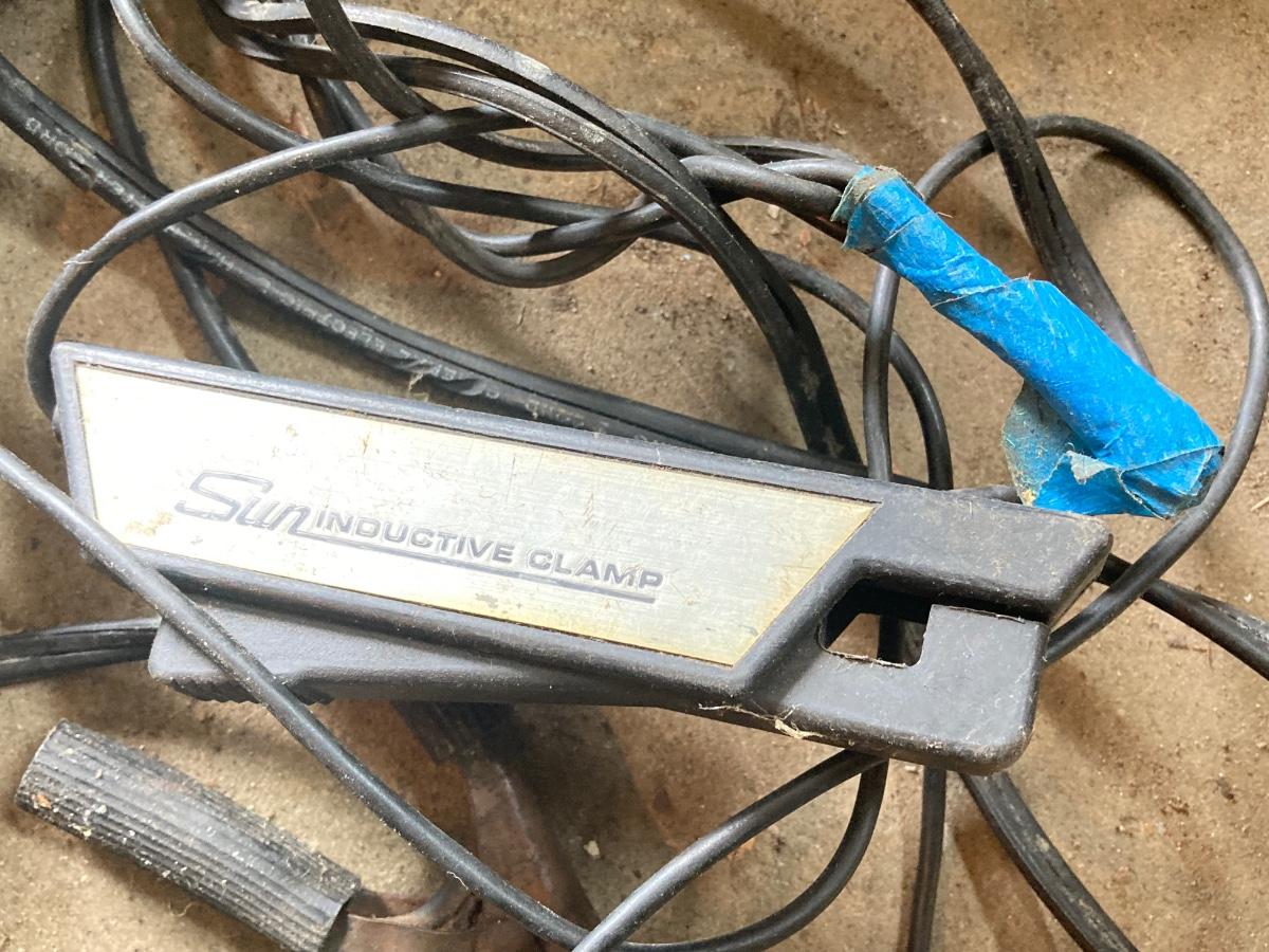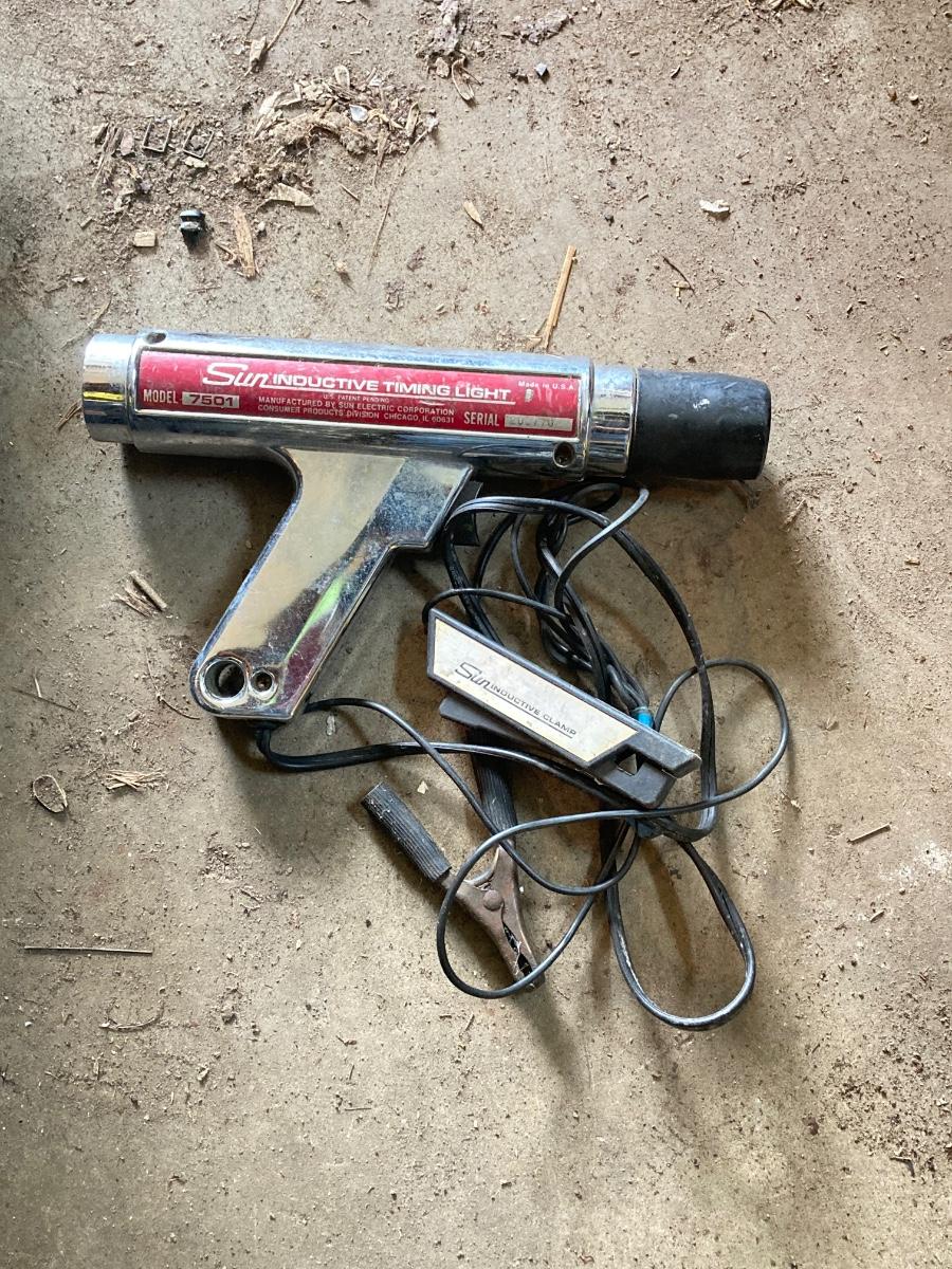 LOT 131S: Automotive Lot - Rolling Seat, Stands, Car Waxer, Hanging Light / Power Cord, Funnel, Sun Inductive Timing Light Model 7501 and More
