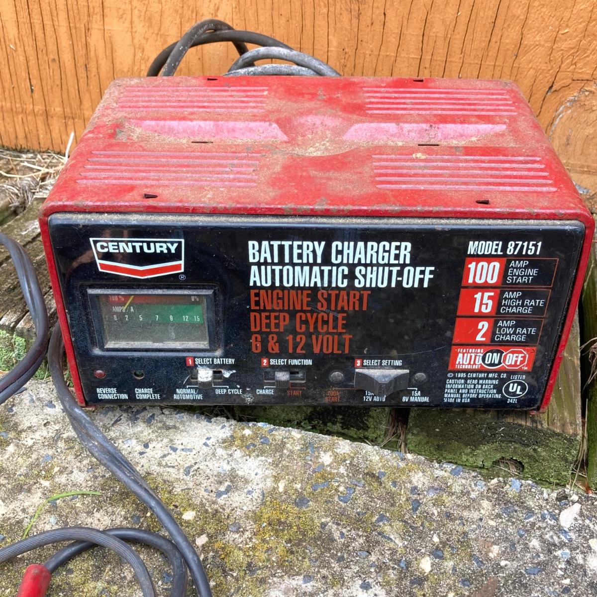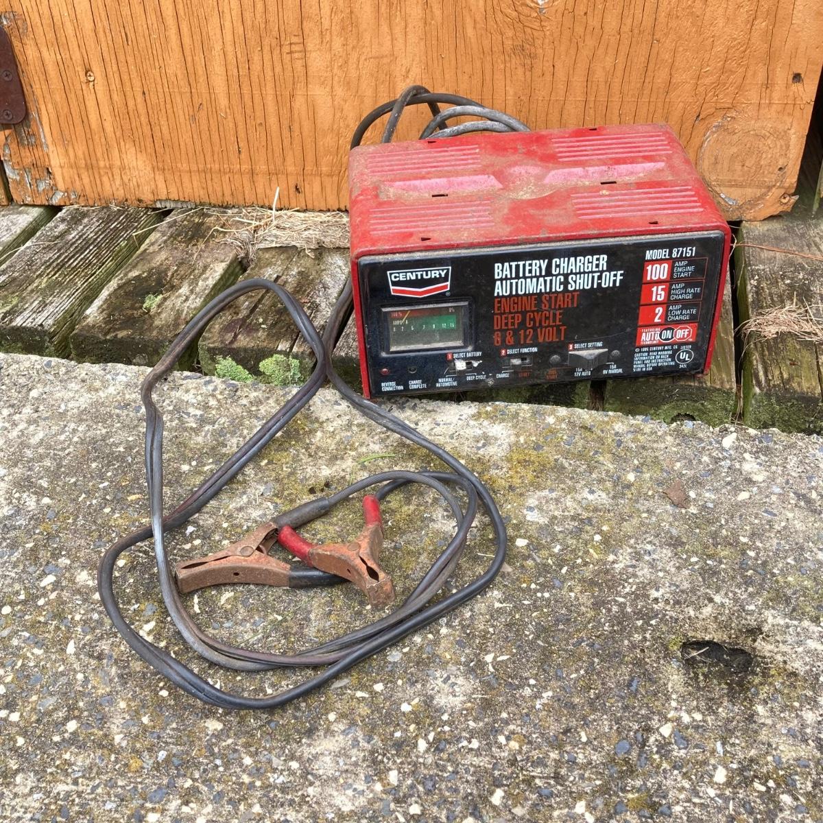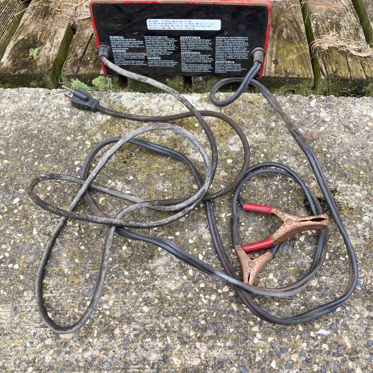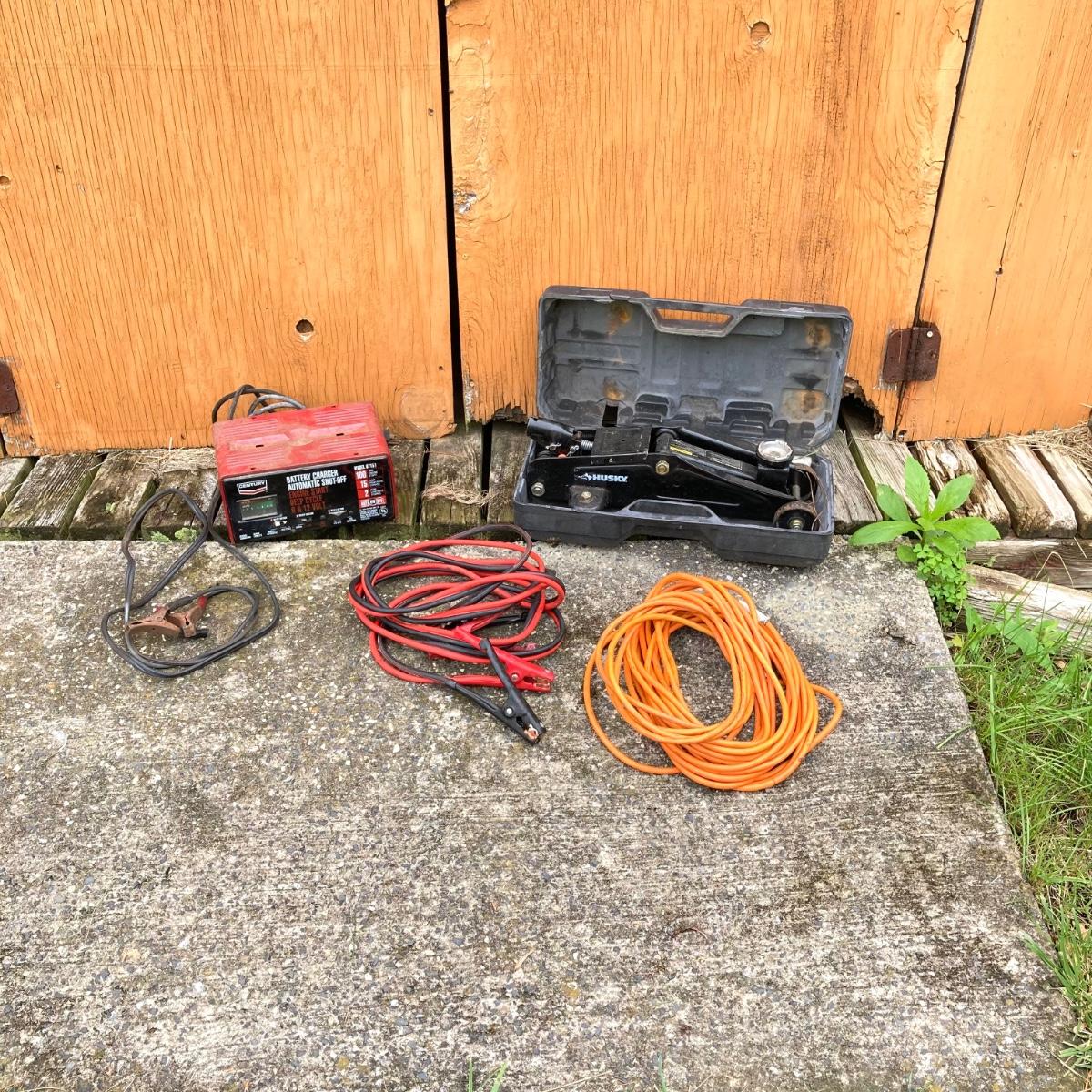 LOT 132S: Century Model 87151 Battery Charger, Husky Jack in Case, Jumper Cables and Power Cord
