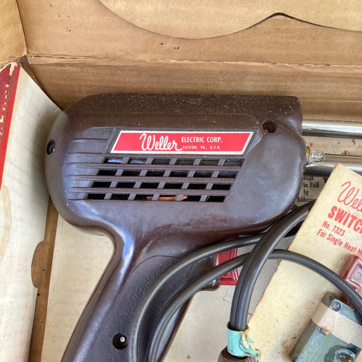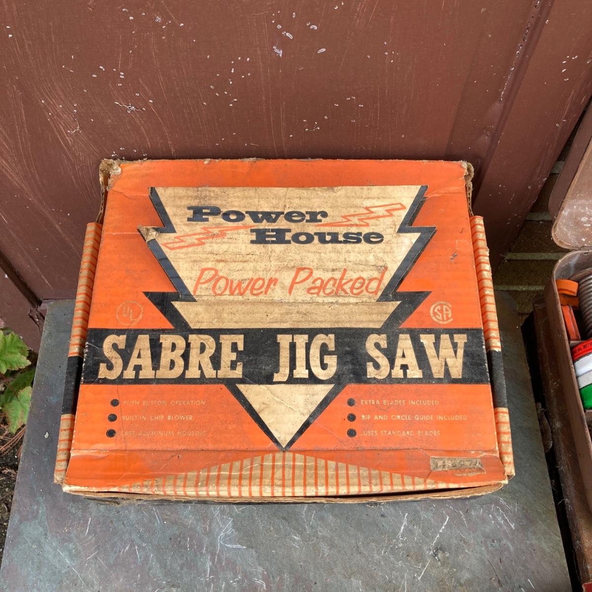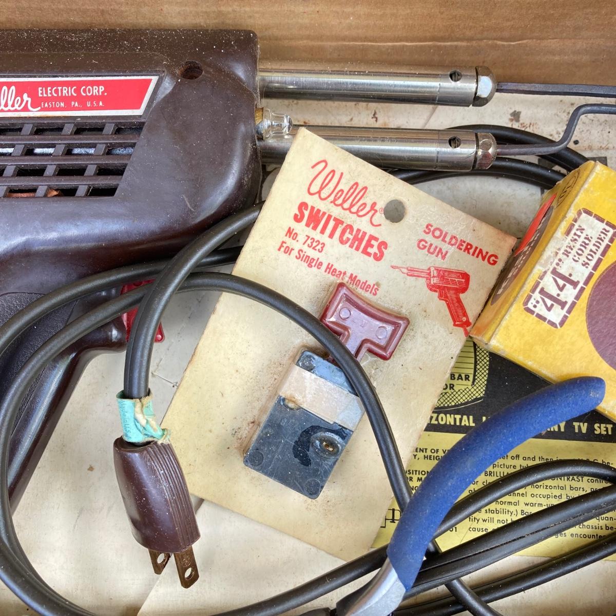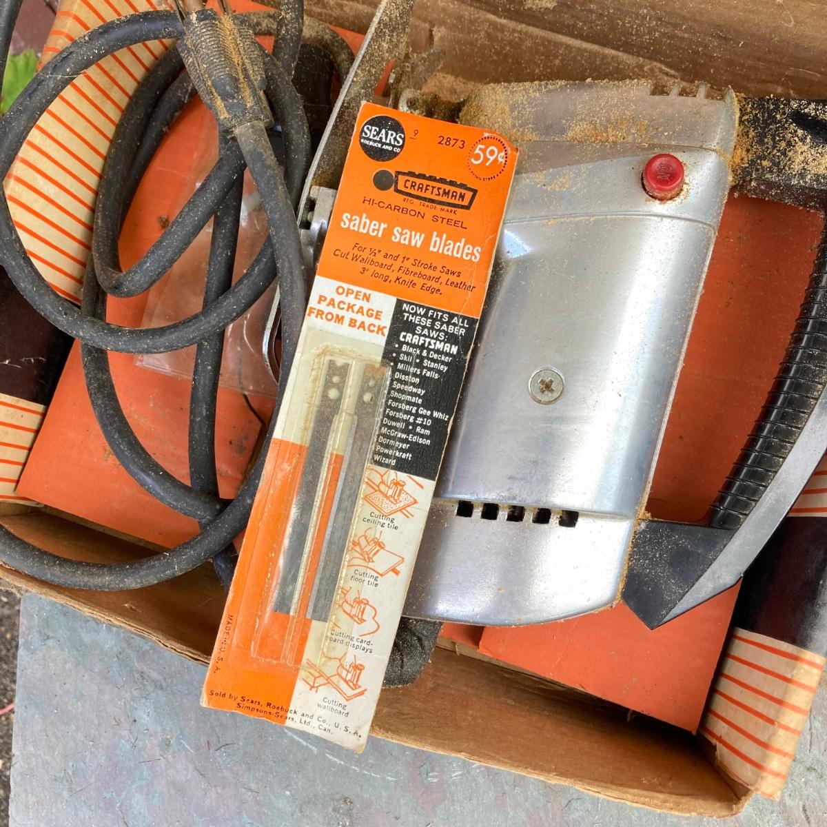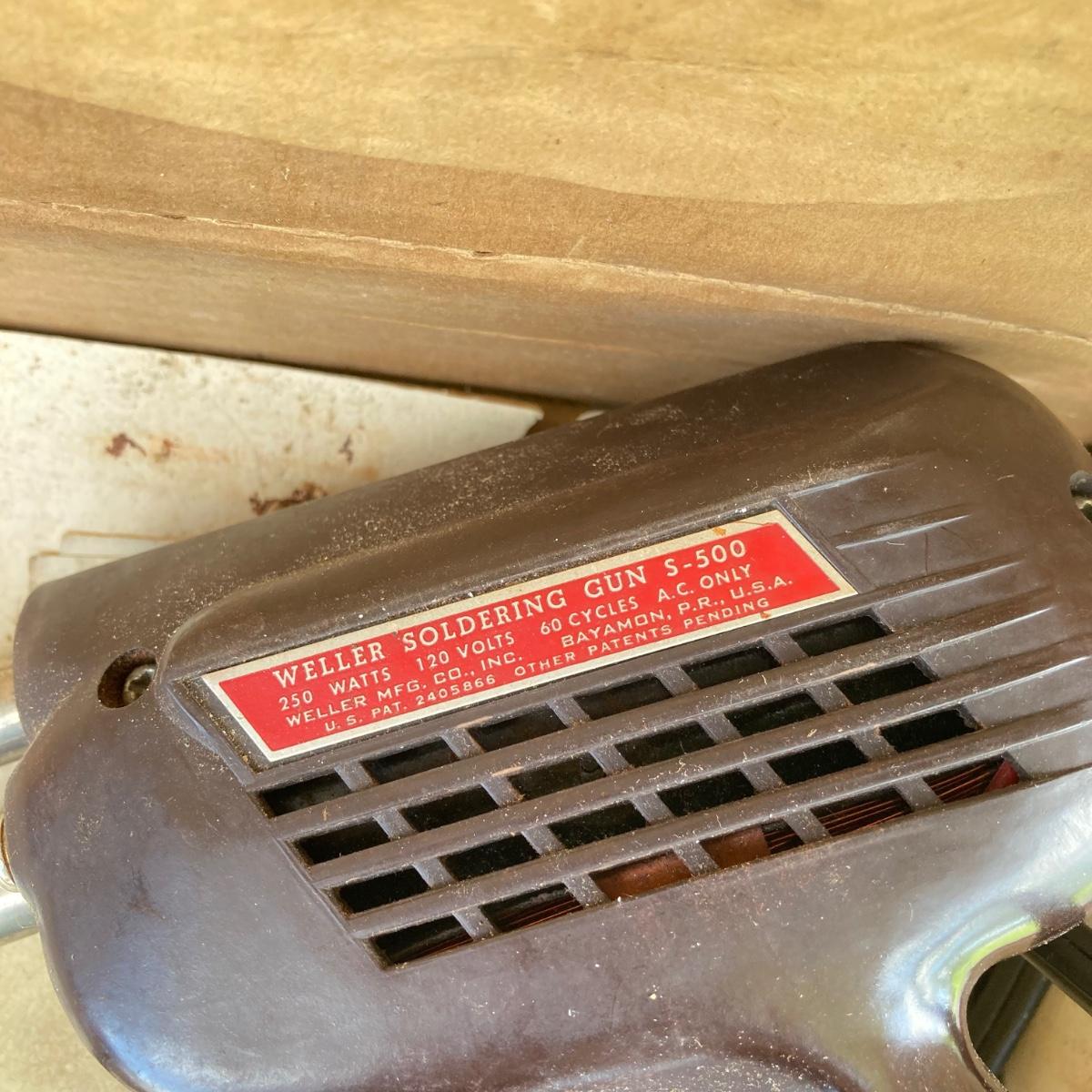 LOT 139G: Vintage Tools - Power House Sabre Jig Saw, Weller Soldering Gun, Soldering Kit, Saw Blades in Wood Storage Box and More