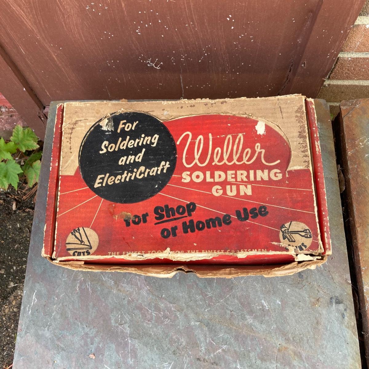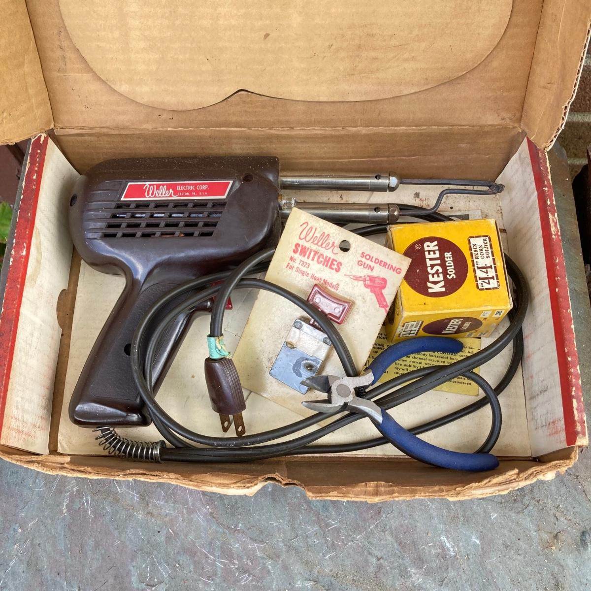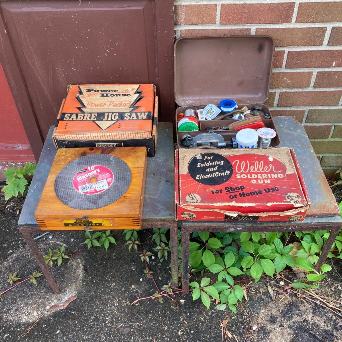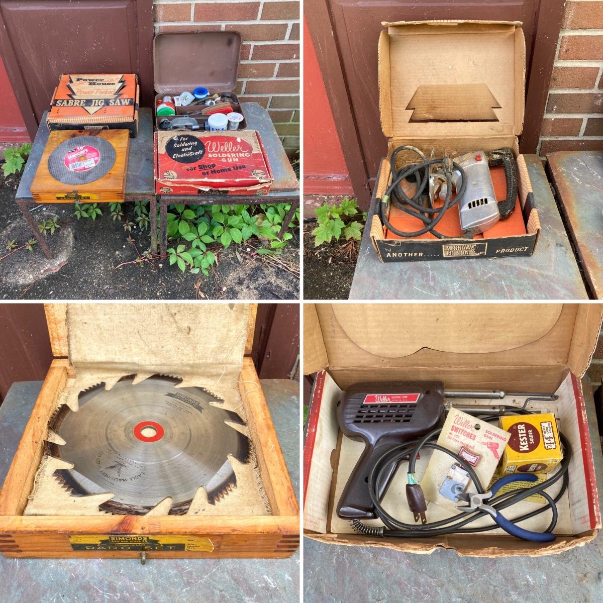 LOT 139G: Vintage Tools - Power House Sabre Jig Saw, Weller Soldering Gun, Soldering Kit, Saw Blades in Wood Storage Box and More