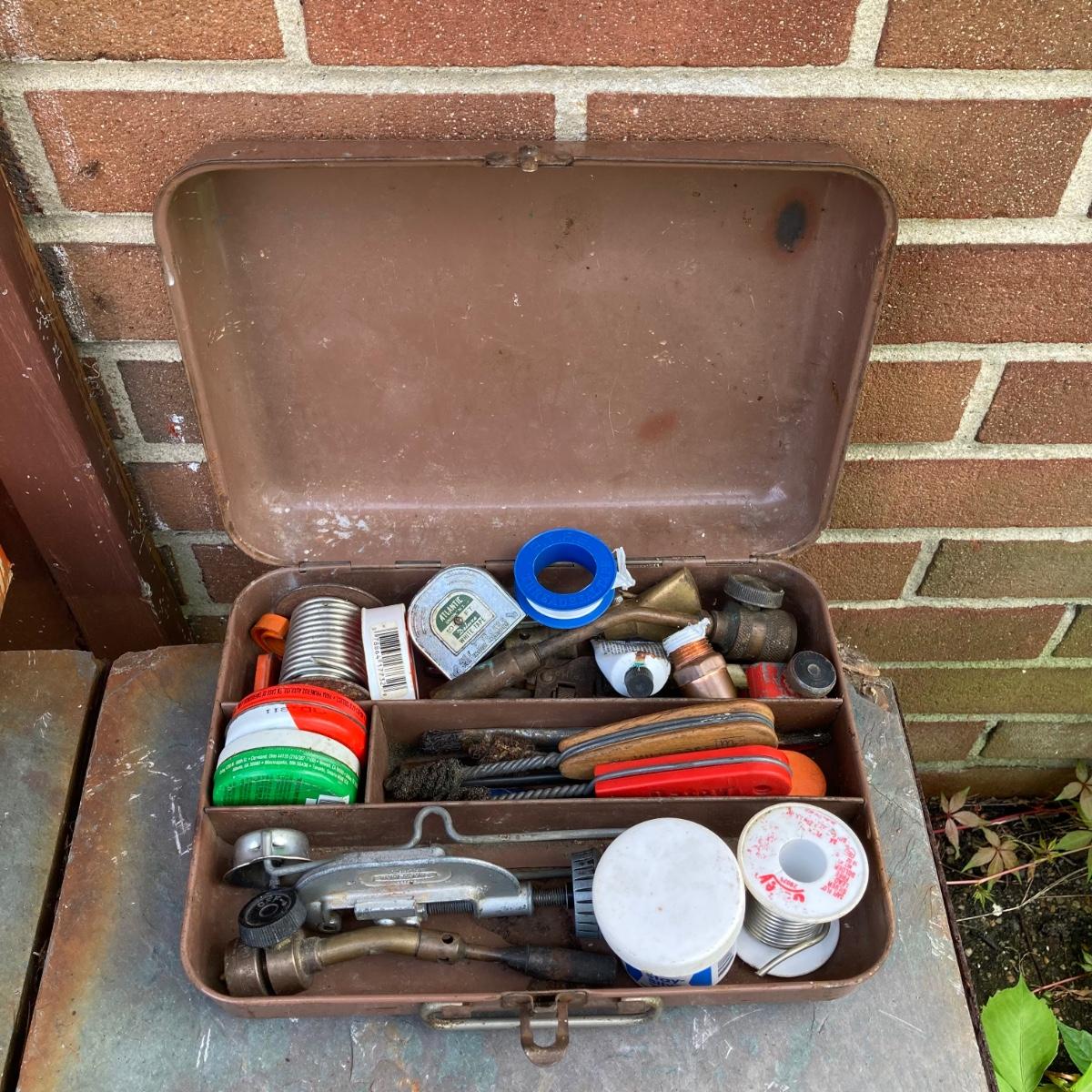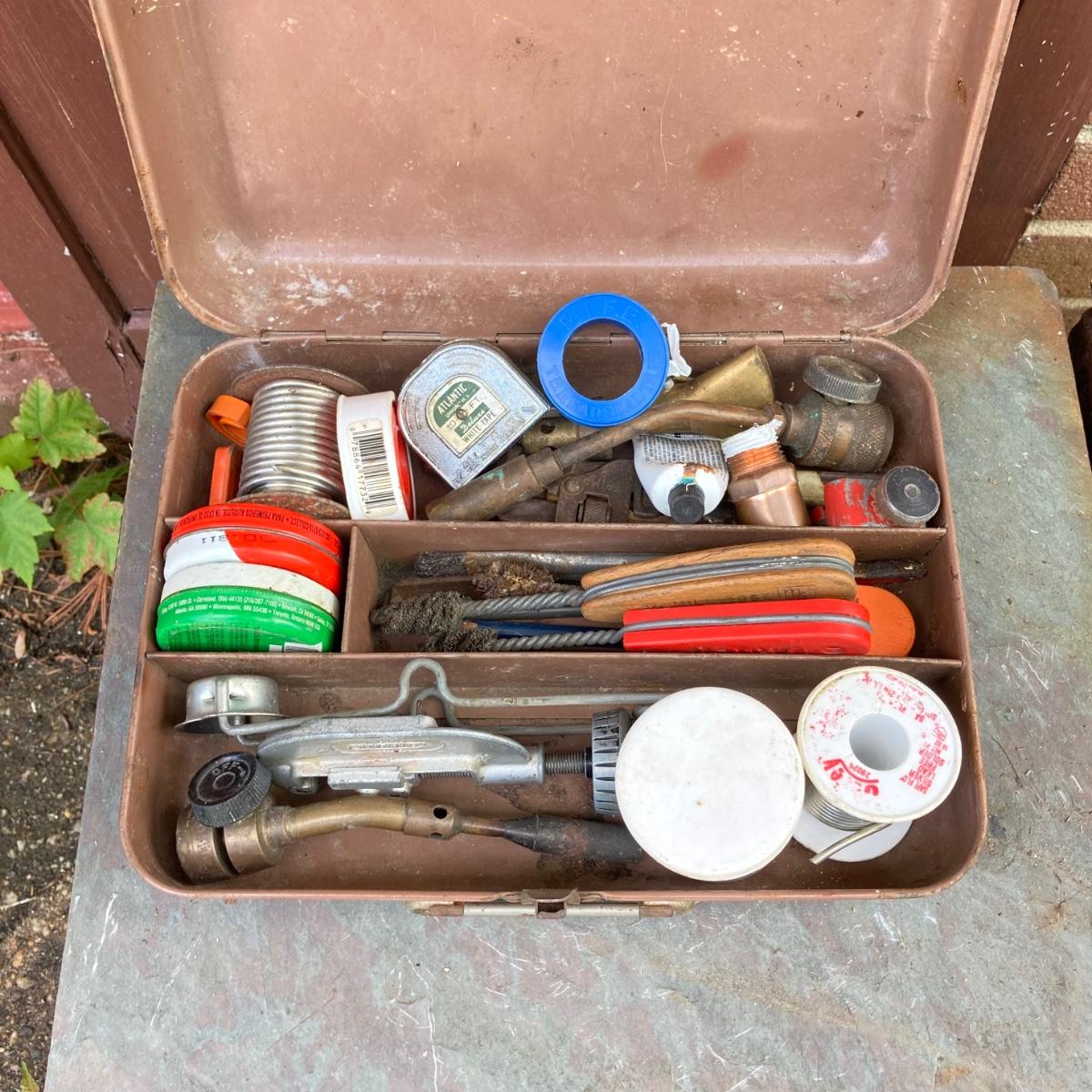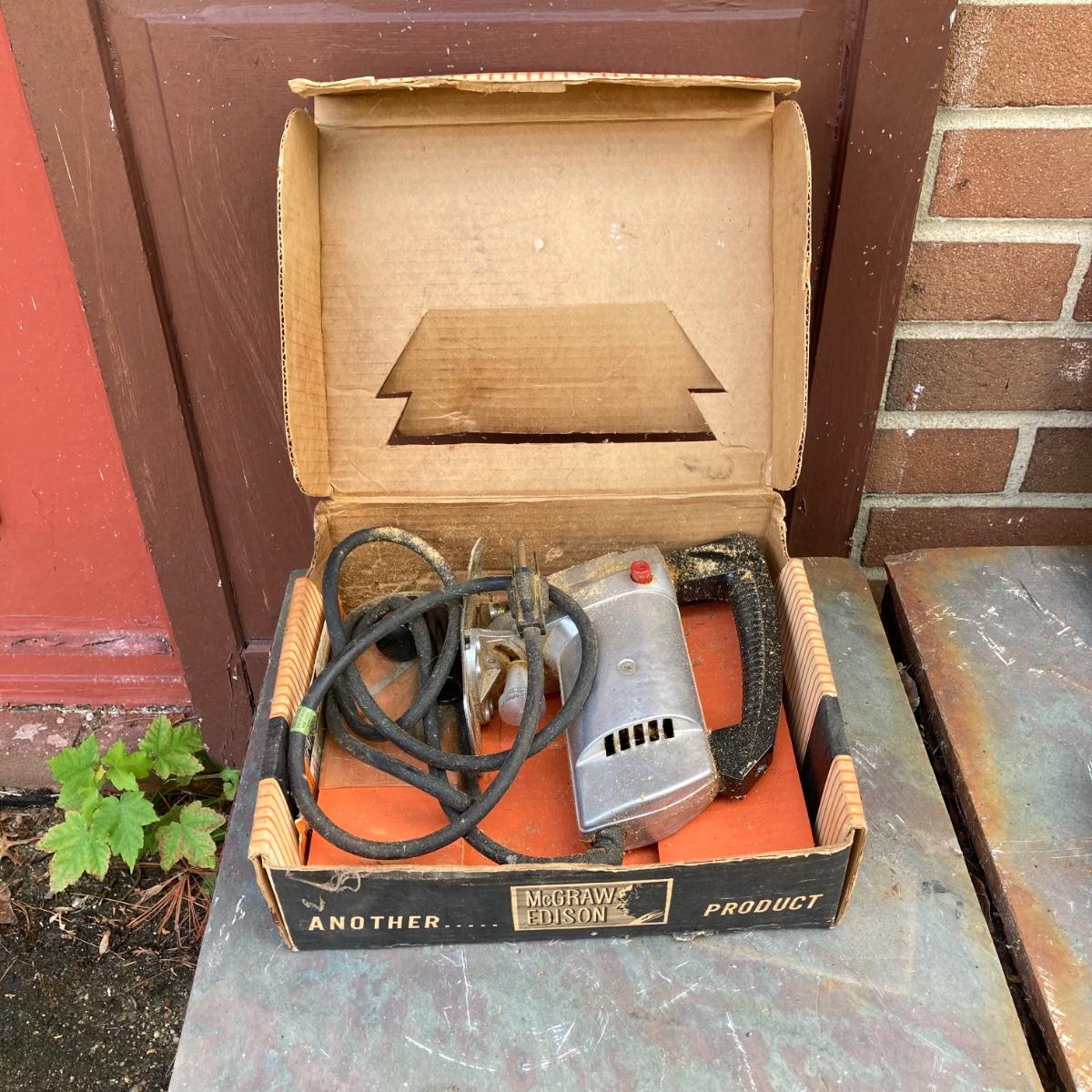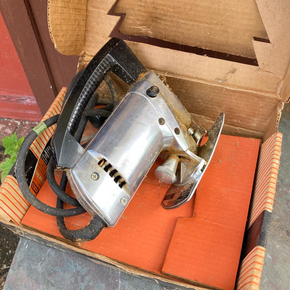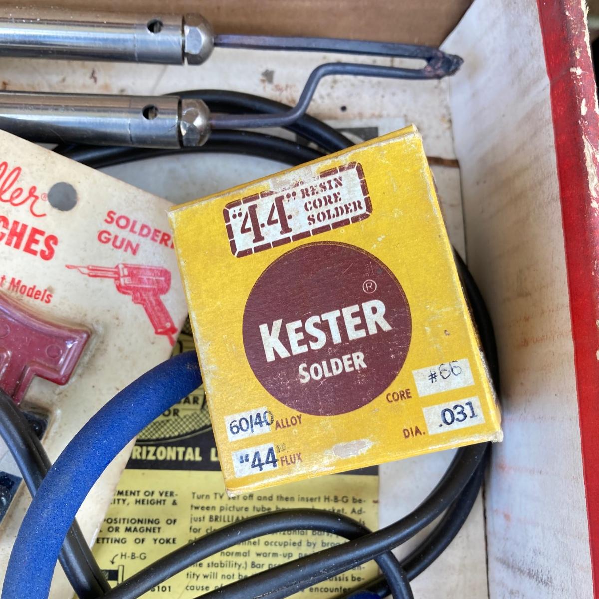 LOT 139G: Vintage Tools - Power House Sabre Jig Saw, Weller Soldering Gun, Soldering Kit, Saw Blades in Wood Storage Box and More
