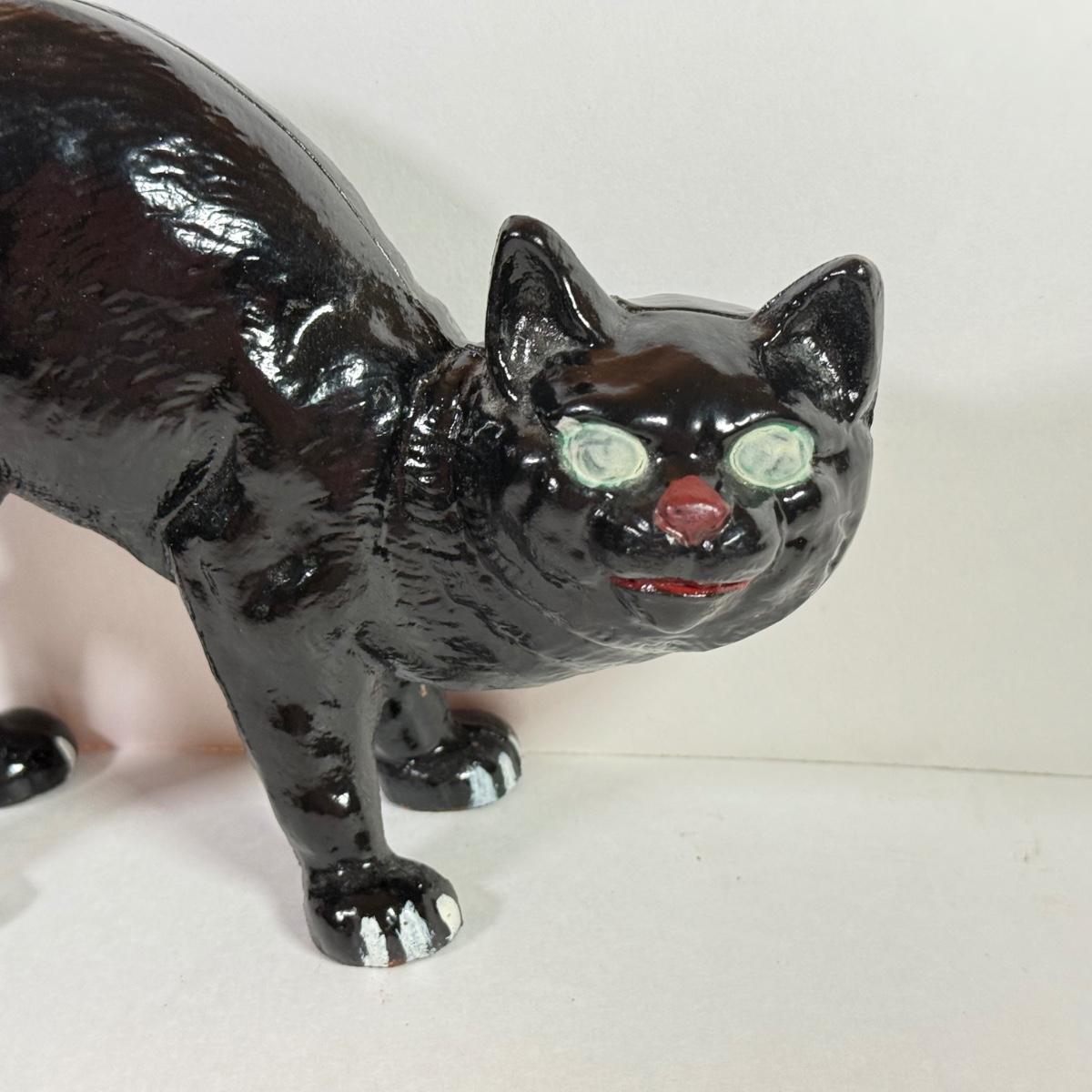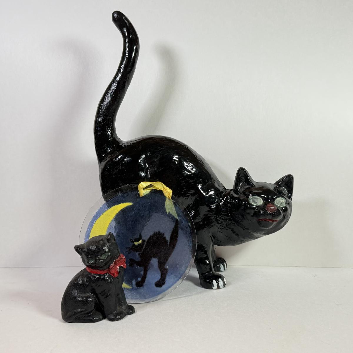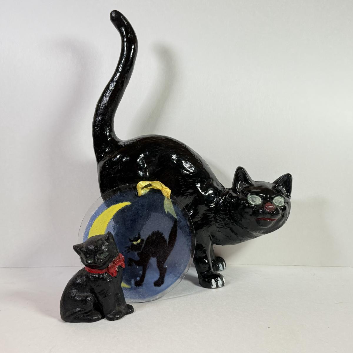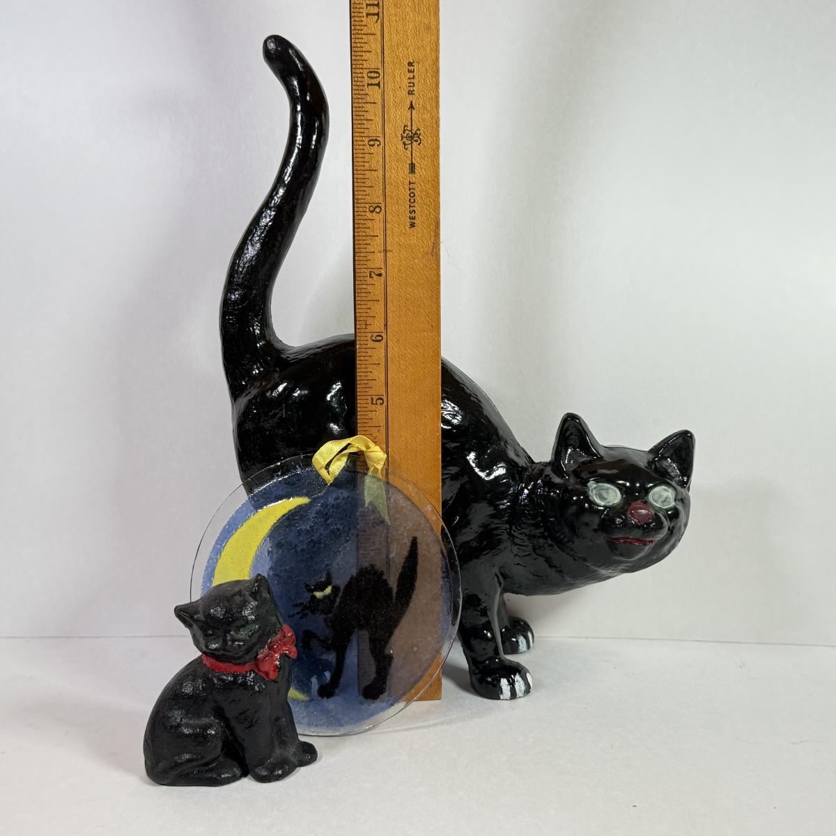 LOT 144L: Vintage Cast Iron Black Cat w/ Small Metal Cat & Glass Cat w/ Moon Disc