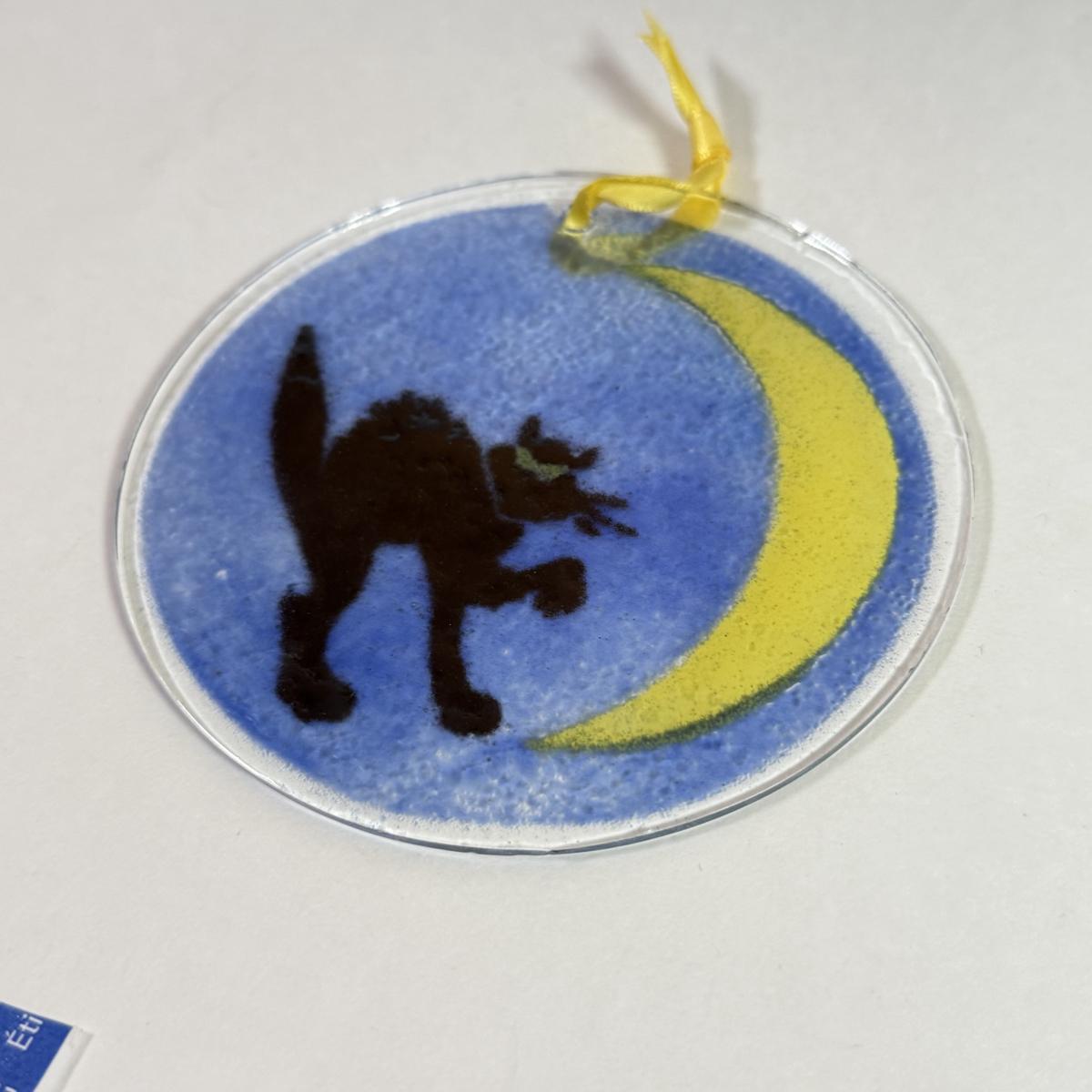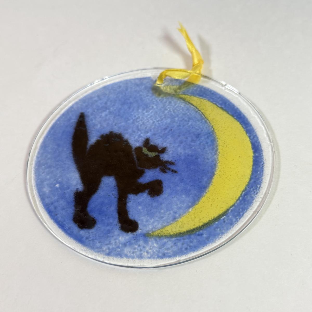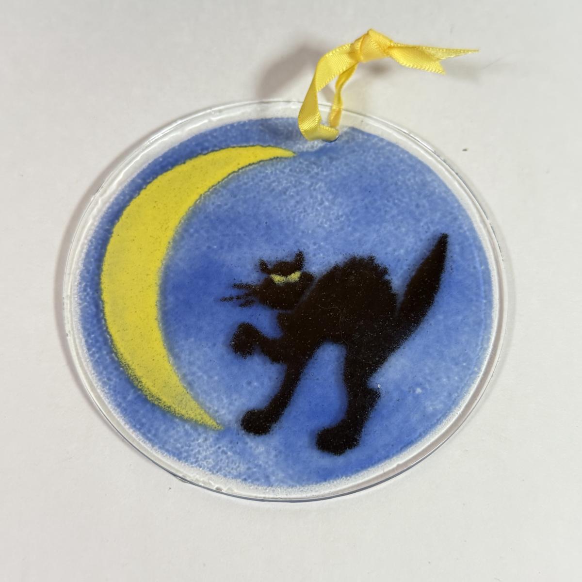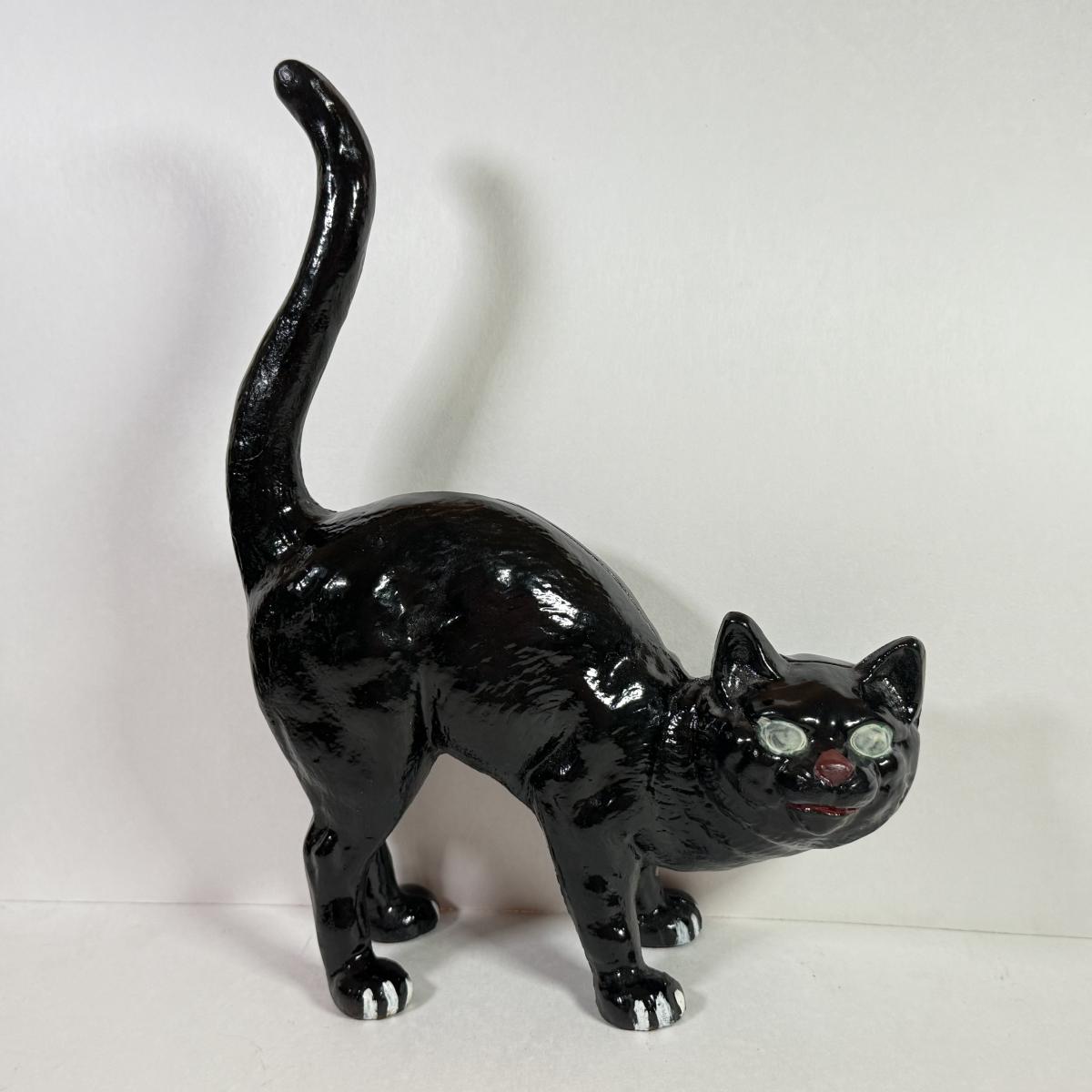 LOT 144L: Vintage Cast Iron Black Cat w/ Small Metal Cat & Glass Cat w/ Moon Disc