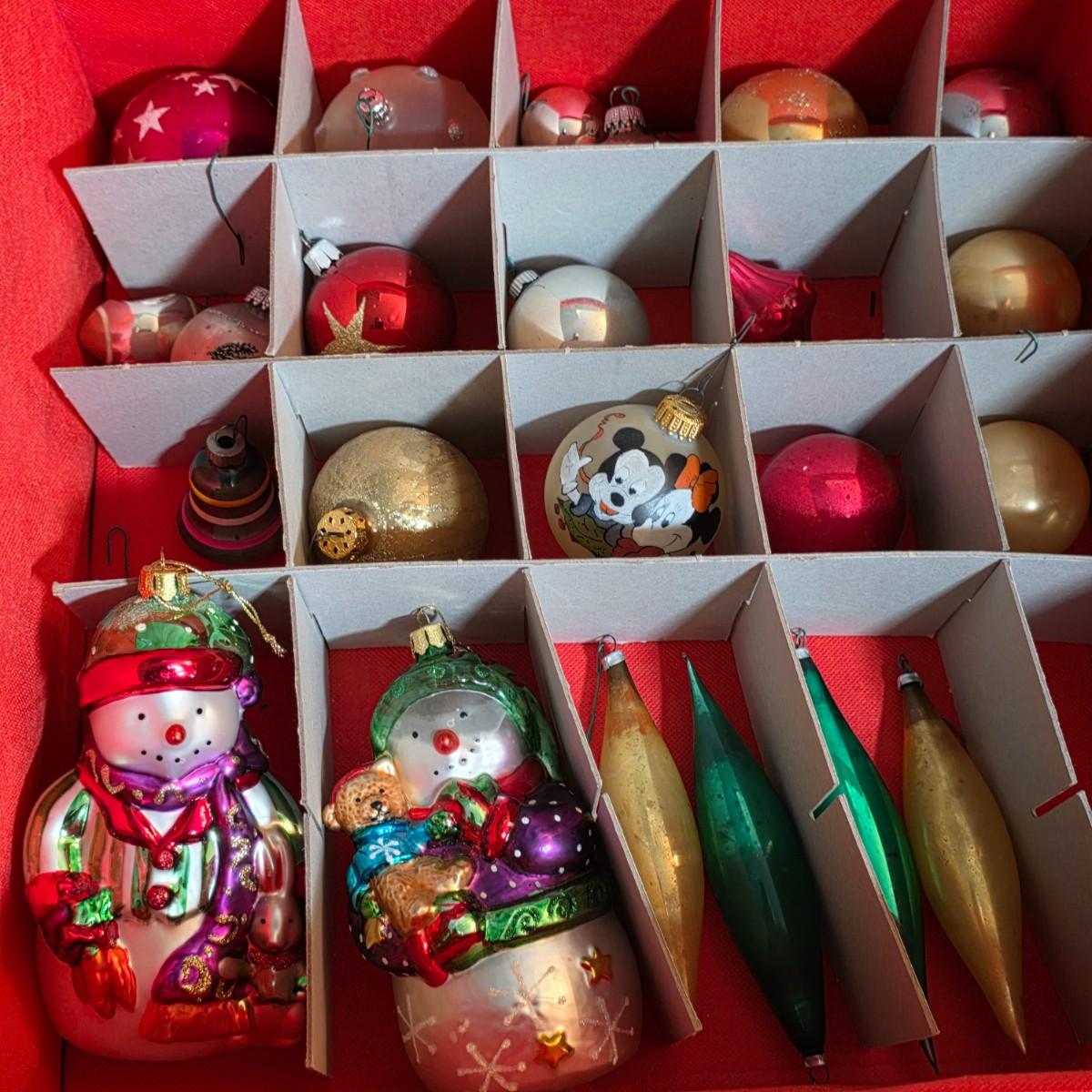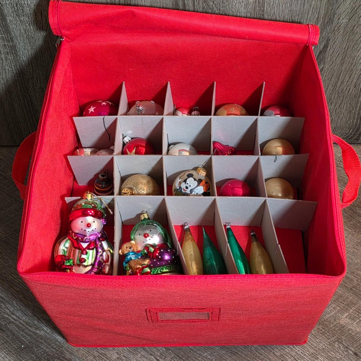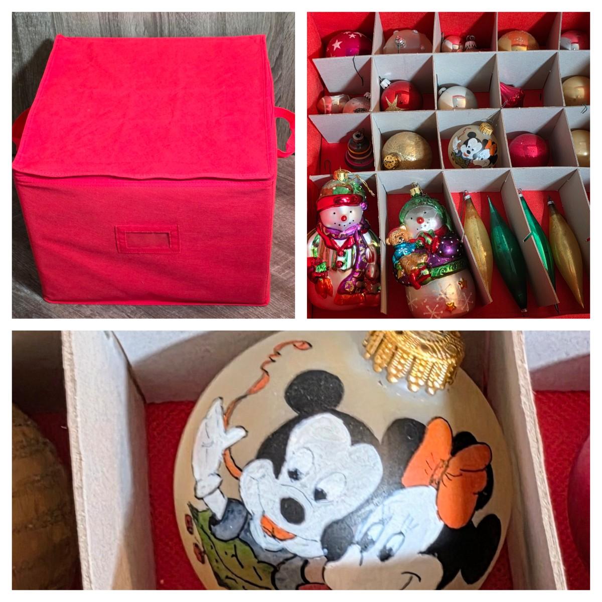 LOT 184D: Christmas Ornament Storage Tote, Filled With Beautiful Ornaments, Including Vintage Mickey/Minnie Christmas Ball