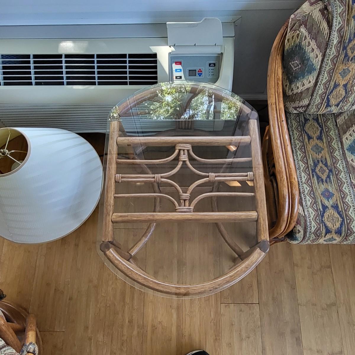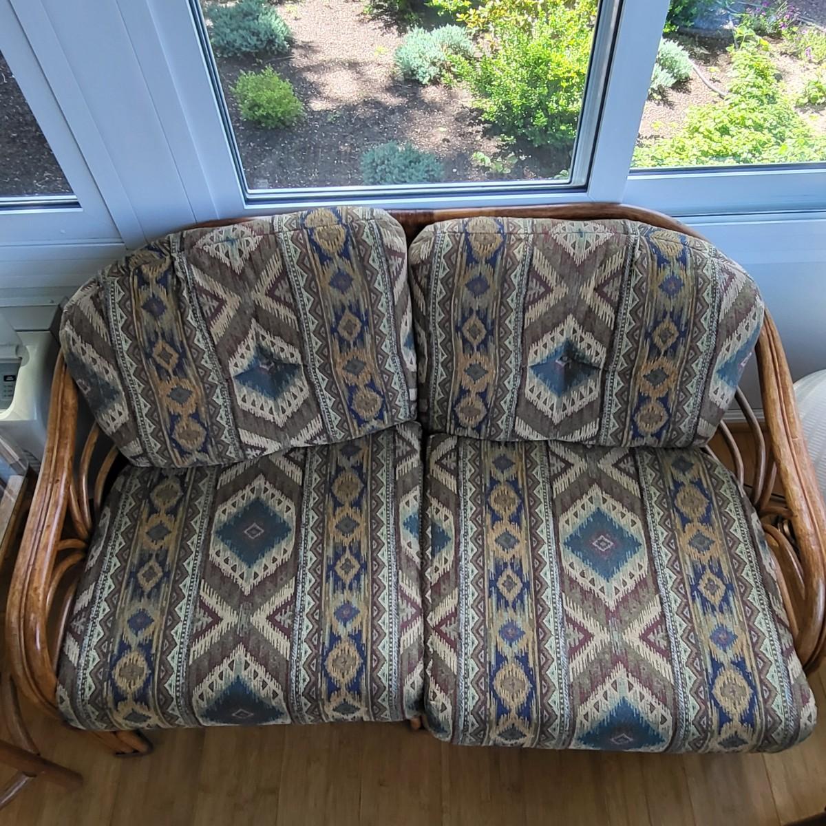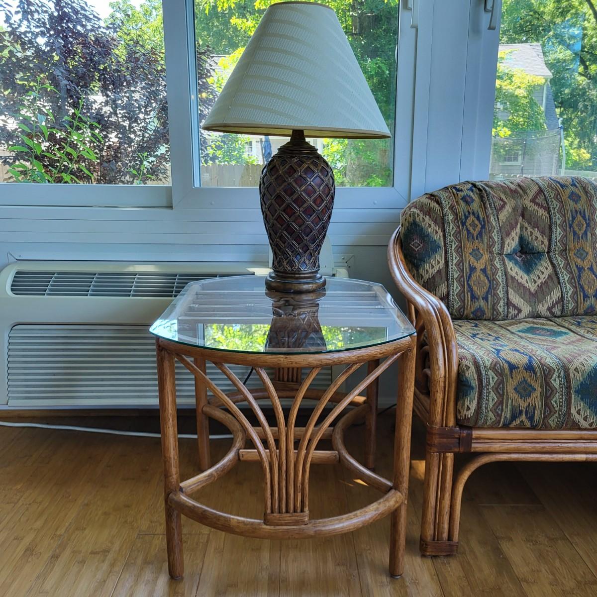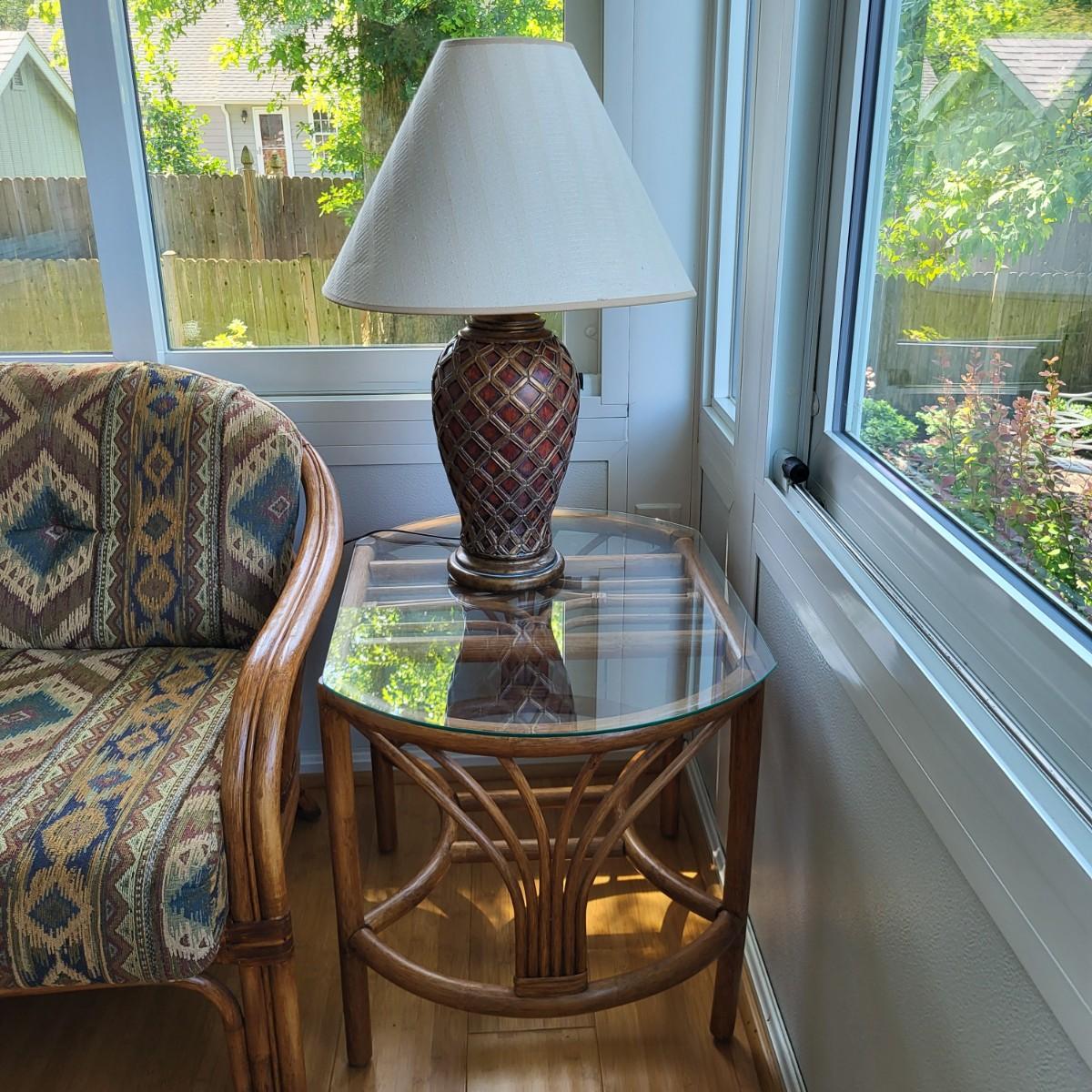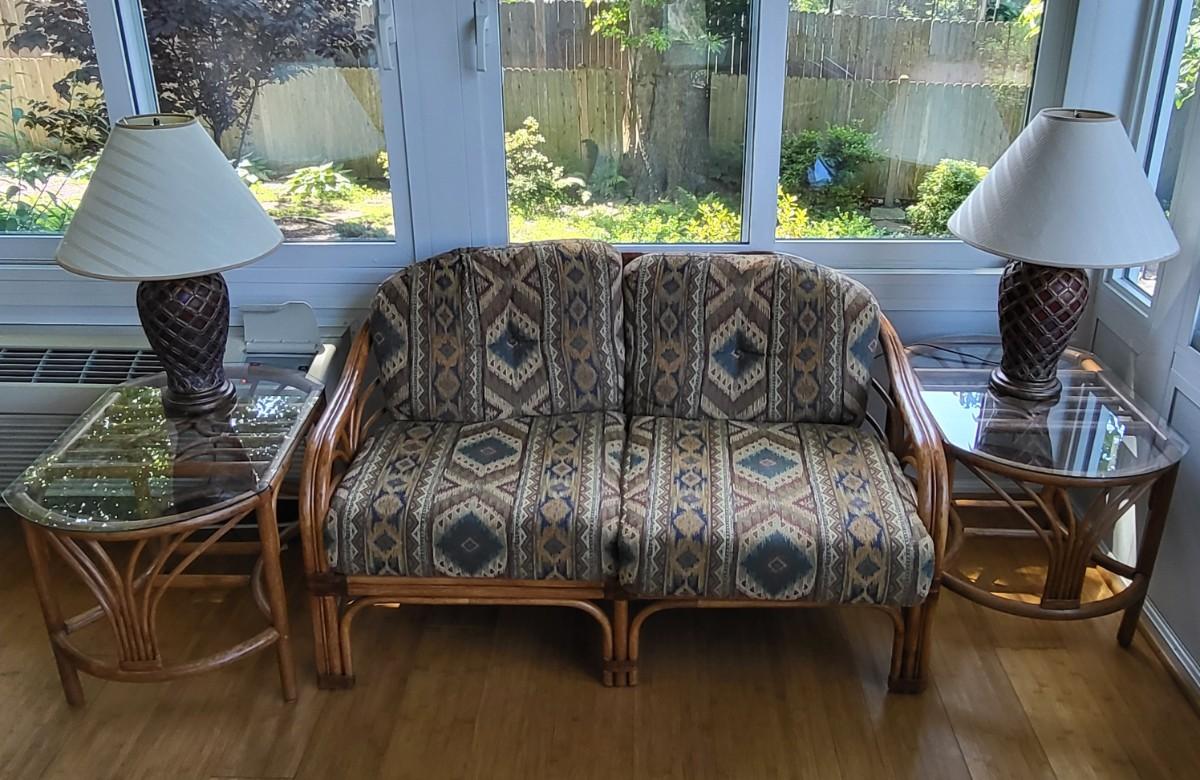 LOT 15P: Porch Cushioned Love Seat with Two Glass End Tables and Two Lamps