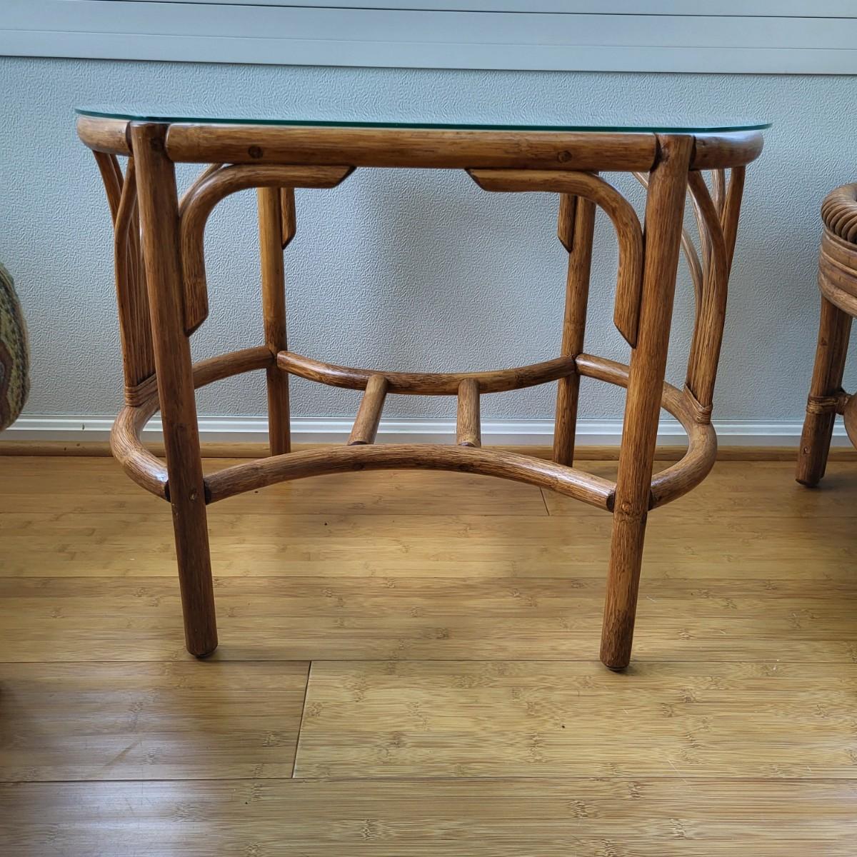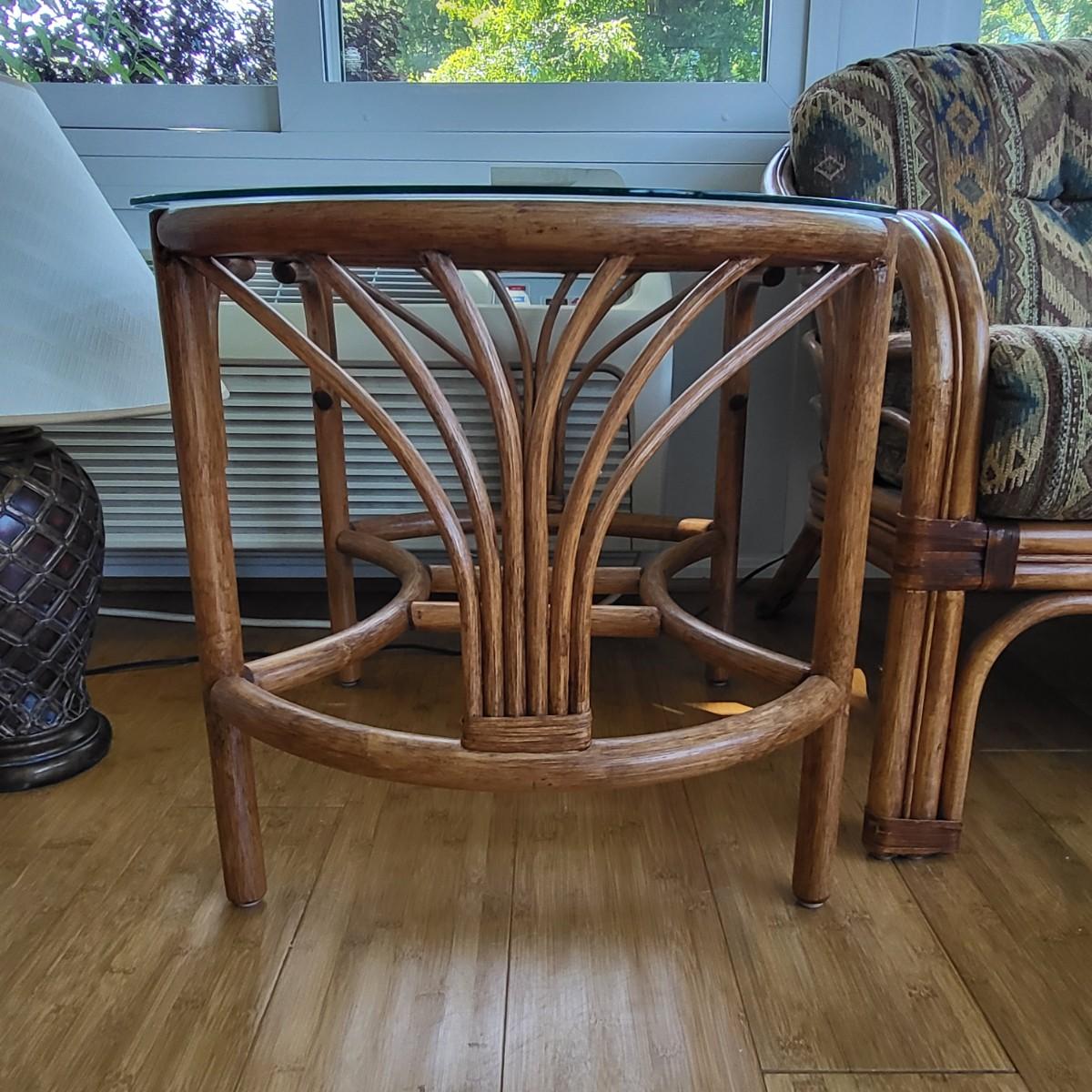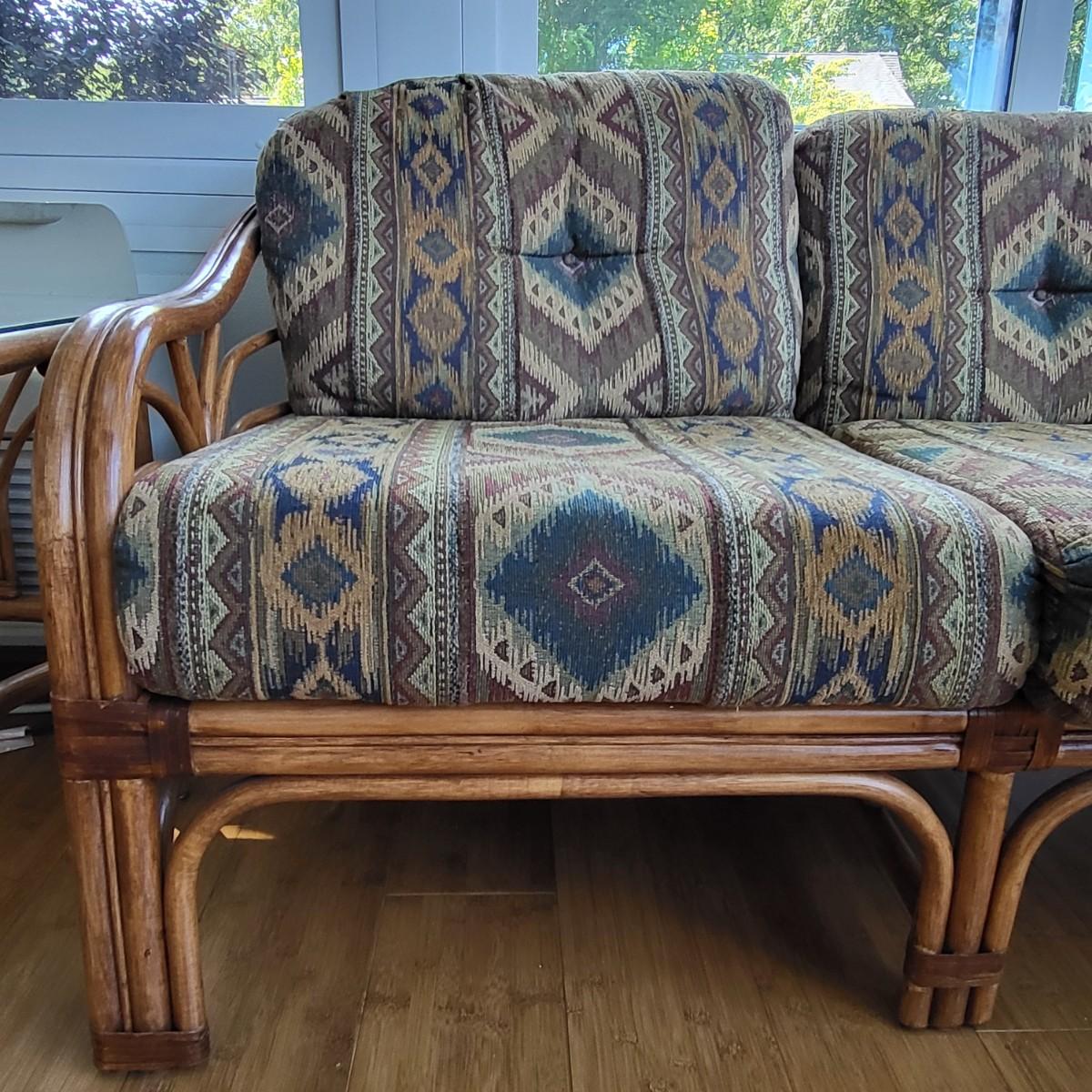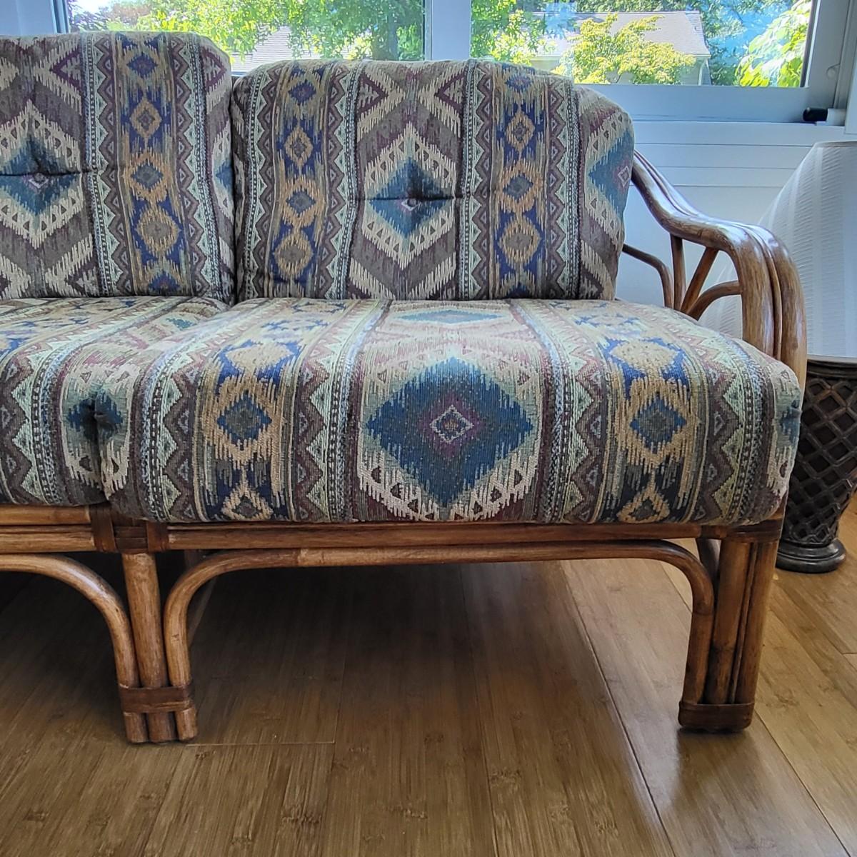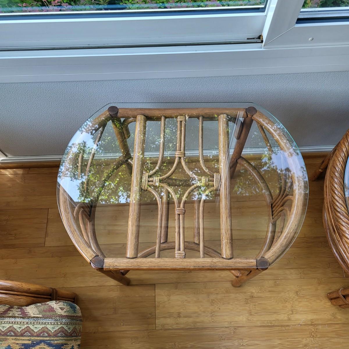 LOT 15P: Porch Cushioned Love Seat with Two Glass End Tables and Two Lamps