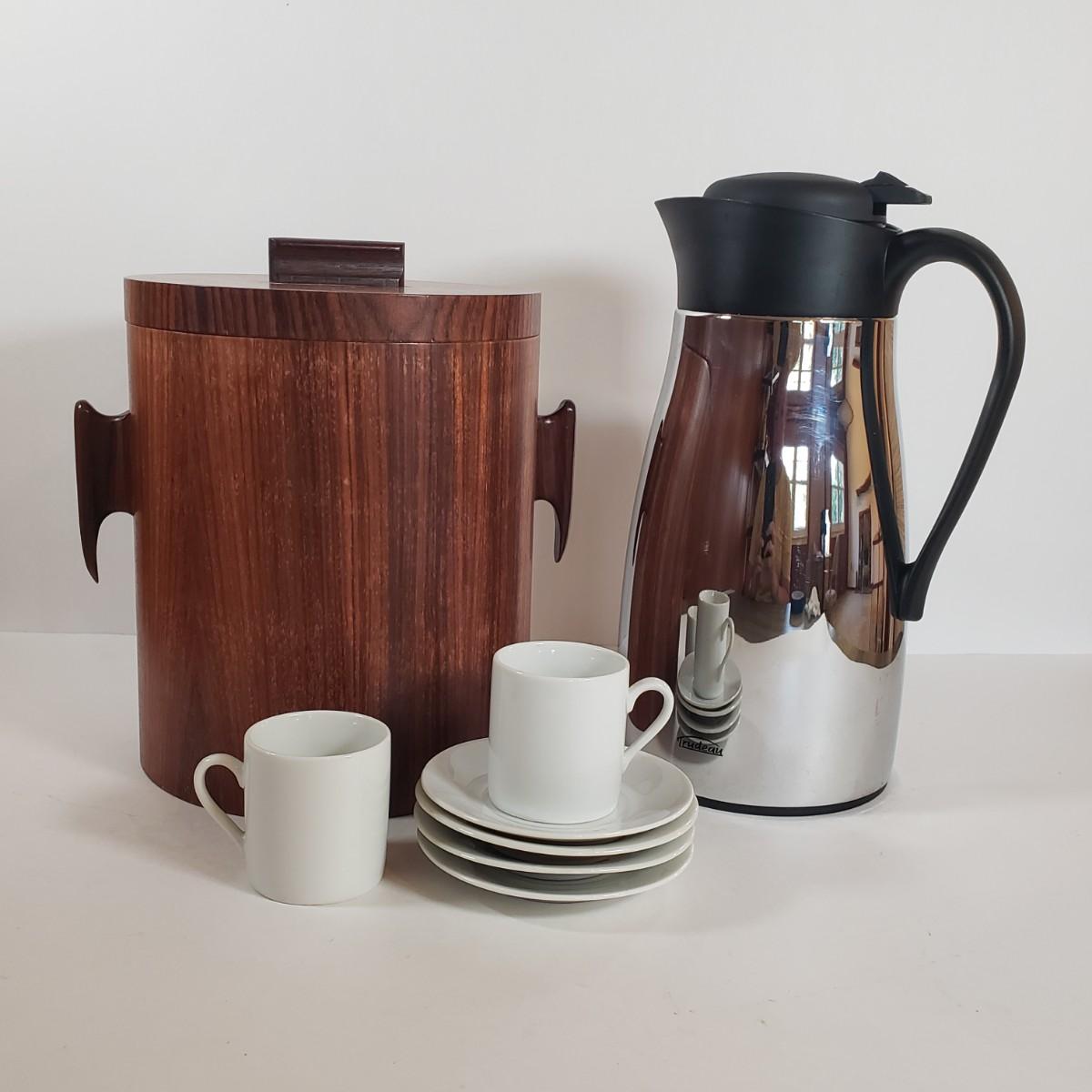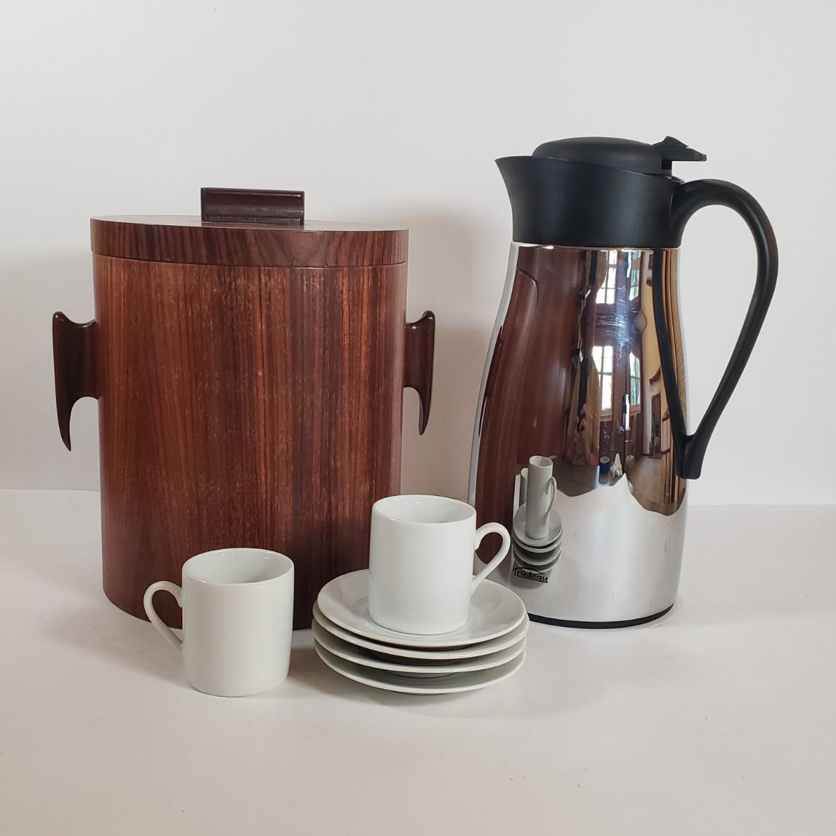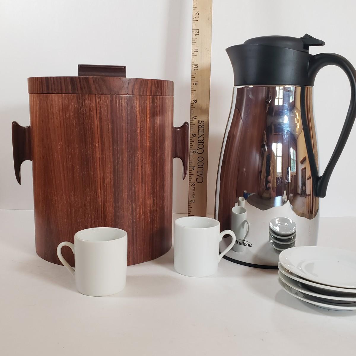 LOT 28F: Vintage Kitchen Host Assortment; MCM Rosewood Ice Bucket, Trudeau Chrome Carafe, Porcelain Espresso Cups