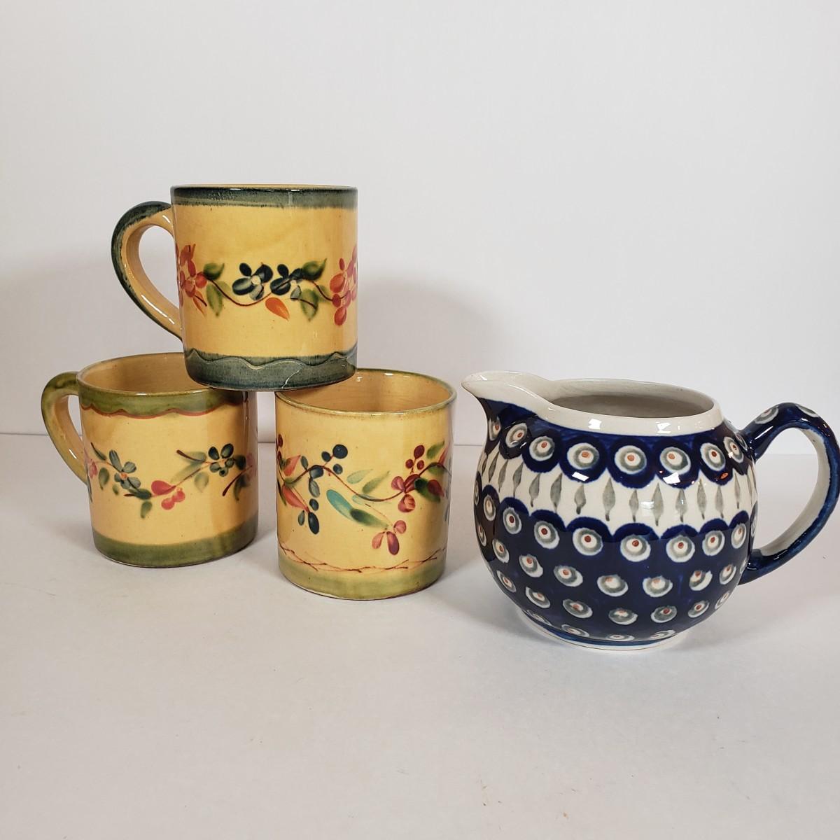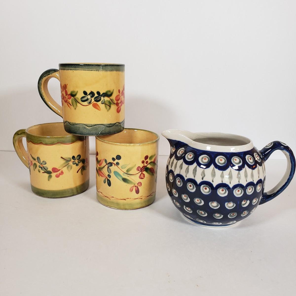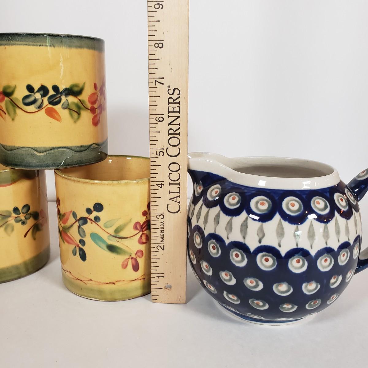 LOT 30F: Polish Pottery Pitcher and Redware Clay Floral Mug Set